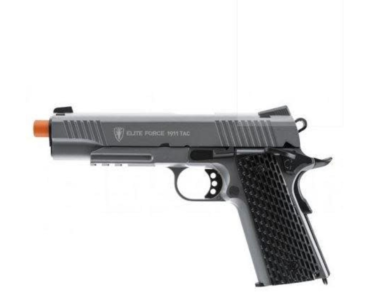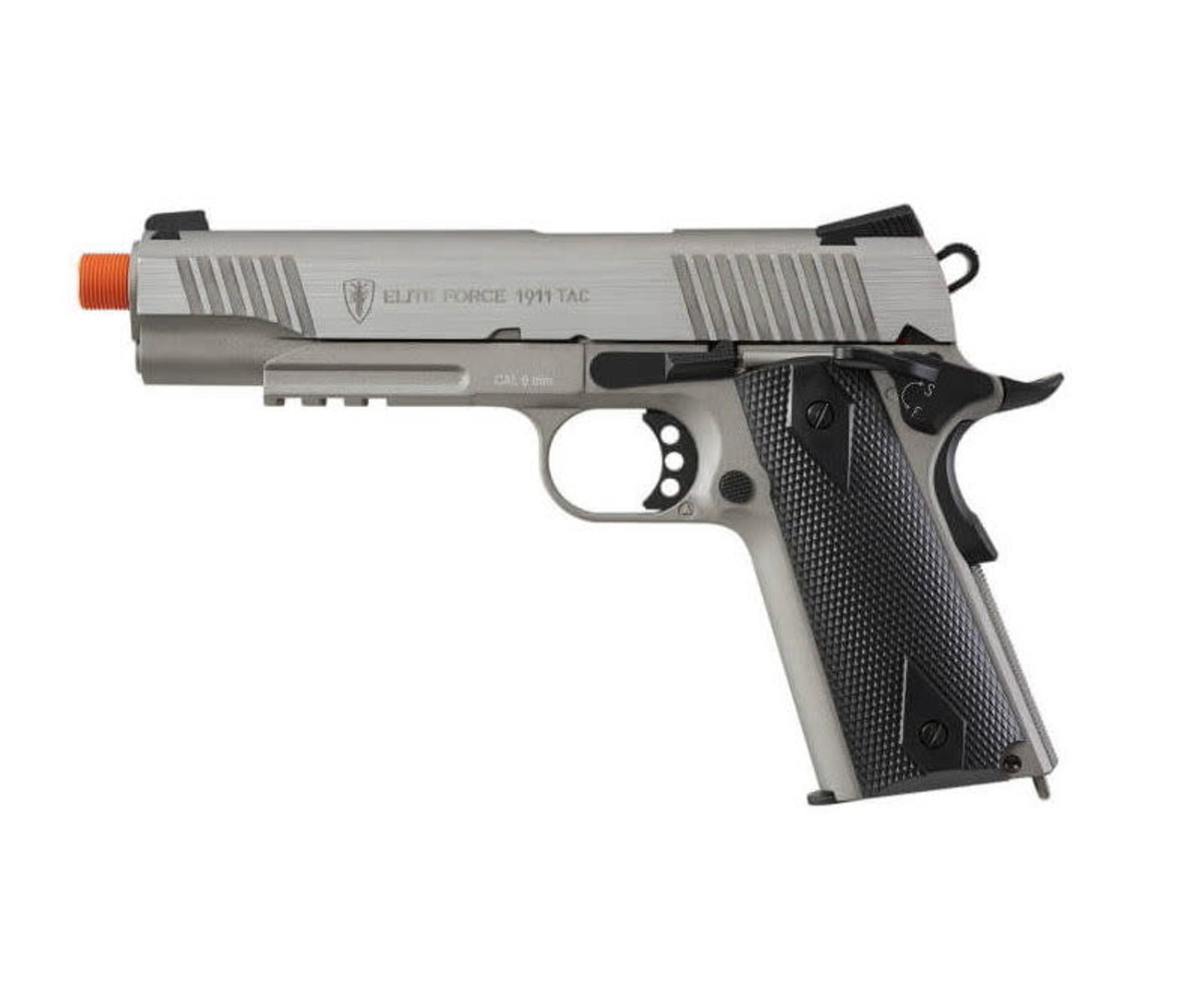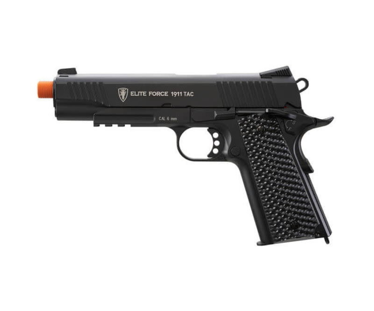 The Elite Force 1911 Tactical has a full metal slide and frame, making the gun very sturdy. It has a grip safety as well as an ambidextrous safety. The Elite Force 1911 Tactical has the Elite Force crest stamped across the slide, as well as iron sights and a beavertail.