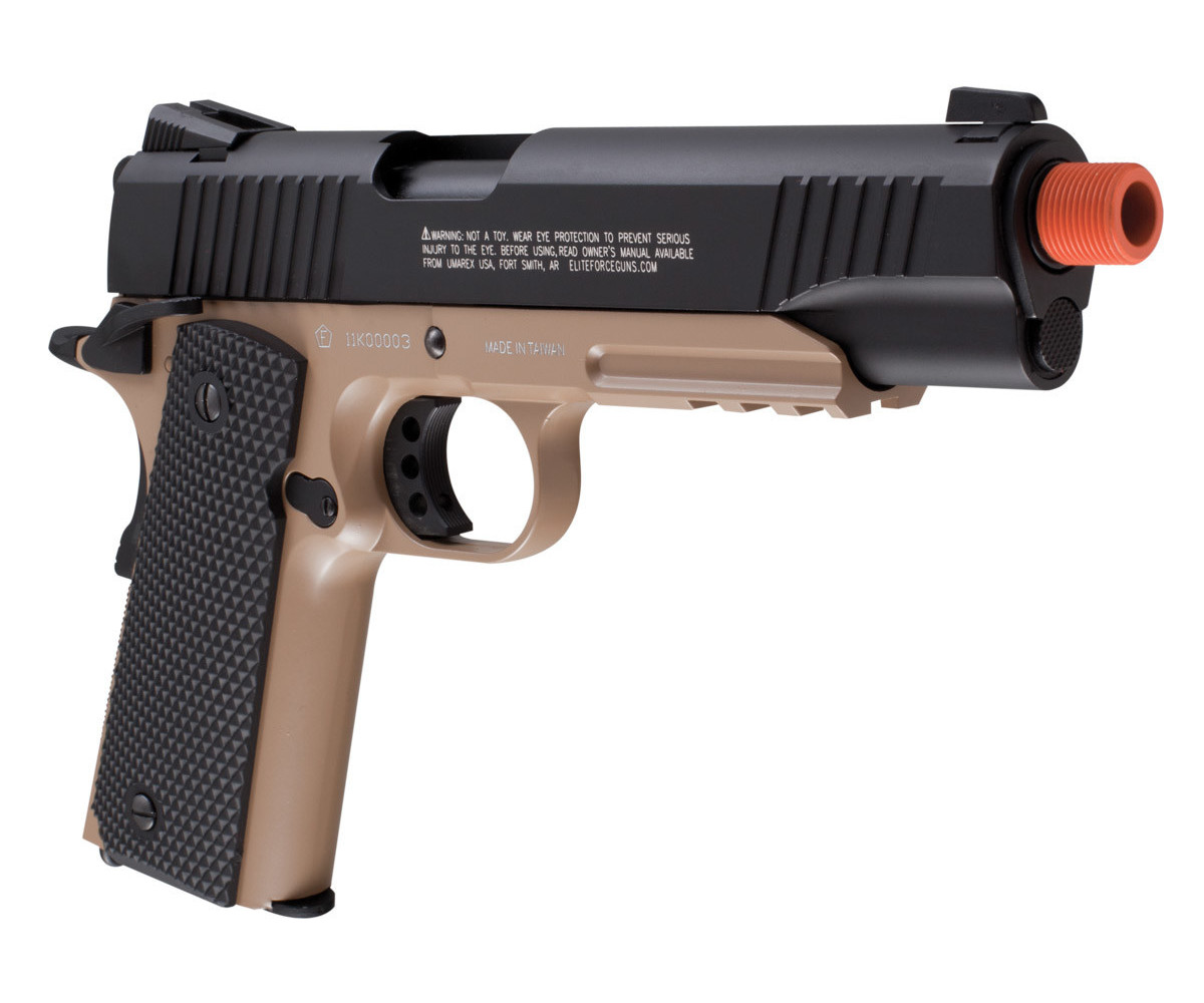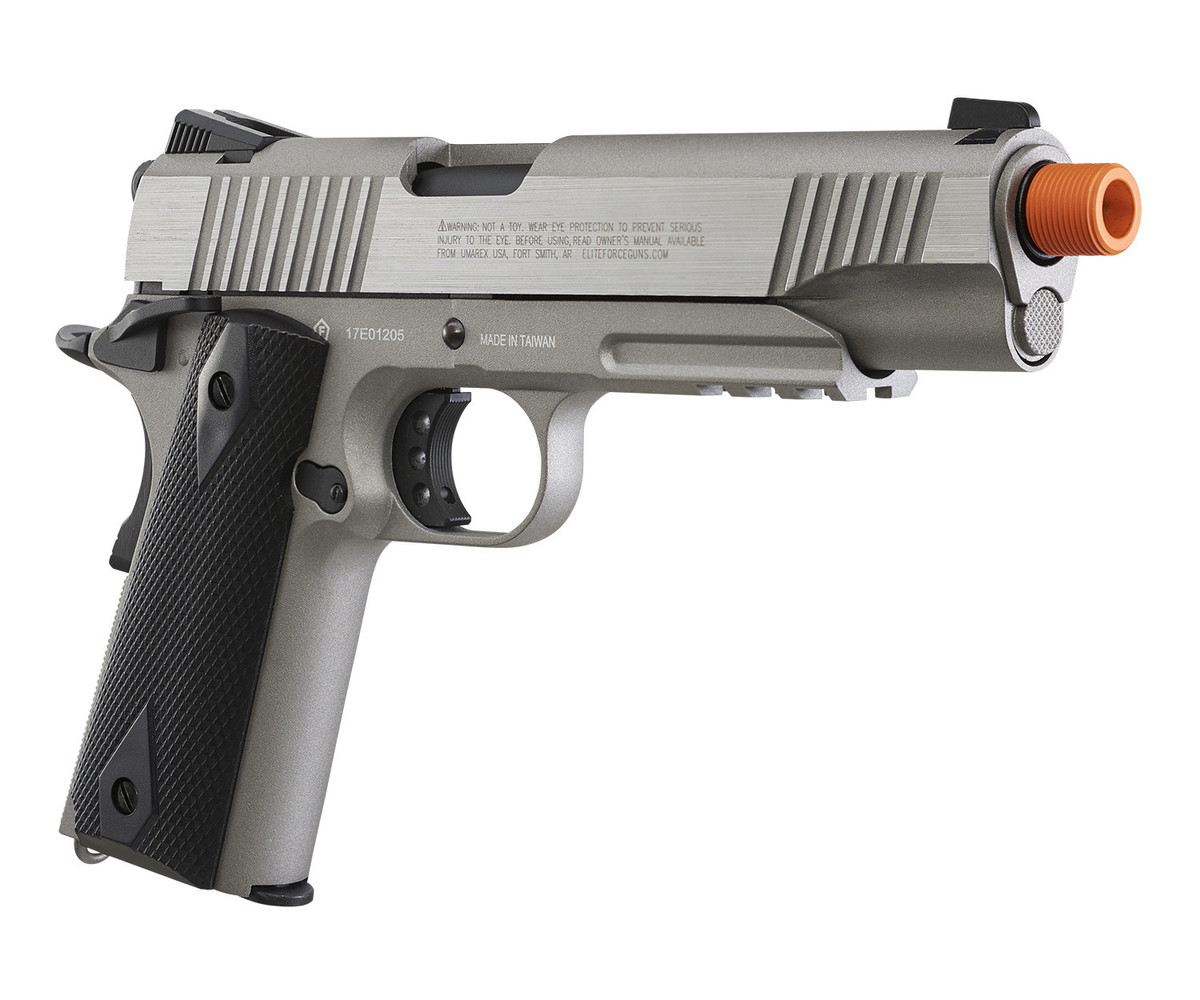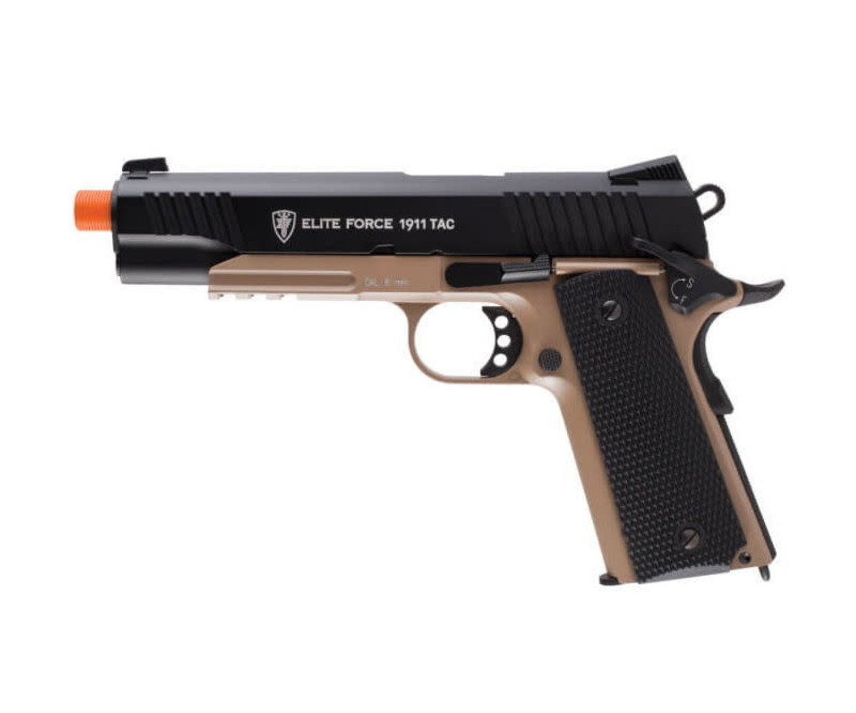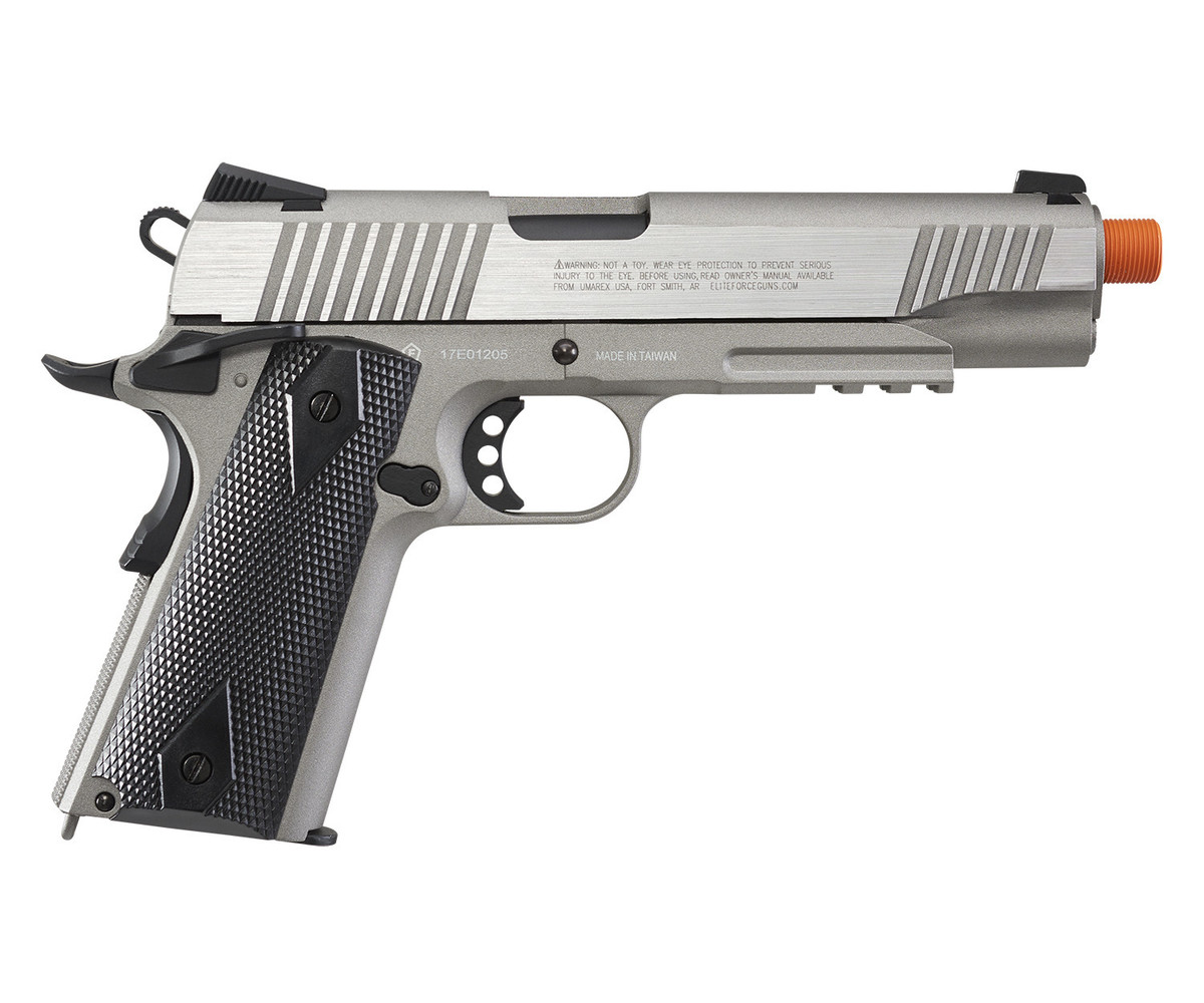 The Elite Force 1911 Tactical comes equipped with a 20mm underside rail for attaching a tactical flashlight or laser. The textured mounted grip plates help keep the gun from sliding out your hands, allowing you to maintain a grip on the pistol. A threaded orange tip is included so you can mount your favorite mock suppressor right out of the box.