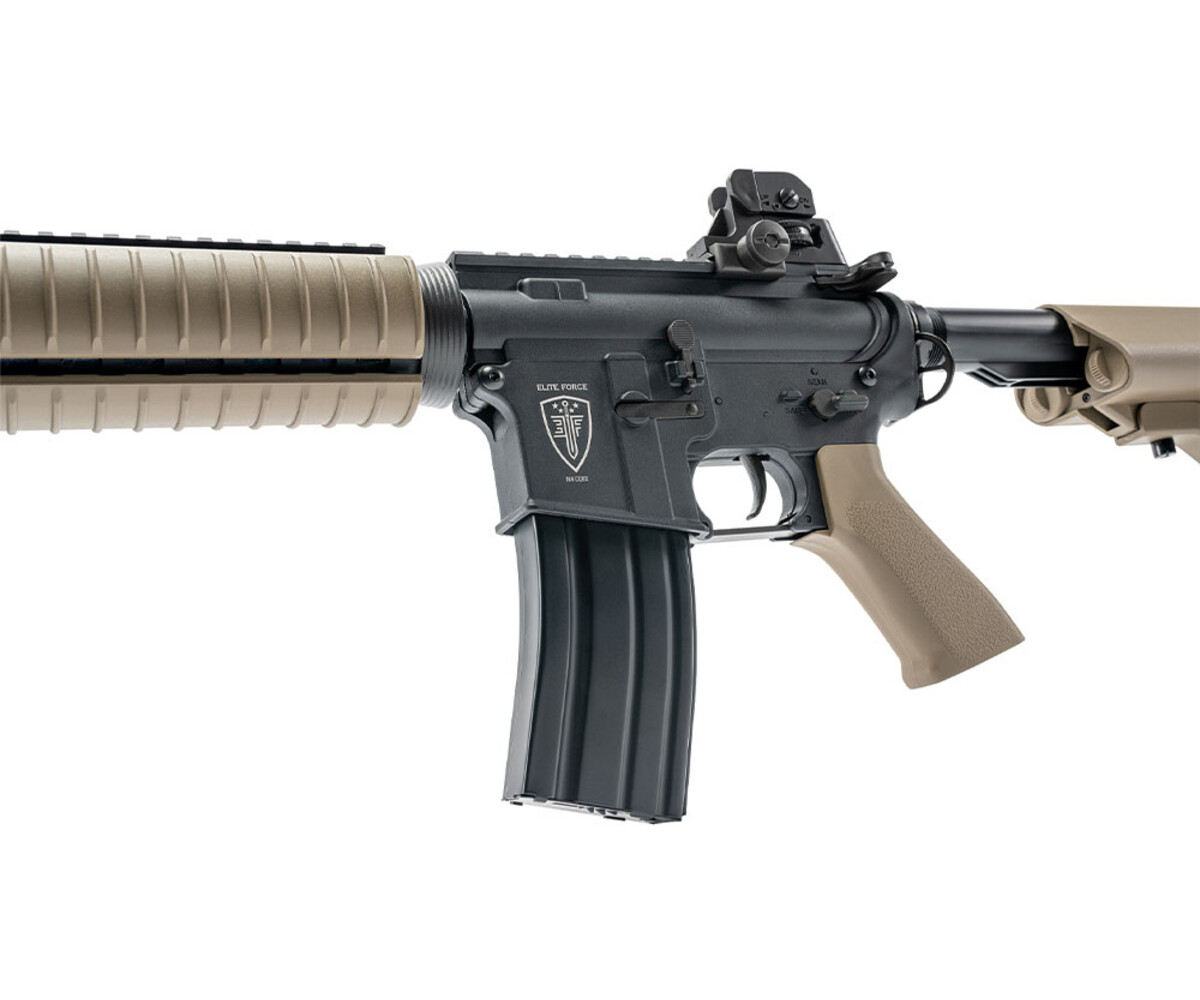 Light up the night with the Elite Force M4 CQB EYETRACE The M4 CQB EYETRACE features a built in smart LED tracer unit to light up tracer BBs. The upper is fitted with a classic quadrail, A2 front sight, and removable rear sight aperture. The stock and grip are desert tan and can house your choice of battery, the juice fed through a state of the art MOSFET and accepts standard M4 style mid-cap and hi-cap magazines.