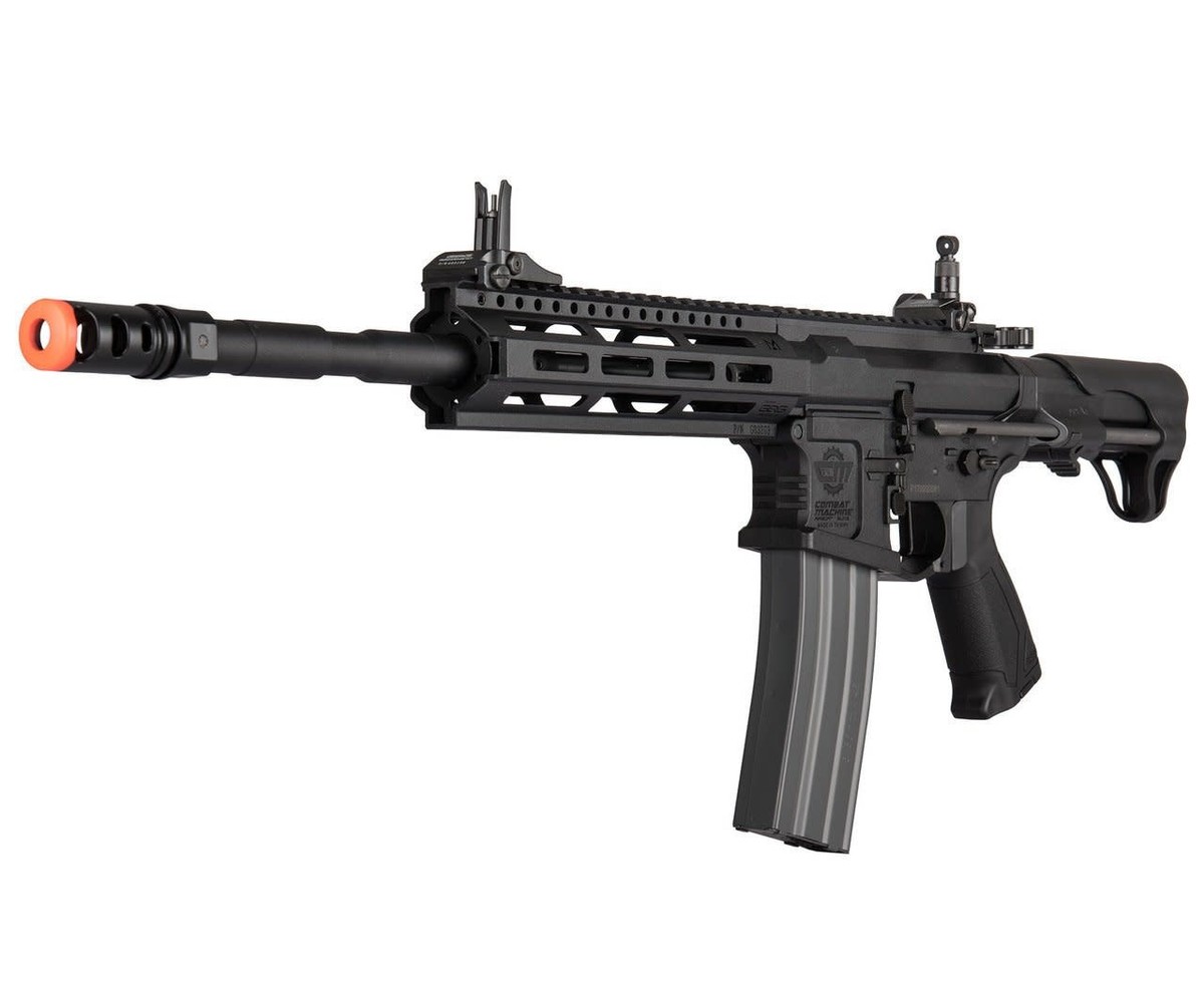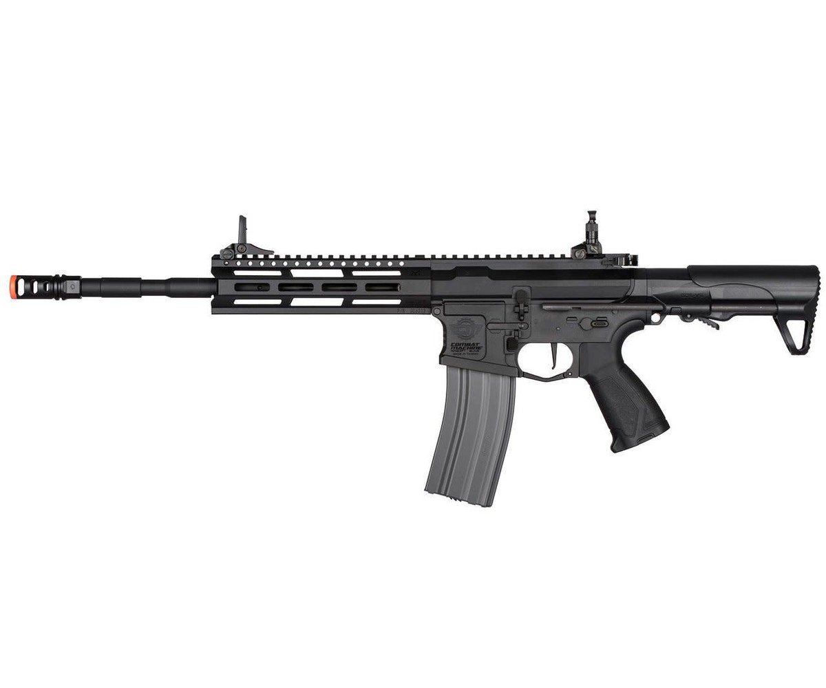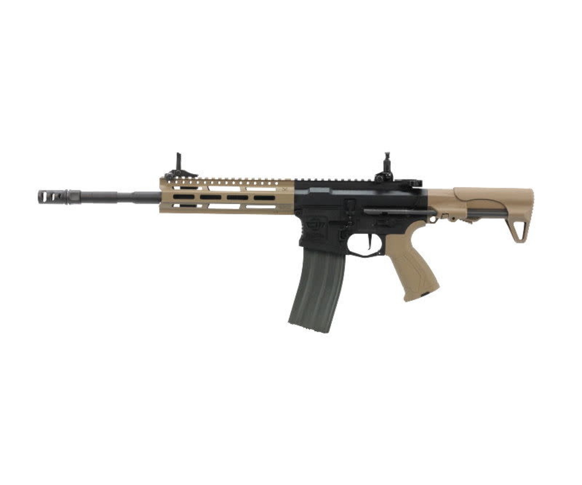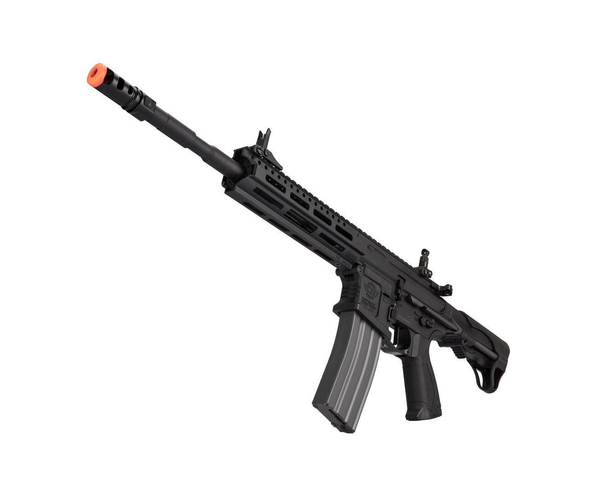 The G&G CM16 Raider L 2.0E AEGi s a combat machine airsoft M4 that features a longer barrel and PDW style rear stock assembly. New design and configuration featuring M-LOK rail systems, full metal gearbox, high-quality polymer outer body, and many more useful features.