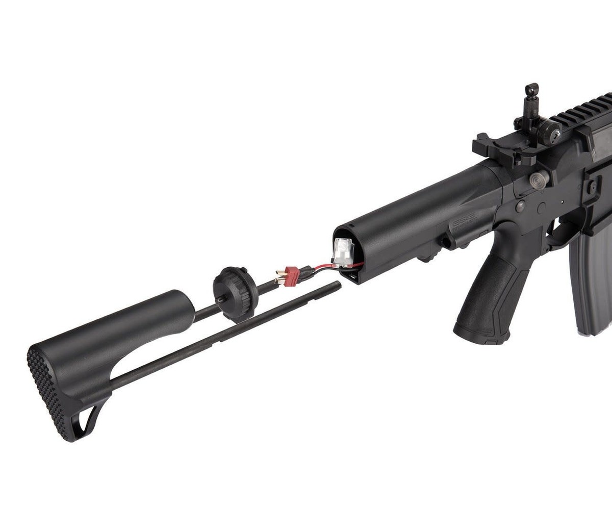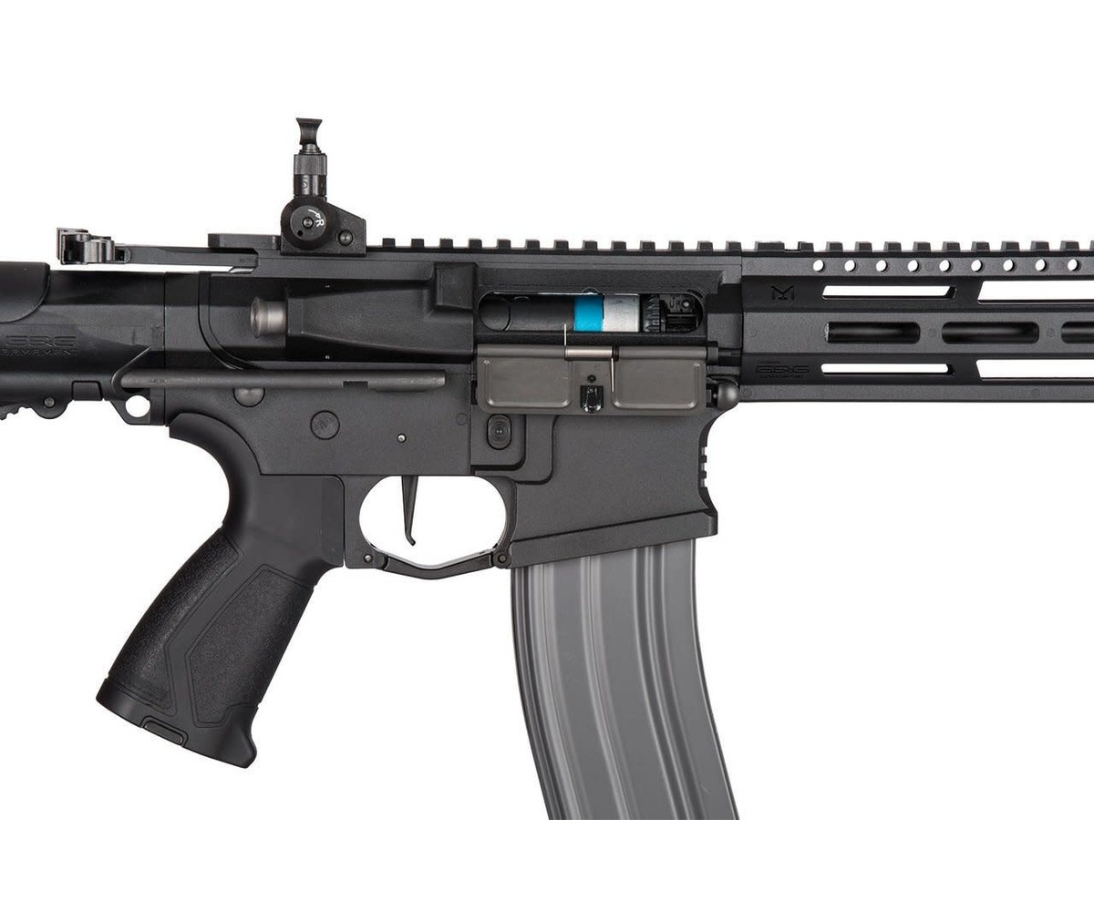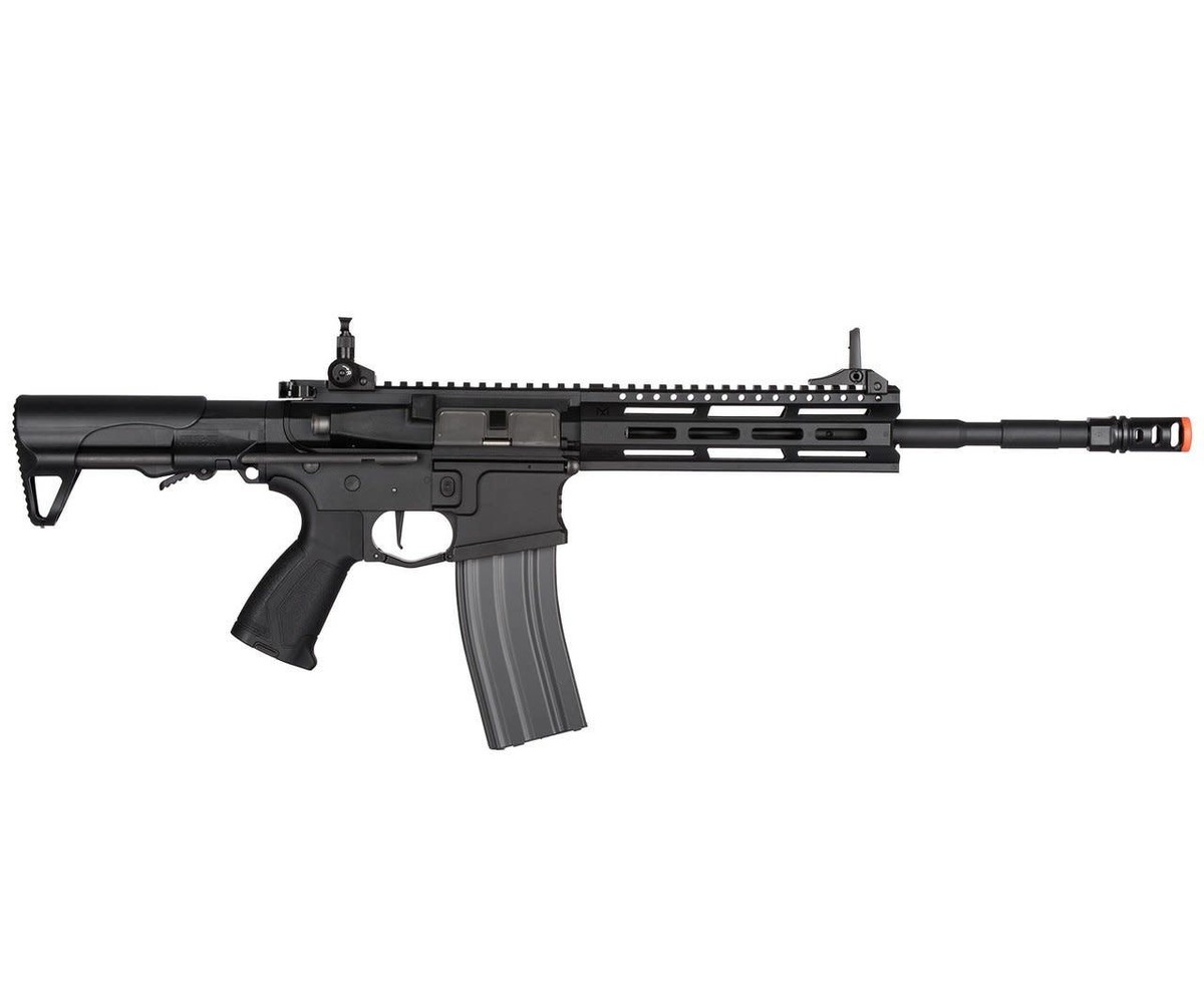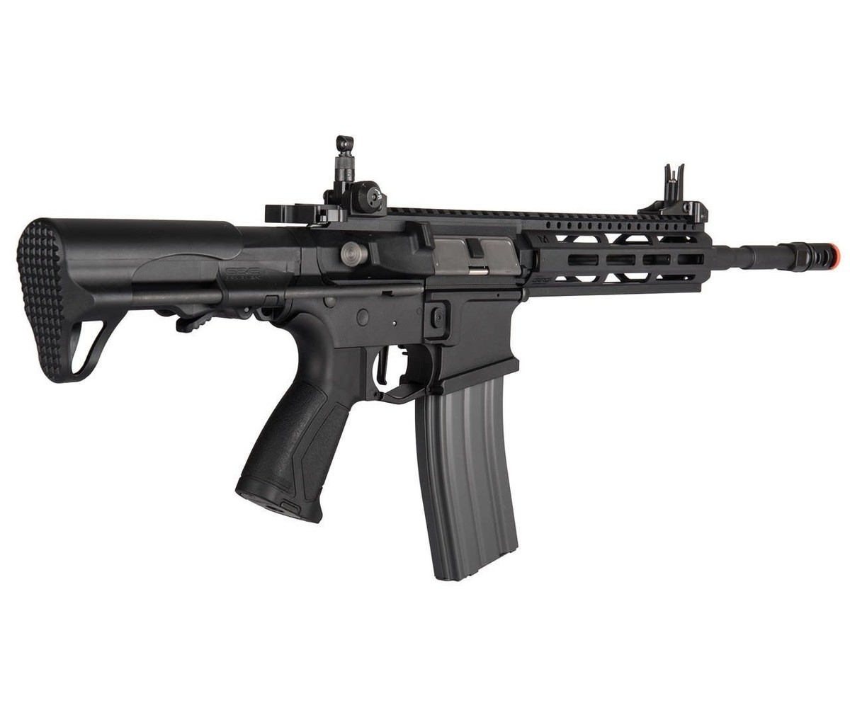 Don't worry about getting stuck on the battlefield with no ammo, as this rifle comes with a 450 round mag ensuring you have the means to take out any and all targets. Detachable front and flip-up rear sights, and adjustable hop-up allow you to adjust accordingly for precision in any situation. Similar to other popular polymer M4 rifles, the 8-inch M-LOK handguard allows you to customize the position of the included accessory rail segments.
