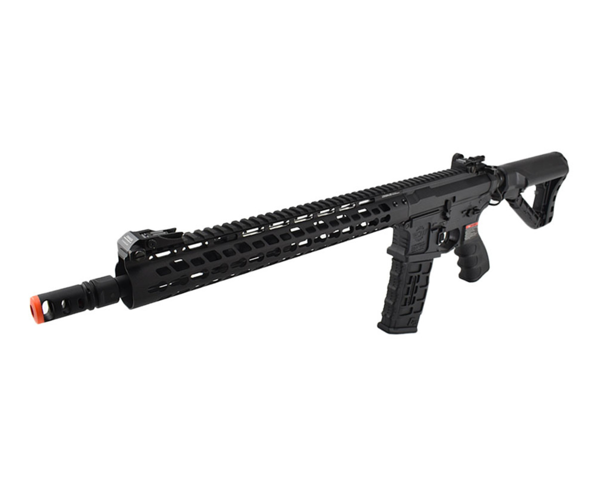 Scare your opponents and let them hear the roar of the G&G Combat Machine CM16 Wild Hog. The airsoft gun has G&G's latest internals for the best set up for a affordable budget. The body of the airsoft gun is made of lightweight polymer for a durable build. Another great feature of the airsoft gun is its left hand friendly capability with the ambidextrous charging handle, rear sling mount and magazine release. The ergonomic six position crane stock holds the battery compartment and has a new design rubber pad for extra comfort on shouldering the airsoft gun. Let your opponents be scared of the increased noise from the amplifier flash hider. Additionally, the Wild Hog features a full metal keymod rail system that is known for its light weight compared to most rail systems.