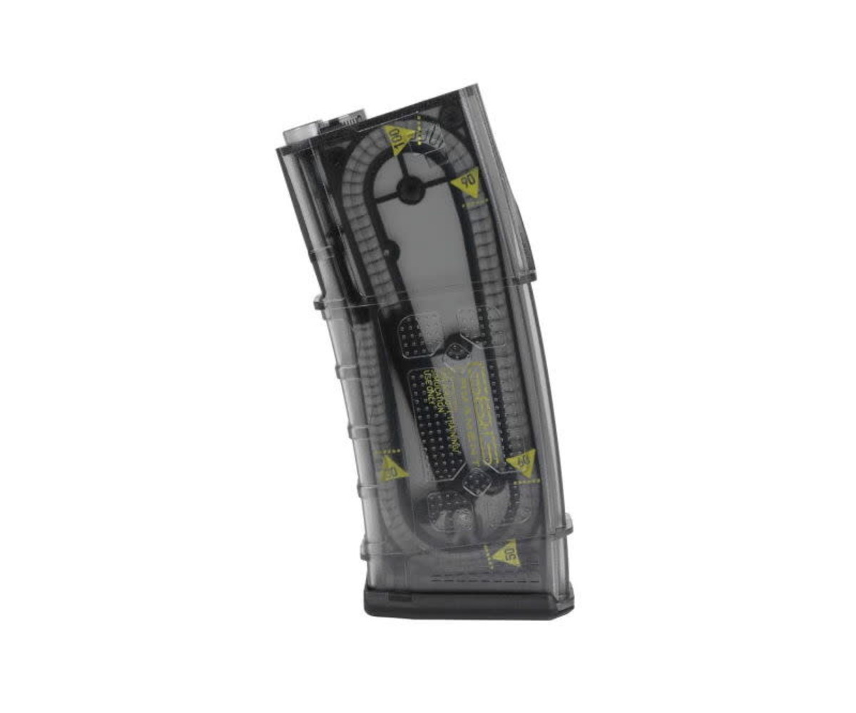 Looking for a new magazine for your M4 or M16 style AEG? Want to make it easy to check your ammo at a mere glance? Then check out the G&G M4 / M16 105rd Polymer Magazine with Counting Marks. This transparent magazine features bright yellow counting marks, allowing easy ammo checks at a glance. Plus, the extended follower helps ensure every last one of the 105 BBs you can put in this magazine gets shot.
