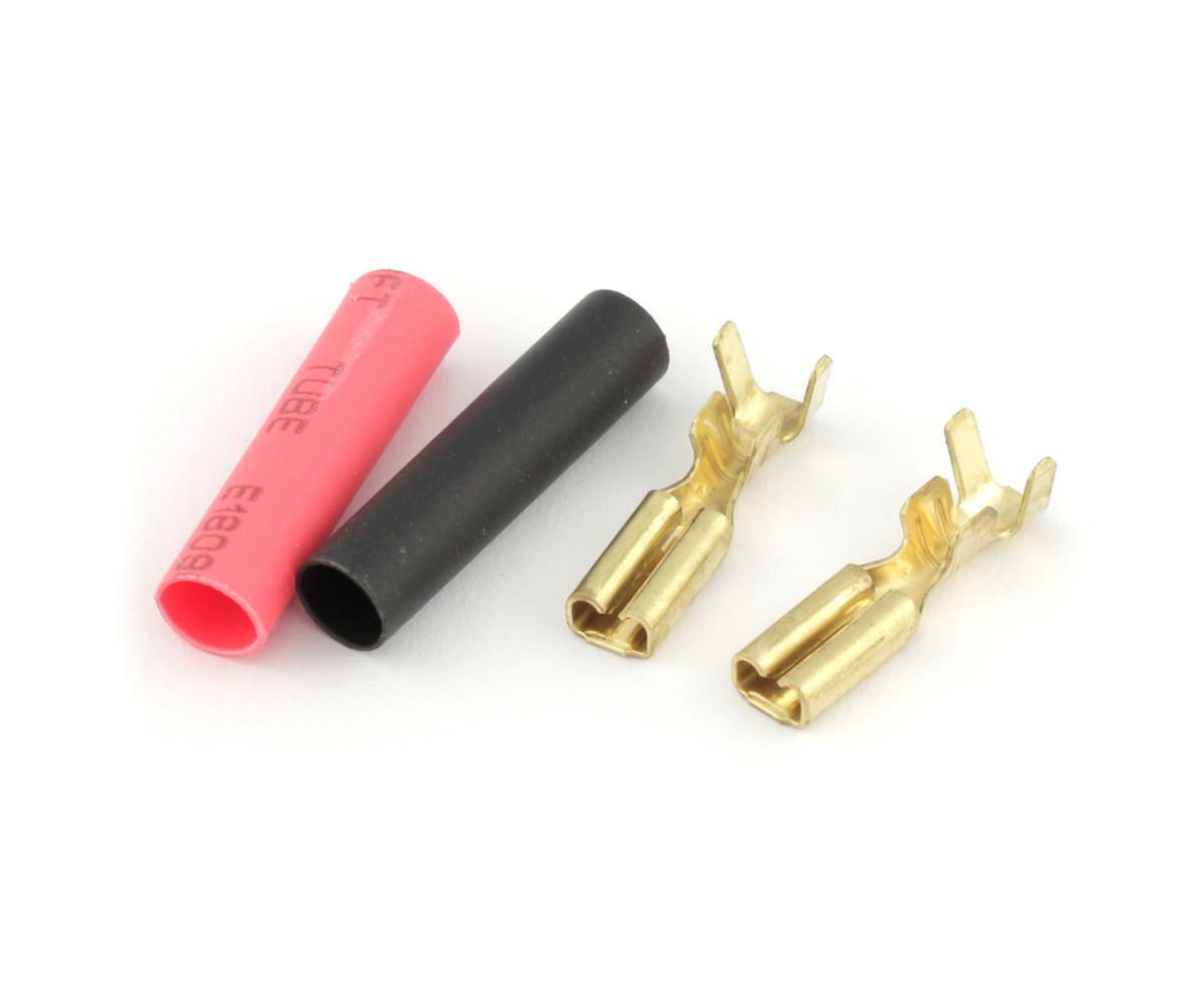 Package Includes 2 Brass motor connectors, 1 red shrink wrap, 1 black shrink wrap
