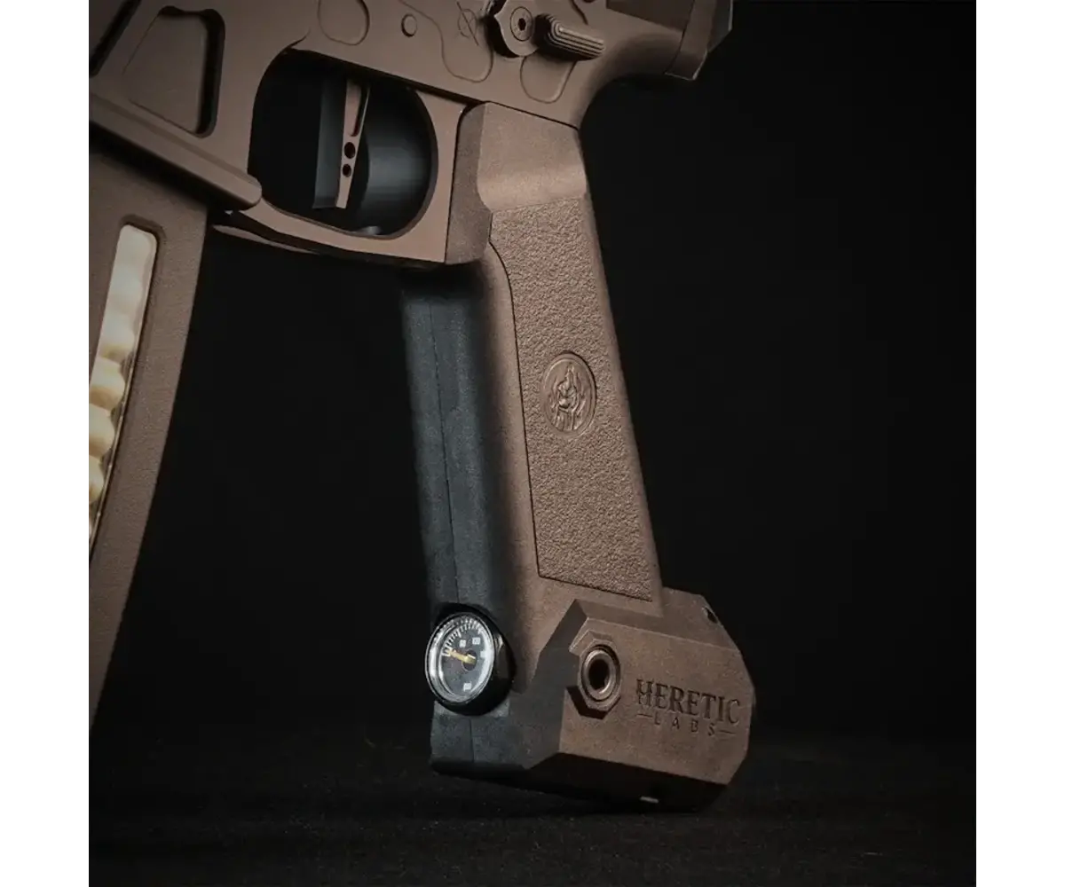 Direct Tank Mount with STORM Category 5 Regulator: Heretic Labs’ proprietary Tank Grip integrates seamlessly into the rifle, allowing direct connection of a standard HPA tank. It features an internally mounted STORM Category 5 regulator with forward-facing gauge, tournament lock, and toolless battery access — all within a durable, glass-filled nylon housing.