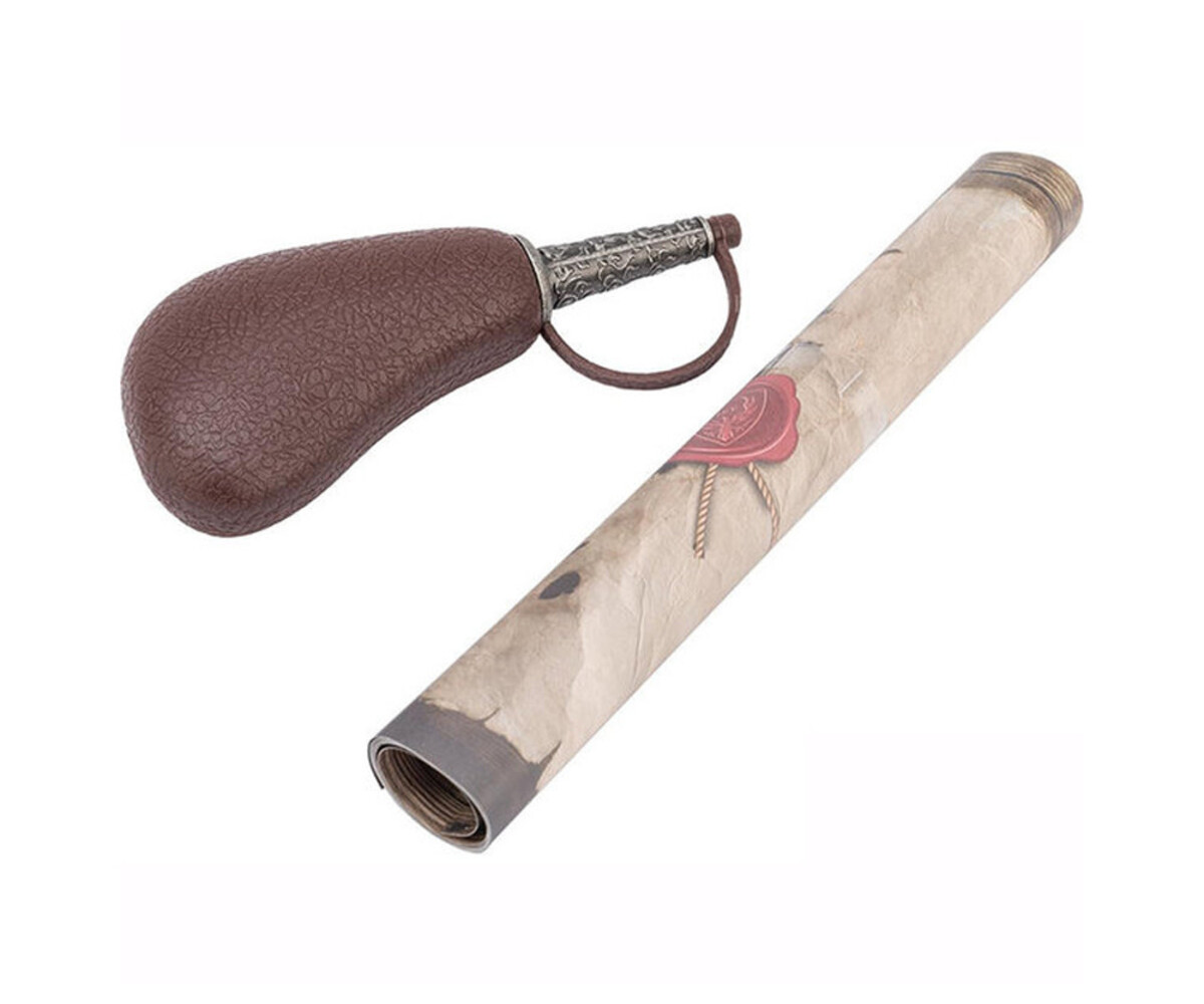 Package Includes: Flintlock pistol, faux leather powder flask, parchment-style manual