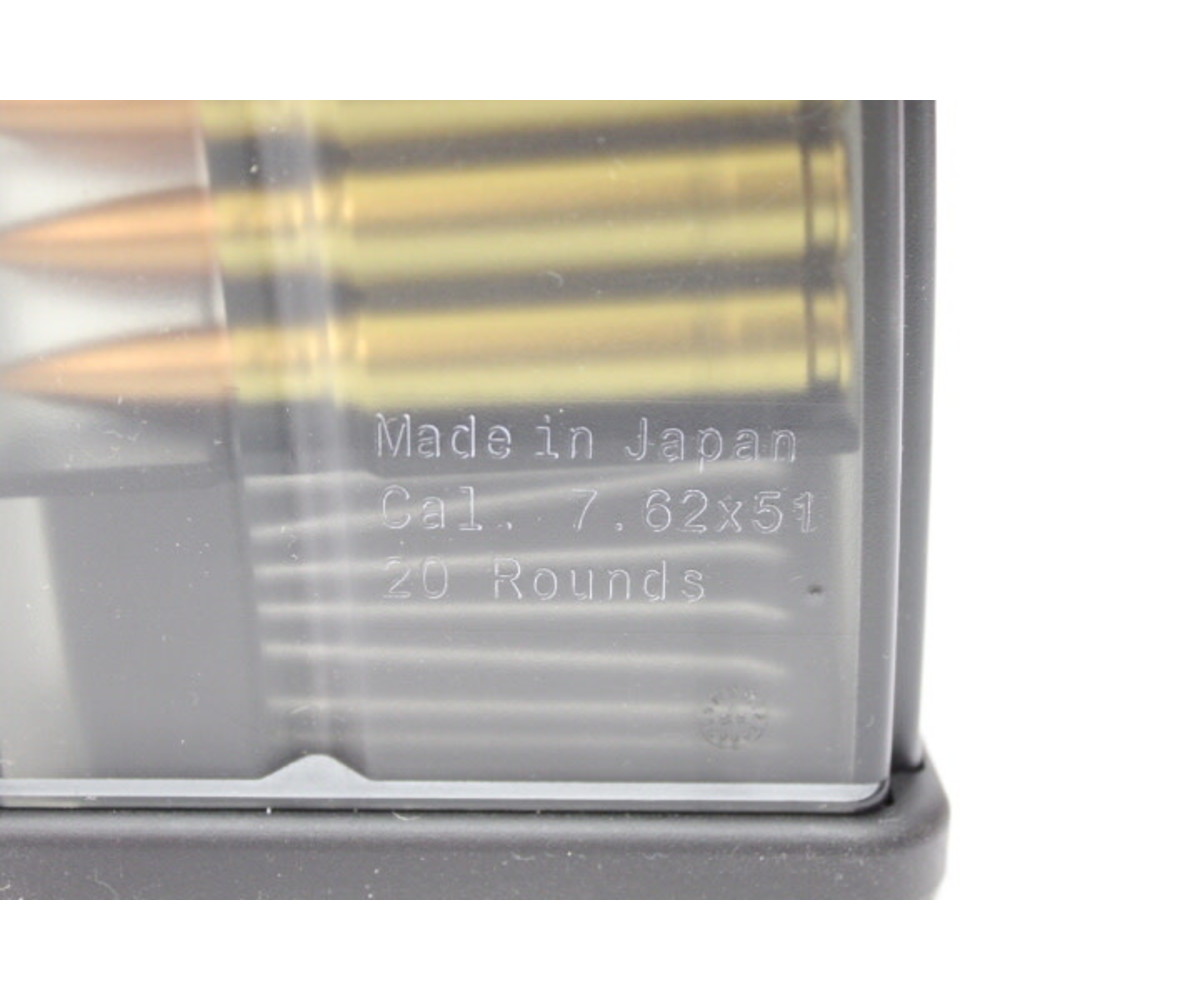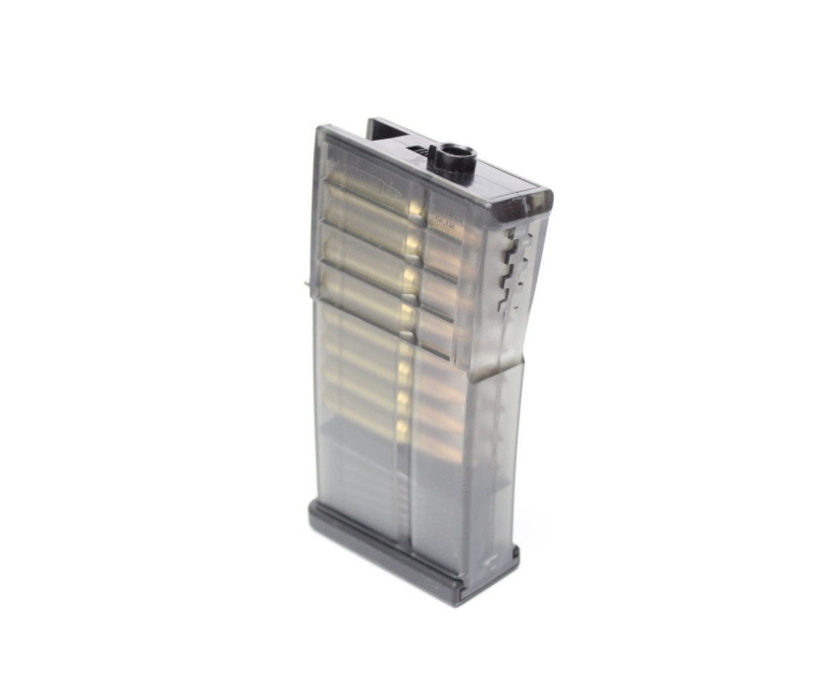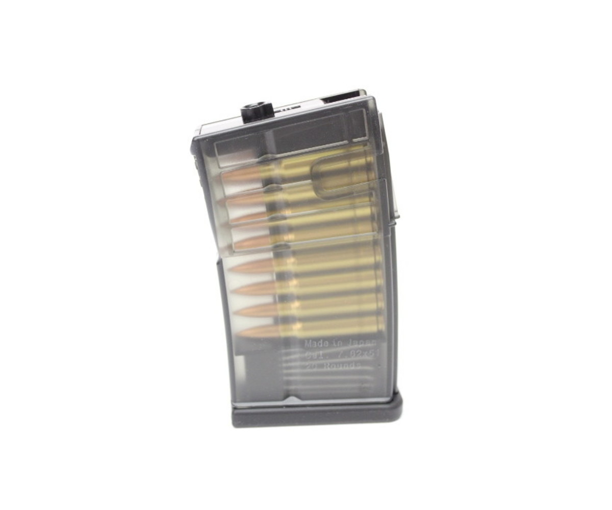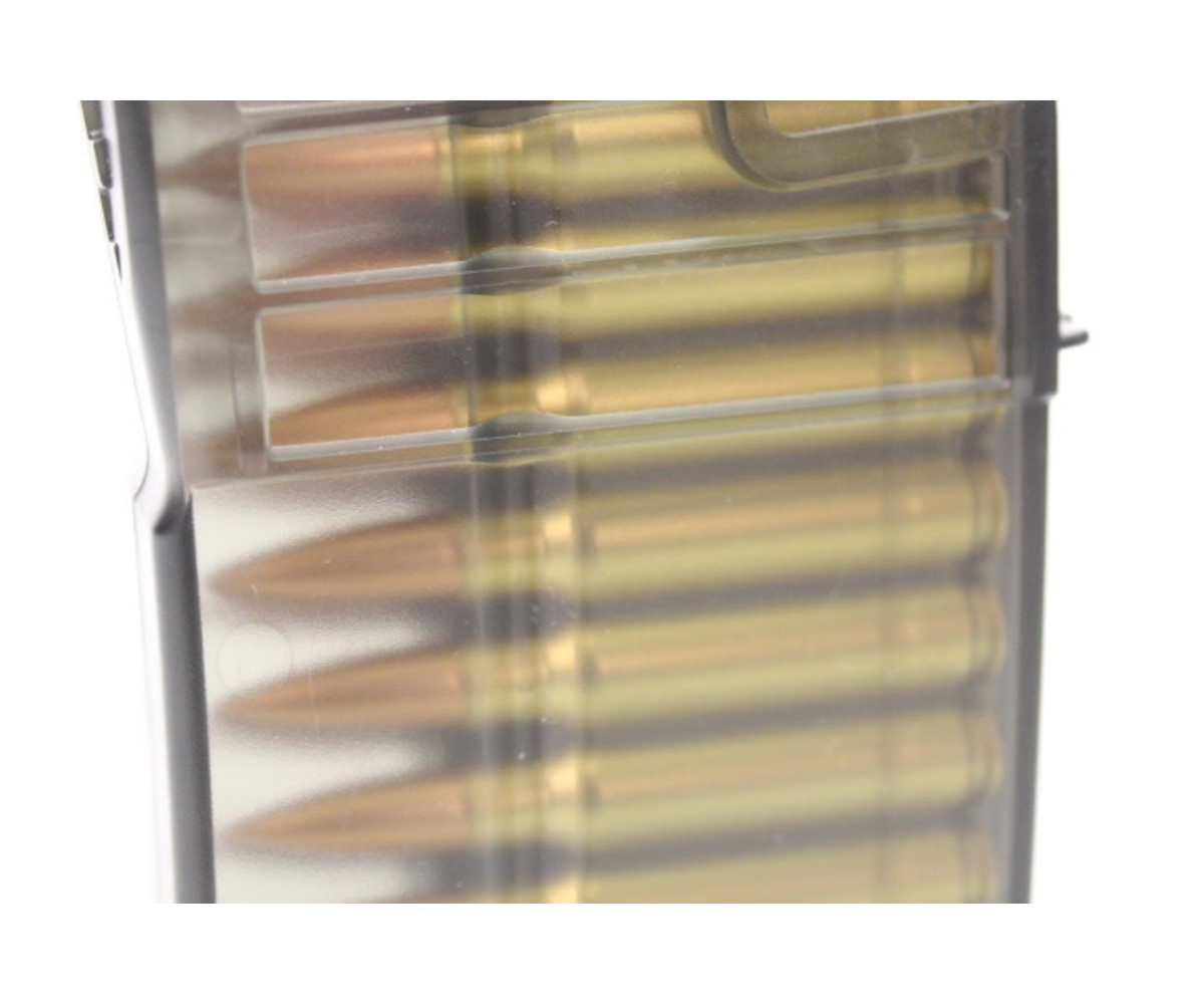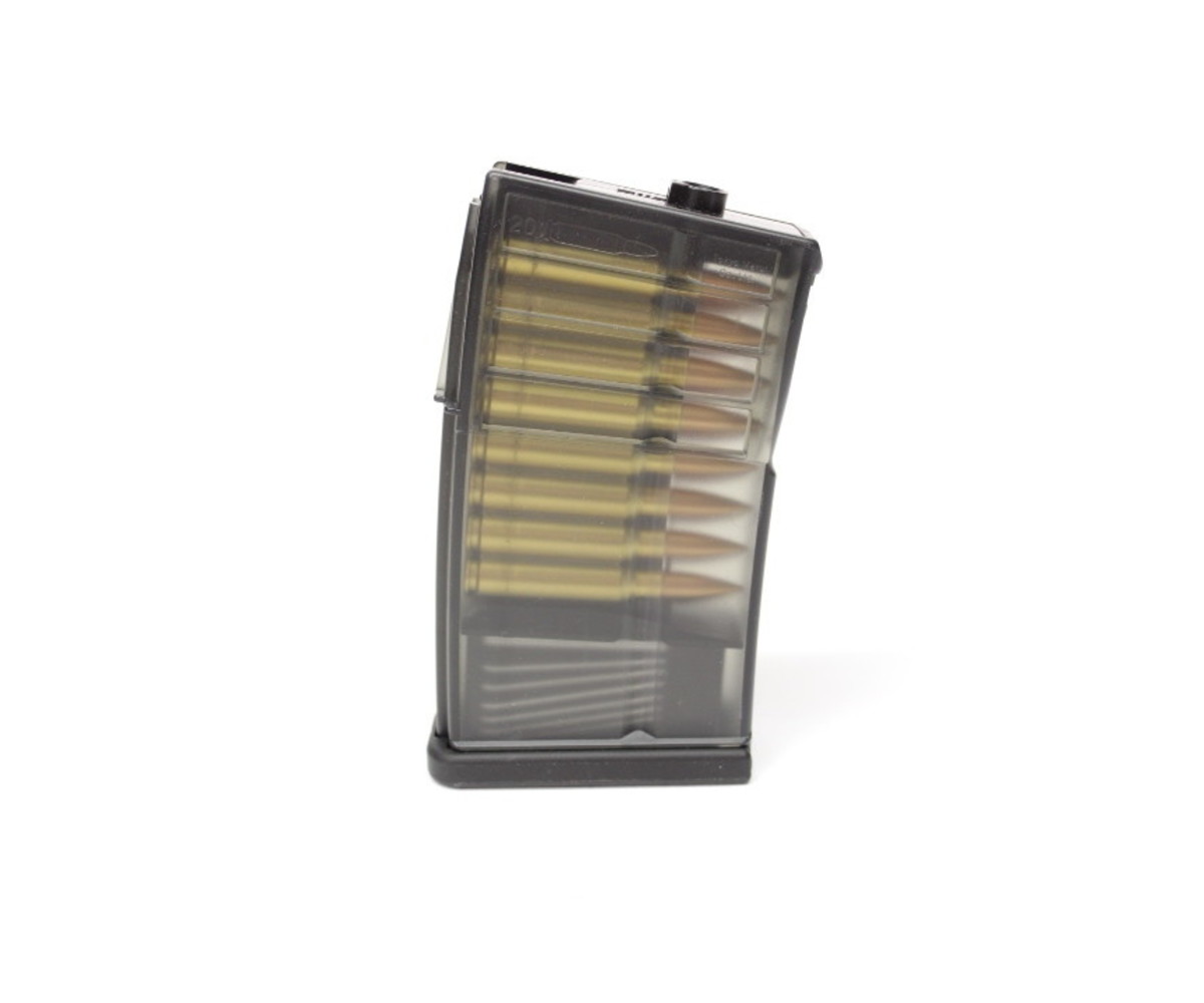 Built with a light polymer to reduce weight, these magazines still retain a realistic size. Featuring a strong steel feed spring, each magazine will feed fast, and move even heavy sniper bbs if you need it. Prominently displayed in the translucent body is a stack or 7.62 dummy rounds, giving these magazines a unique, head-turning look.