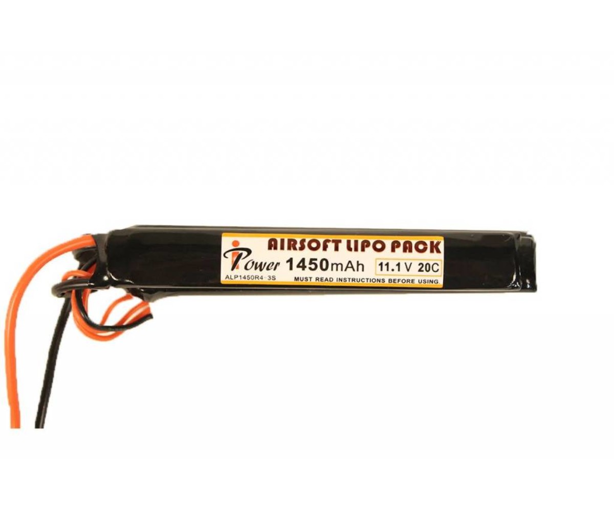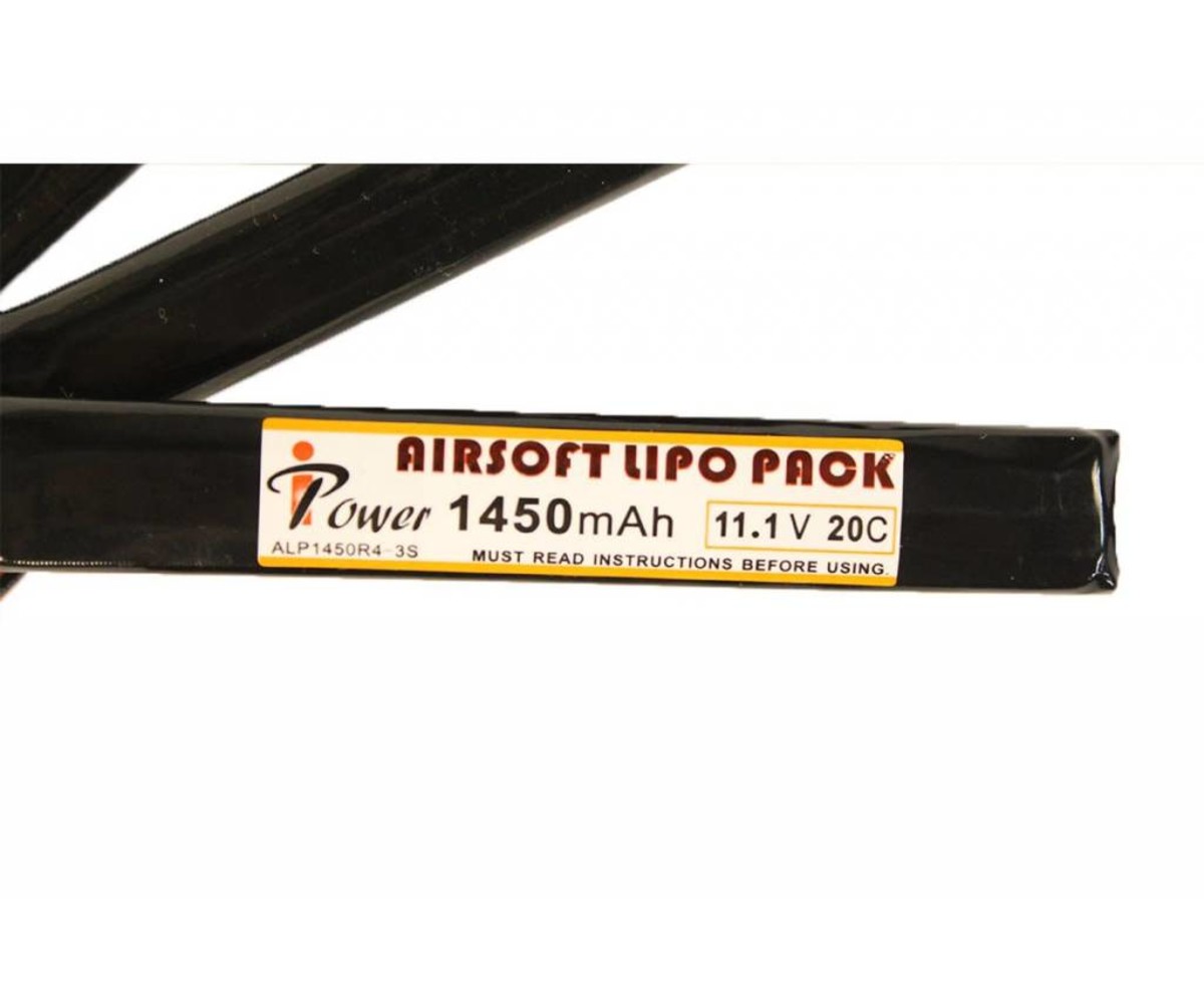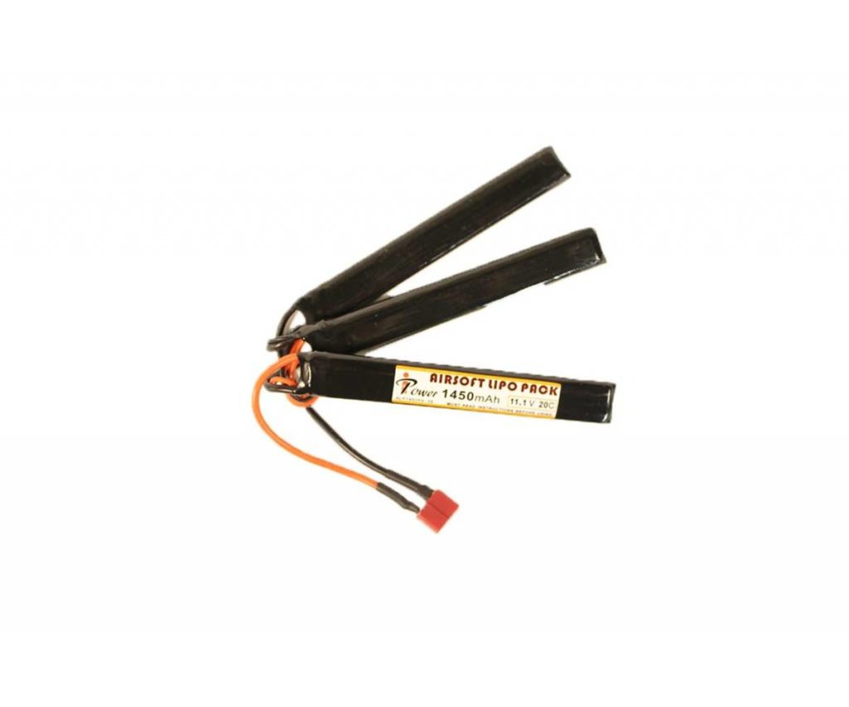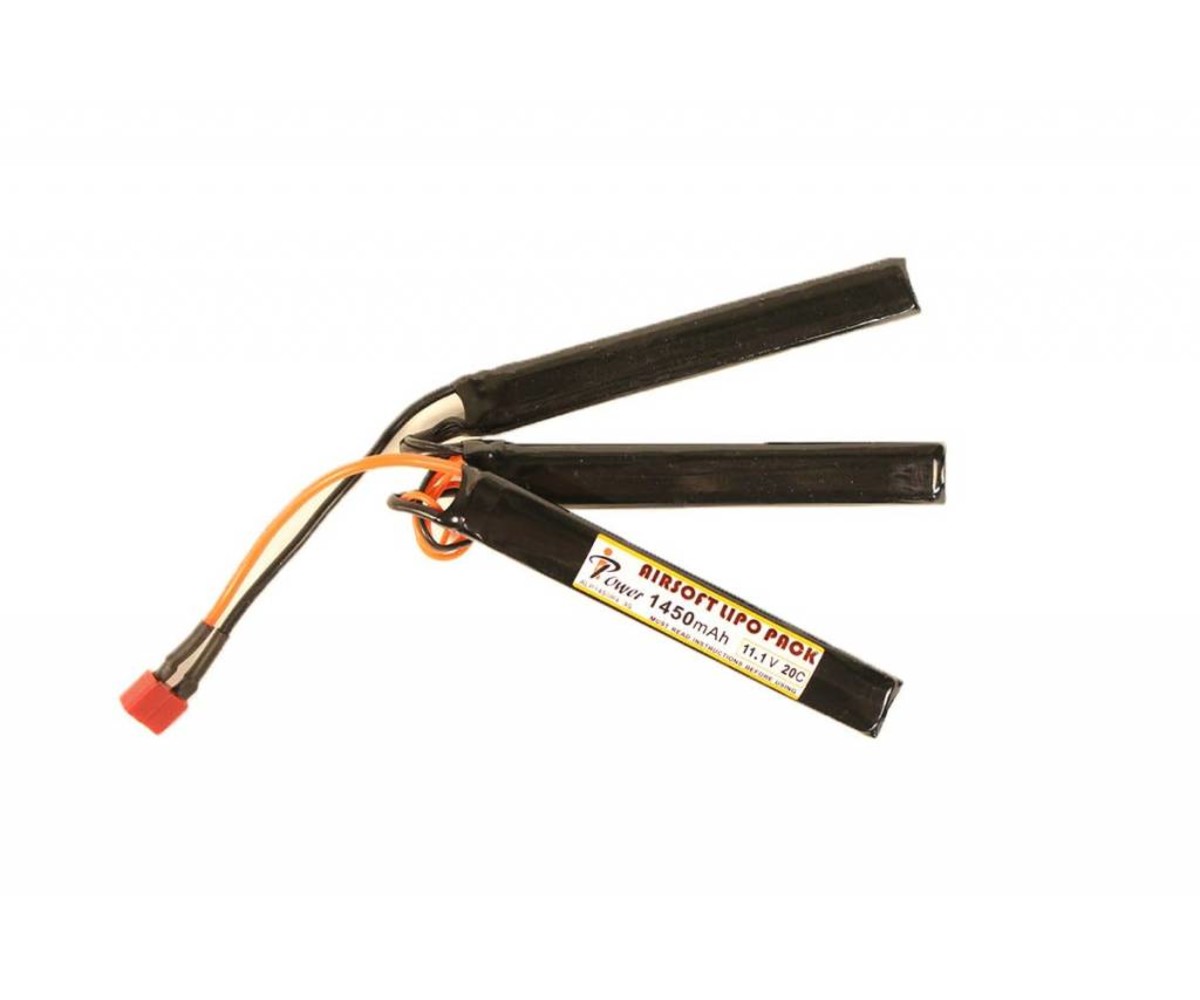 The iPower 11.1v 1450mAh 20C 3X Nunchuck LiPo Battery offers a great balance between higher voltages and longer run times. The 11.1 voltage is great for stronger spring builds, or for faster fire rates. Plus, with a 3x nunchuck design splitting the 1450 mAh capacity, you can more easily pack all of this power away in your AEG. This battery comes with a Deans Plug connector.