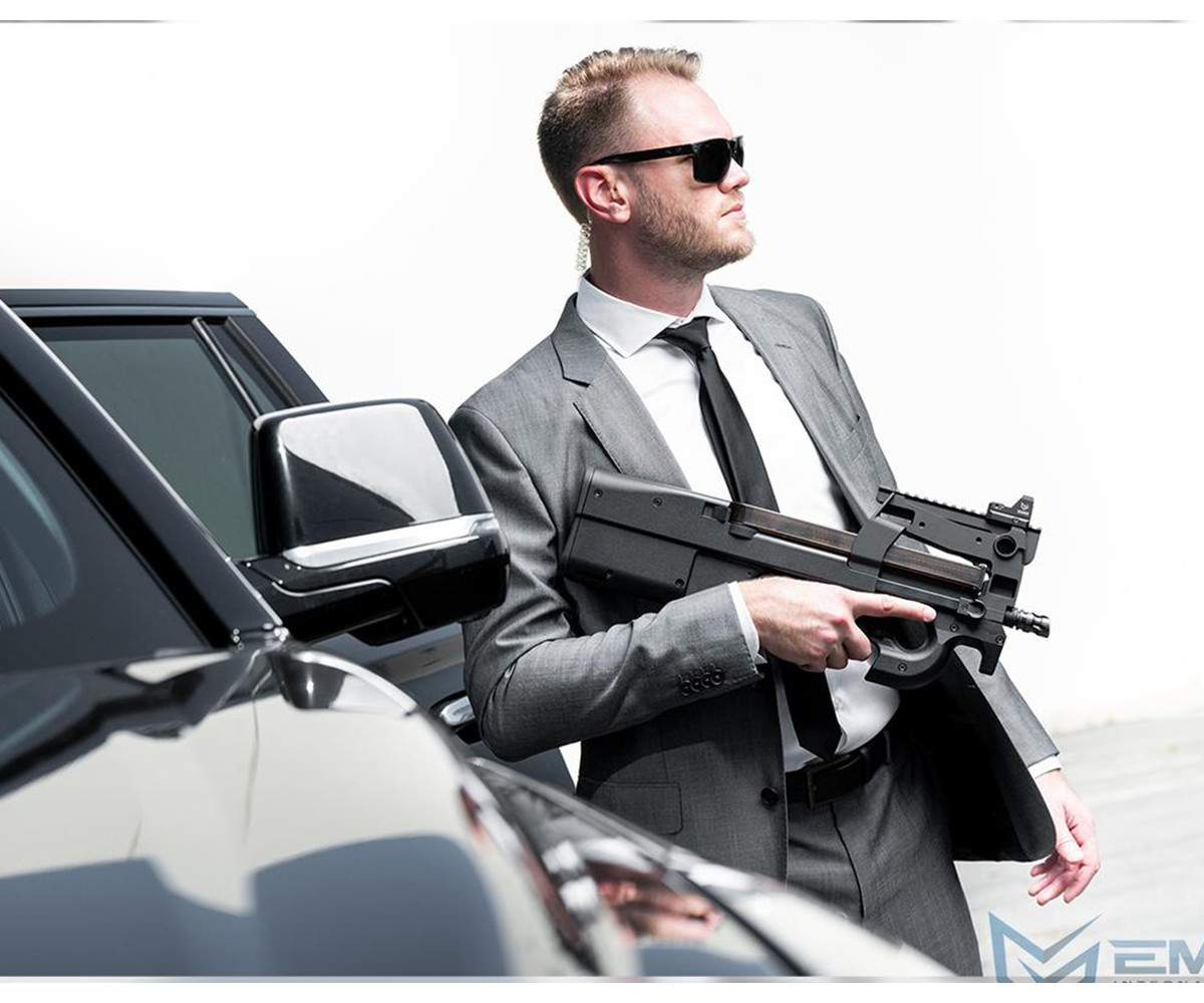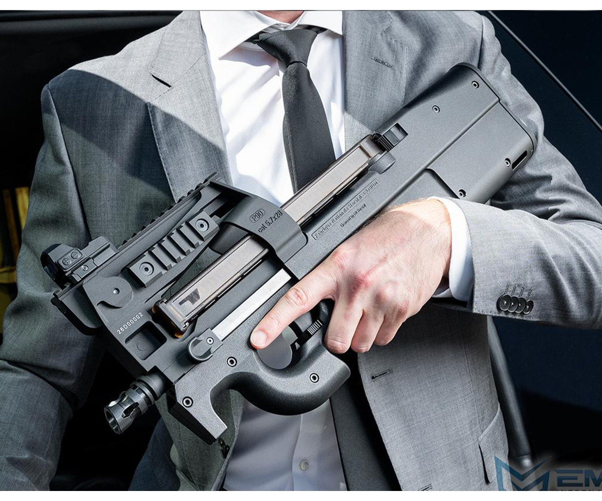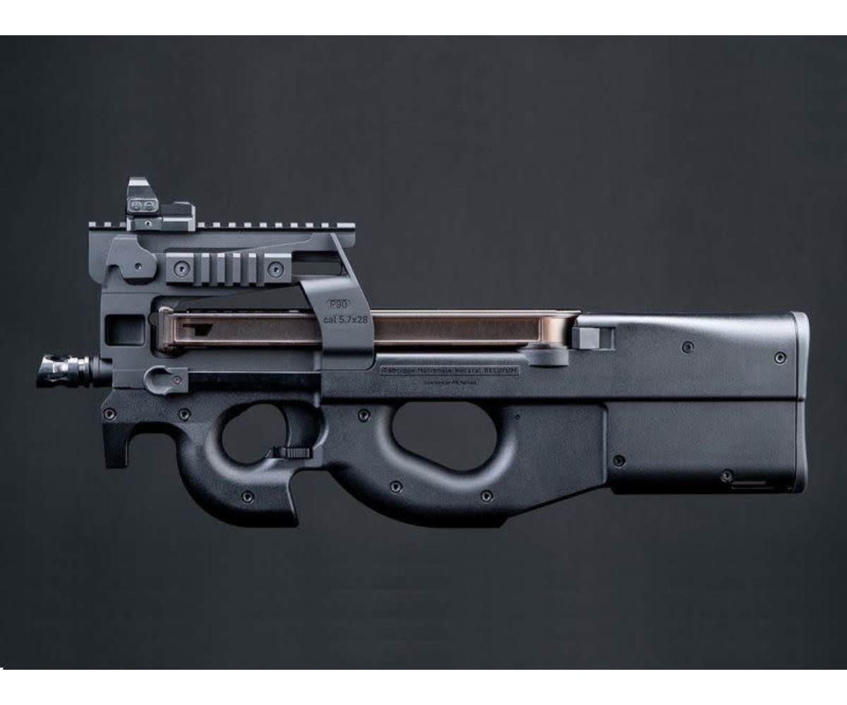 Developed in response to NATO requests for a compact but effective firearm for vehicle crews, support personnel, special operations, counter-terrorist units, and crew served weapon operators, the FN-P90 manages to excel in many of the categories FN-Herstal set out to achieve. The futuristic Personal Defense Weapon (PDW) / Sub-Machine Gun (SMG) entered production in 1990 and began service starting in 1991 and is continued to be used by militaries, law enforcement, and special operation groups around the world today. Chambered in the 5.7x28mm cartridge, the weapon far surpassed the 9x19mm weapons in performance and handling. The small caliber boasted greatly improved velocity at only half the weight of standard 9x19mm cartridges thus allowing the user to carry a great deal more ammunition into combat. Additionally, more rounds can be loaded into a magazine thanks to the cartridges relatively small diameter. Due to its incredibly high velocity, the 5.7x28mm cartridge fires at an exceptionally flat trajectory with roughly 30% less felt recoil which greatly improves accuracy even under fully automatic fire. The FN-P90's design came about after extensive ergonomic research; its small profile makes it ideal for tight, confined spaces as well as for personnel who require a concealable weapon. Featuring true-fully-ambidextrous controls, the FN-P90 is the first of its kind to be right handed and left handed shooter friendly without any modification or re-configuring of the firearm. The weapons charging handle, magazine release, and back up sights are symmetrically distributed on both sides of the firearm; the safety / fire control is located at the base of the firearms trigger which can be easily accessed with the thumb or index finger. The weapon also uniquely ejects spent casings downwards away from the users' face which makes for a much more pleasant shooting experience when needing to transition from left to right and vice versa.