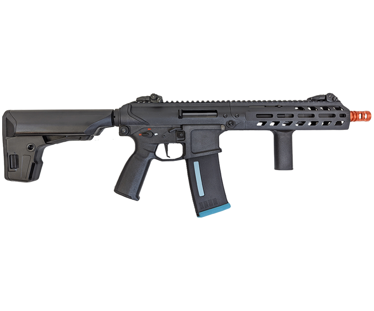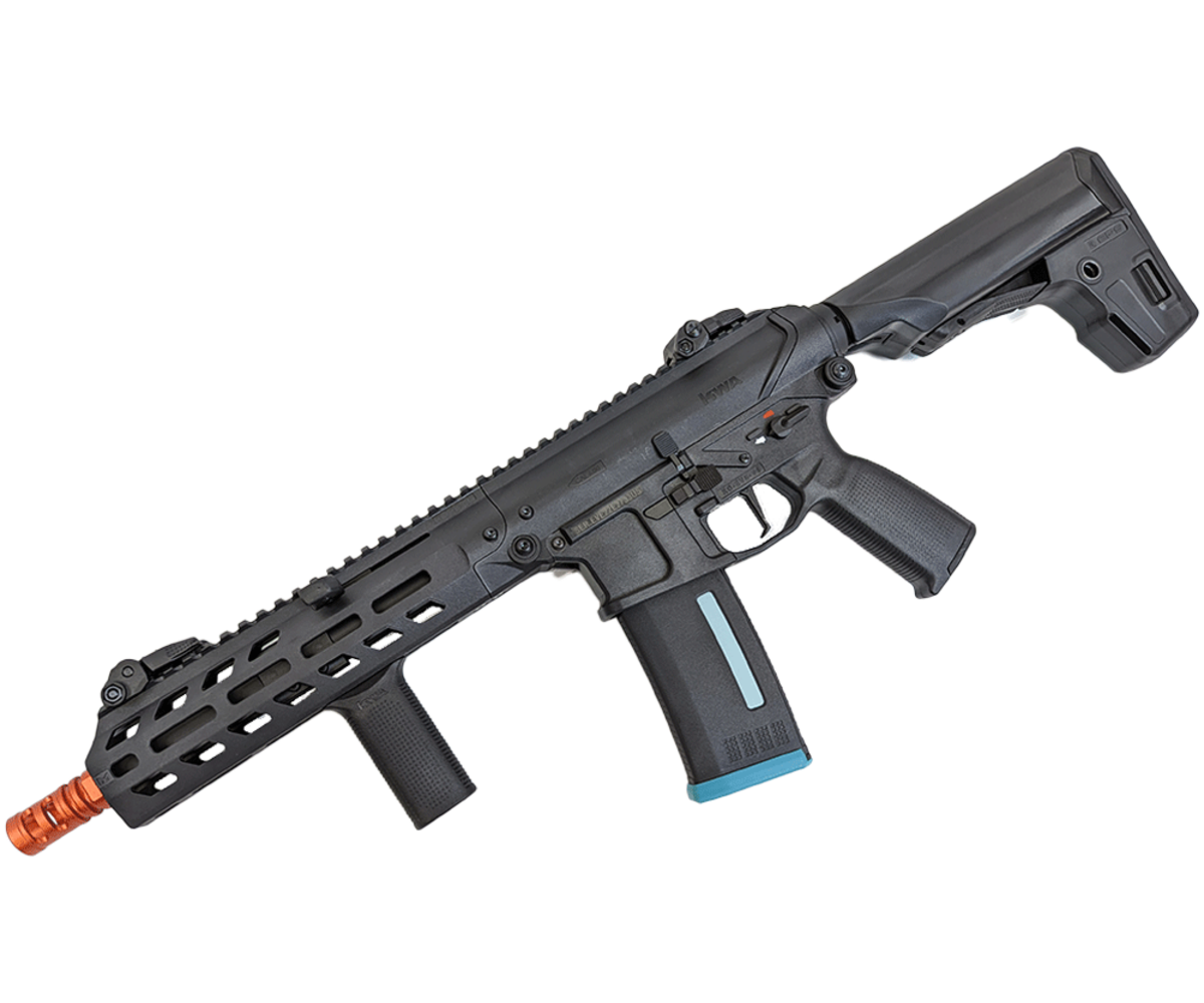The KO:EVE-9 AEG, the longer of KO EVE, is meant to rival the T10 without the kickback of our recoil system; it is a nod back to our original Ronin 10 SBR. With improvements to the overall design and feel such as the high-strength polymer receiver set and MLOK handguard. The weight is considerably lighter and well balanced.