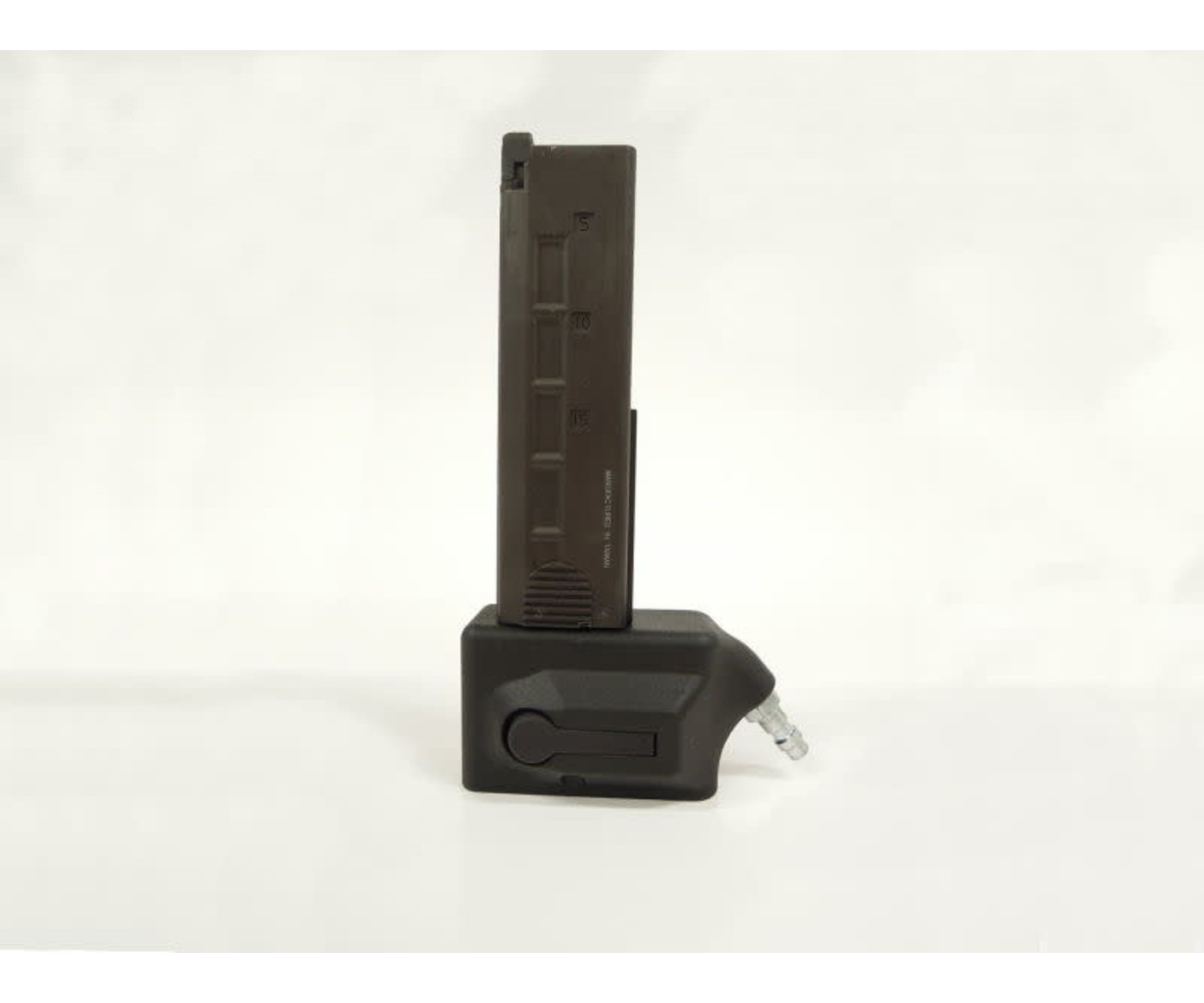This is a custom-designed laser-sintered nylon adapter that allows you to use HPA (high-pressure air) and M4 AEG magazines on your KWA MP9 airsoft SMG. To use it you will also need an M4 AEG magazine, “paintball” tank with low-pressure regulator (0-140) psi, a hose with a Foster (Polarstar) quick disconnect, and of course bbs.