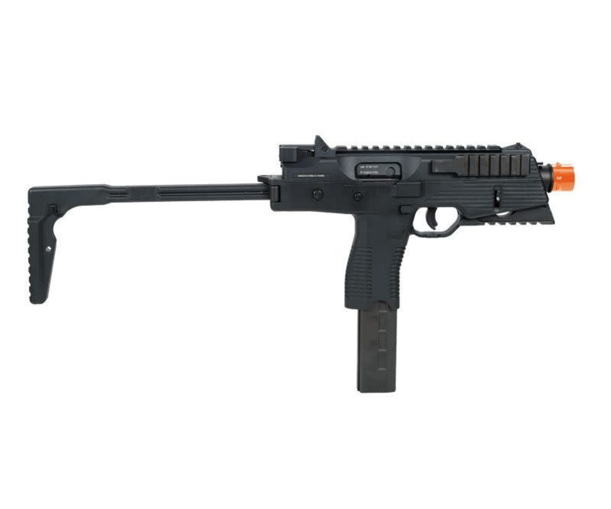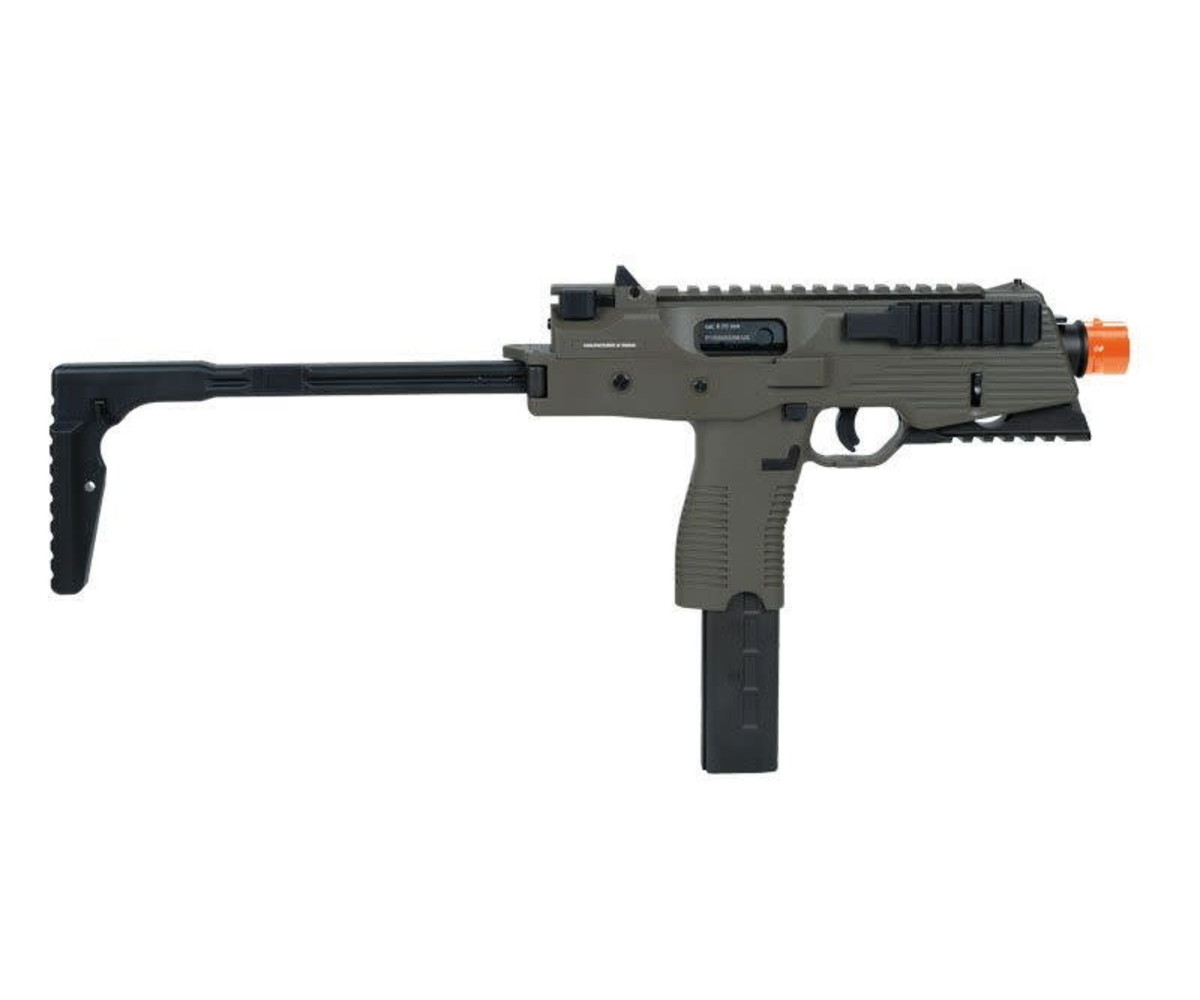 The KWA KMP9 series is based on a small lightweight 9mm submachine gun and features an integrated folding stock and a molded fore grip to provide a stable shooting platform for the user. The KMP9R variant features a bottom accessory rail in place of the molded fore grip allowing for attachment of accessories, like flashlights, laser units, or removable foregrips. Both models have an accessory side rail as well as a top accessory rail for optics and other weapon attachments. KWA has also produced a CQB bolt assembly that can easily be swapped to reduce the exit velocity of the weapon for indoor CQB environments. With three color options and two variations available, the KWA KMP9 series provides a large amount of firepower in a small, compact, tactical package.