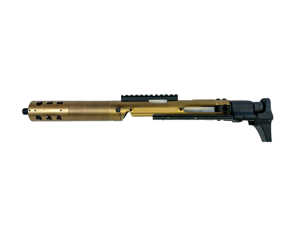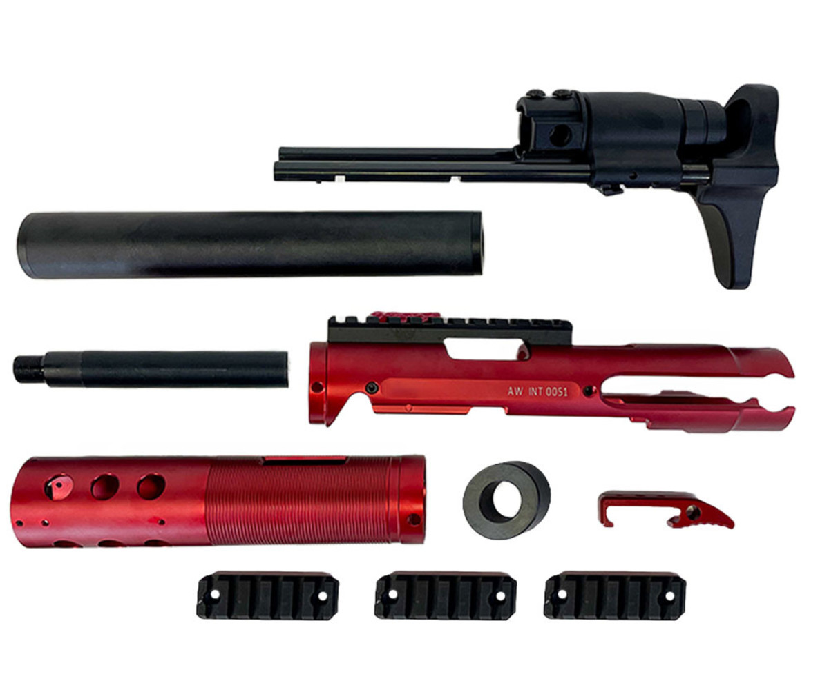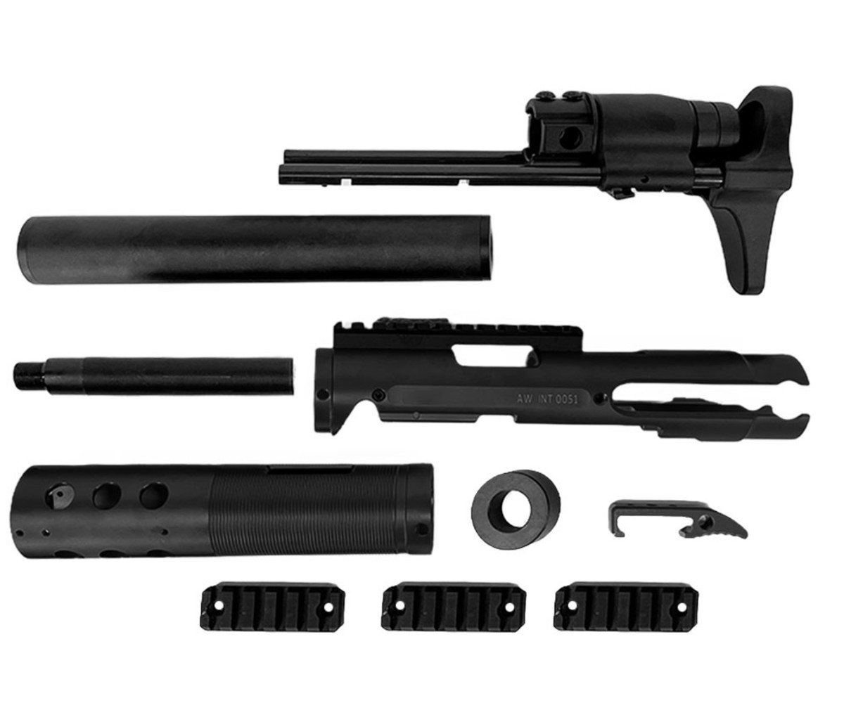 The receiver and handguard are machined from 6000-series aircraft grade aluminum and hard anodized (not painted!). The PDW stock features steel arms, and all of the picatinny rail segments are machined aluminum as well (not plastic!). The top rail mount is the ideal length for installing an Eotech scope or a T1/T2 style red dot sight with scope shield. Three six-slot picatinny segments allow you to accessorize the gun with lights, lasers, vertical grips or whatever else you desire. You can install as many or as few picatinny rail segments as you wish.