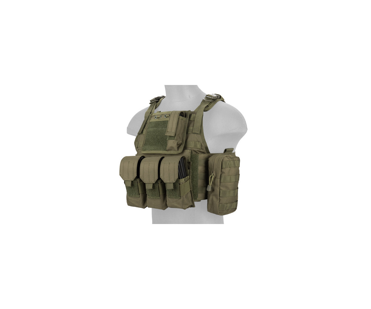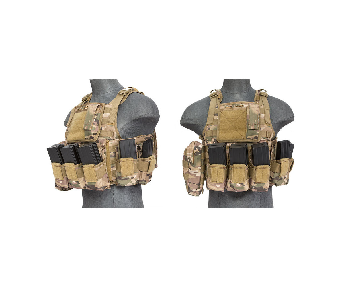 The Lancer Tactical Tactical Plate Carrier has many beneficial features for use in combat and airsoft scenarios. It accepts standardized 10x13 ballistic plates in the front and rear panels that are secured by flaps with heavy duty hook & loop closure. The shoulder and side straps are adjustable for most sizes (M-XL). In combat, quick release buckles give medics quick access to wounds but for airsoft it allows you to just drop your equipment after the game for a deserved break. This plate carrier is covered in molle webbing which makes it easy for the wearer to customize their pouches into whichever configuration works best for them on the field. This plate carrier comes with a few of the commonly used pouches that an average player would use on the field of airsoft battle. An admin pouch for securing patches, keys, or pens. A triple M4 and a double M4 magazine pouch that can hold up to 10 M4 magazines, or about 5 AK or G36 magazines. Finally a utility pouch for miscellaneous equipment like extra BBs.