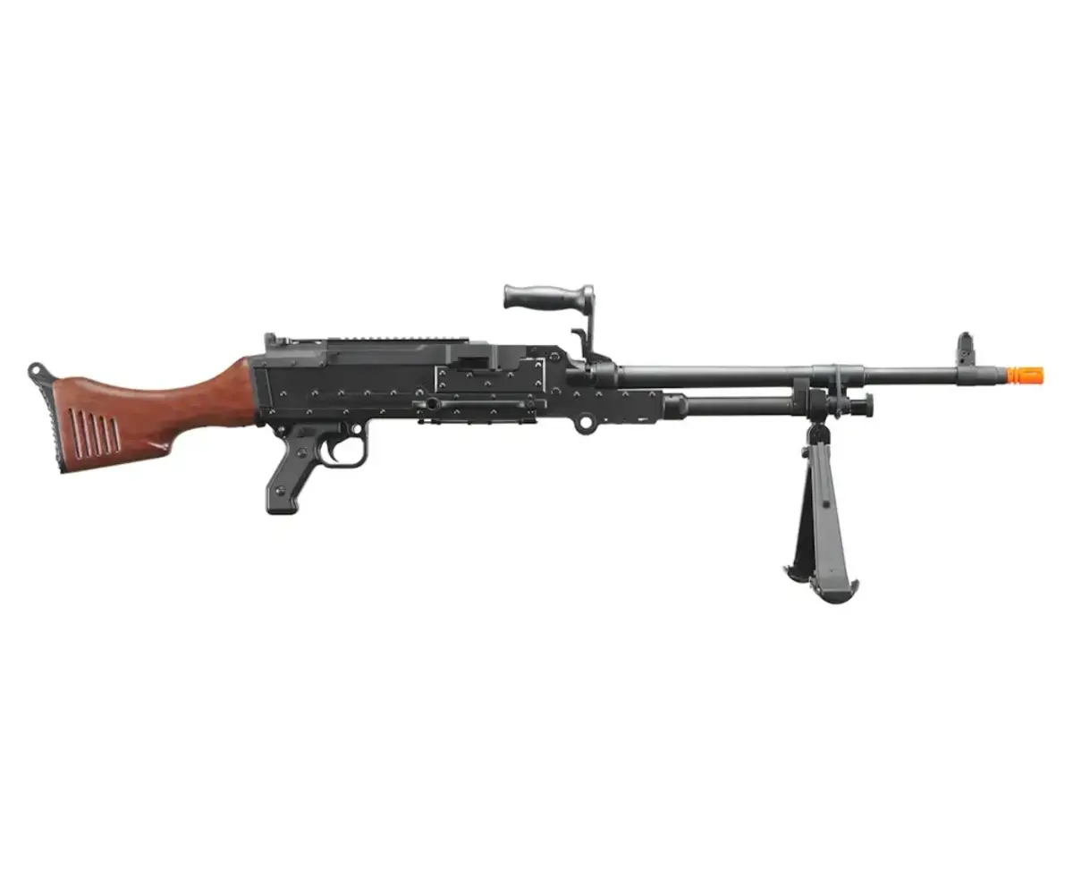 Quick Detach Barrel & Integrated Bipod: The CNC aluminum outer barrel includes a quick-detach system modeled after the real-steel counterpart for easy field maintenance. A steel folding bipod with a locking tab enables supported firing from prone or mounted positions.