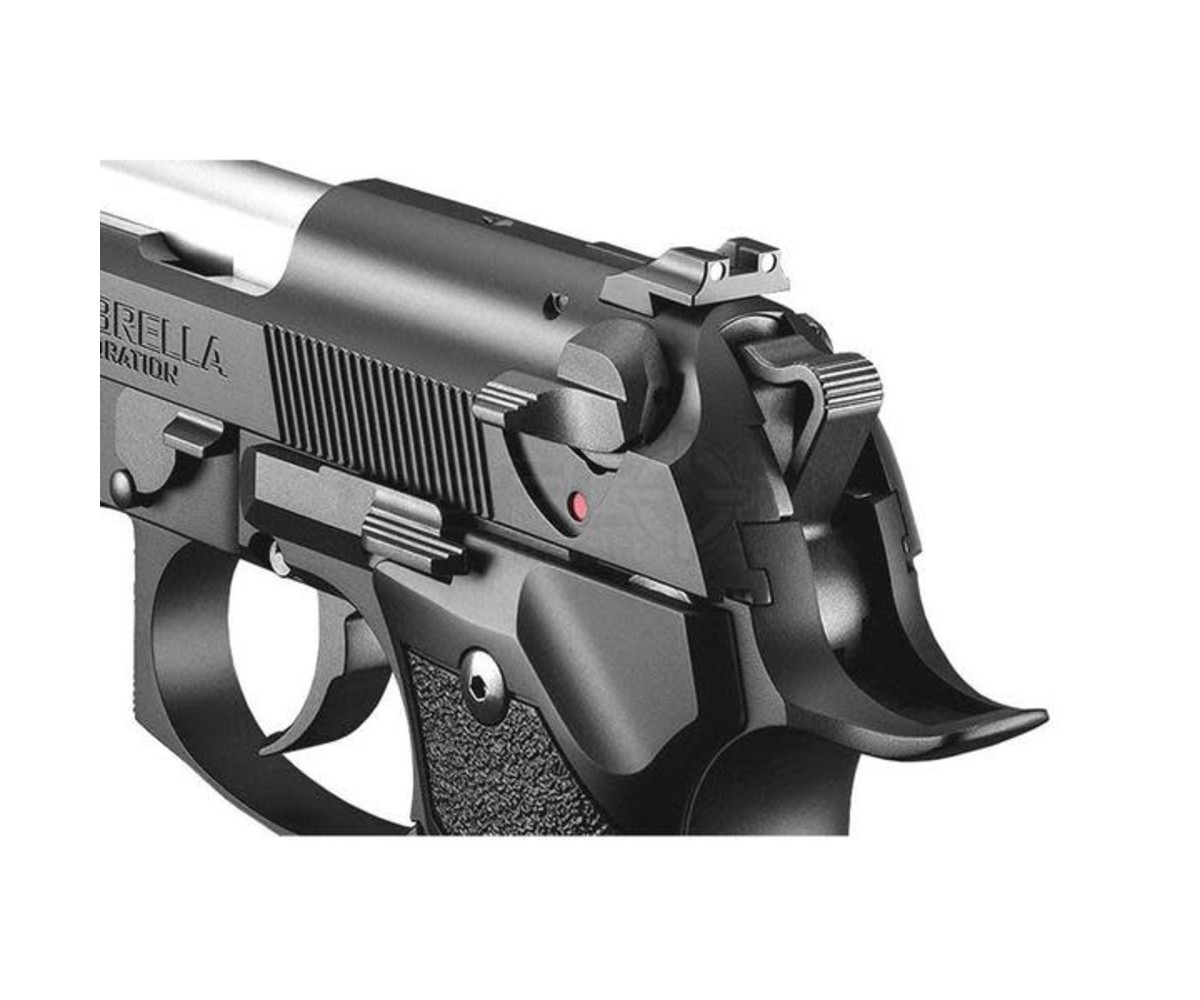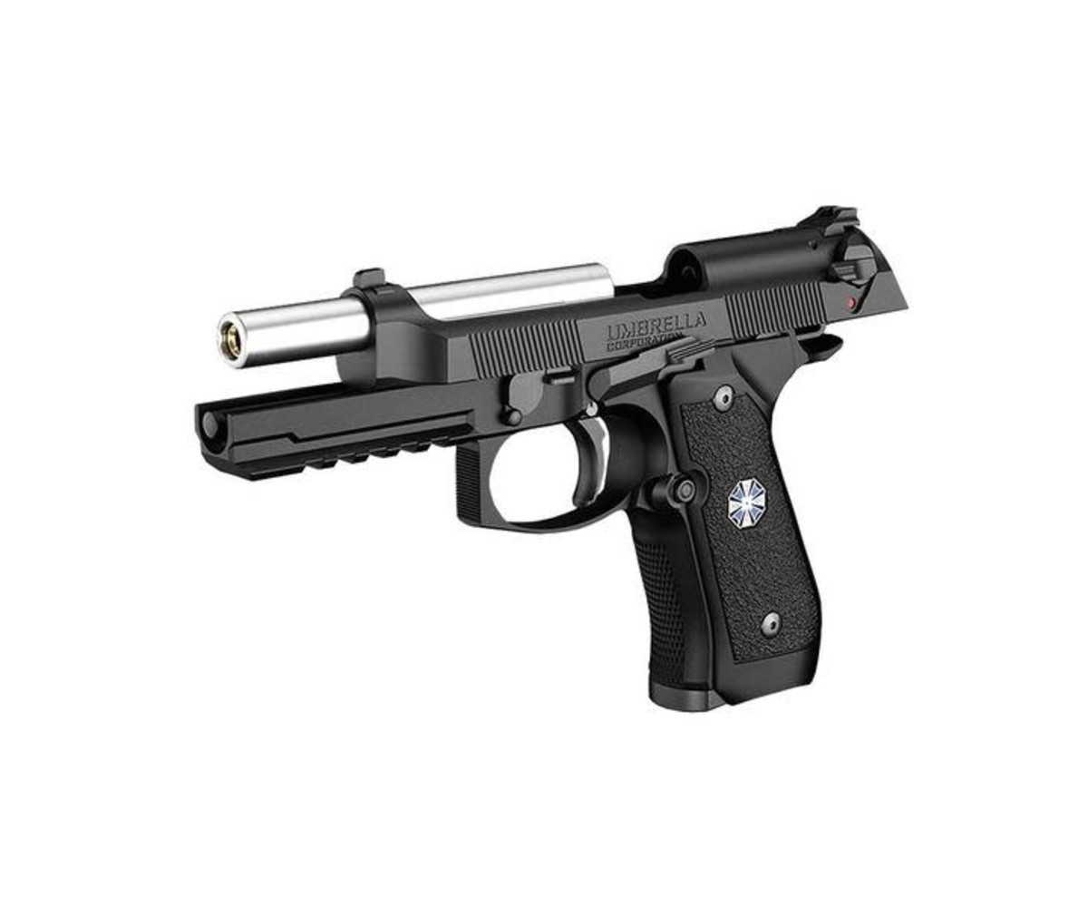 The Tokyo Marui Biohazard Albert W. model 01 P Umbrella Corporation GBB pistol is modeled after the same pistol used by video game character Albert Wesker from the Resident Evil Series (or Biohazard in Japan). This modified Bridgader-style M9A1 pistol features Umbrella Corporation markings on it giving it extra collector's value. The polymer construction gives the gun a robust feel in the hand while maintaining excellent gas efficiency and snappy recoil. It comes with a commemorative Umbrella Corporation booklet from your favorite apocalypse-inducing pharmaceutical company!