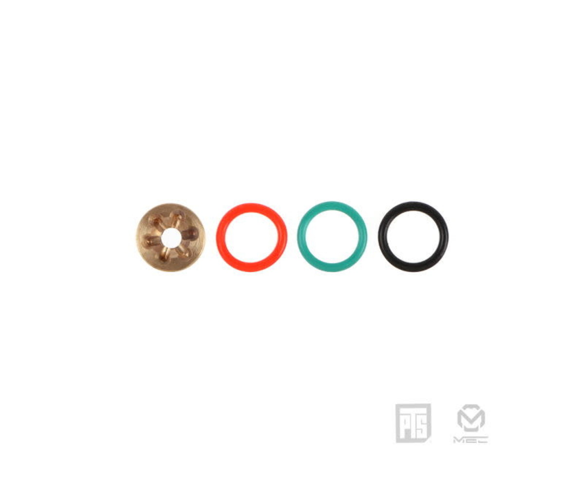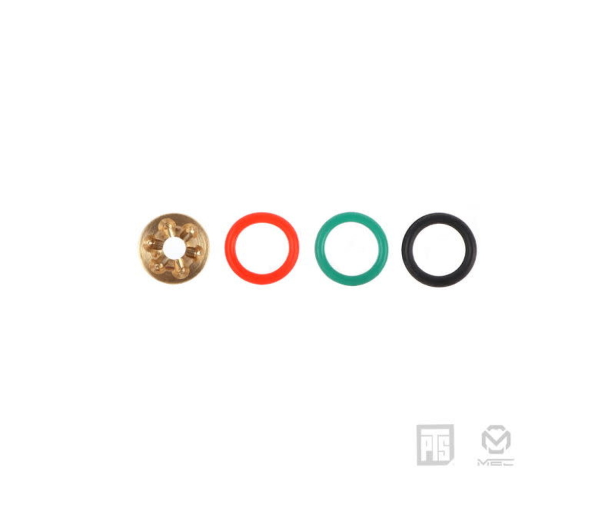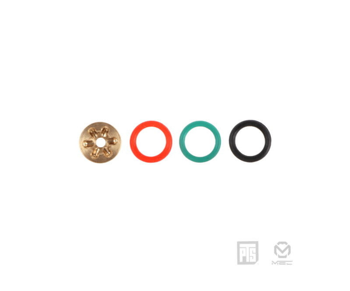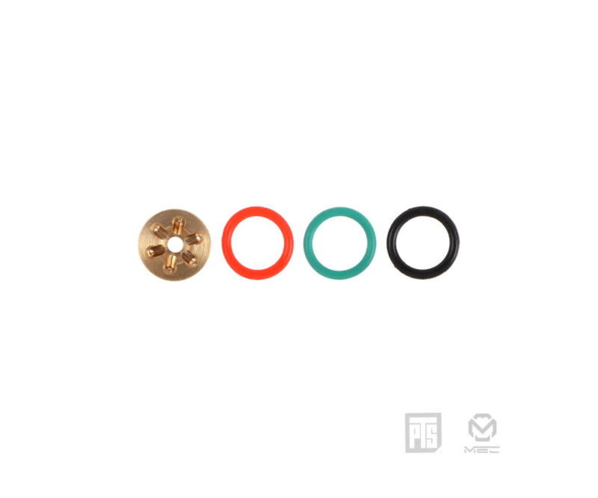 This particular pistols’ cylinder-front-view design brass piston head is equipped with a 6-hole air intake in order to improve the airtightness and air sealing with the included O-ring (including 3 sizes of O-ring: red, black, and green).