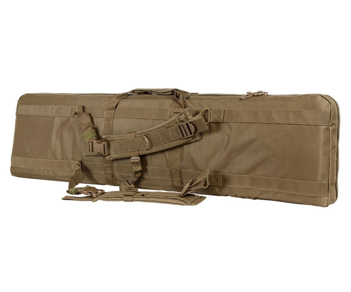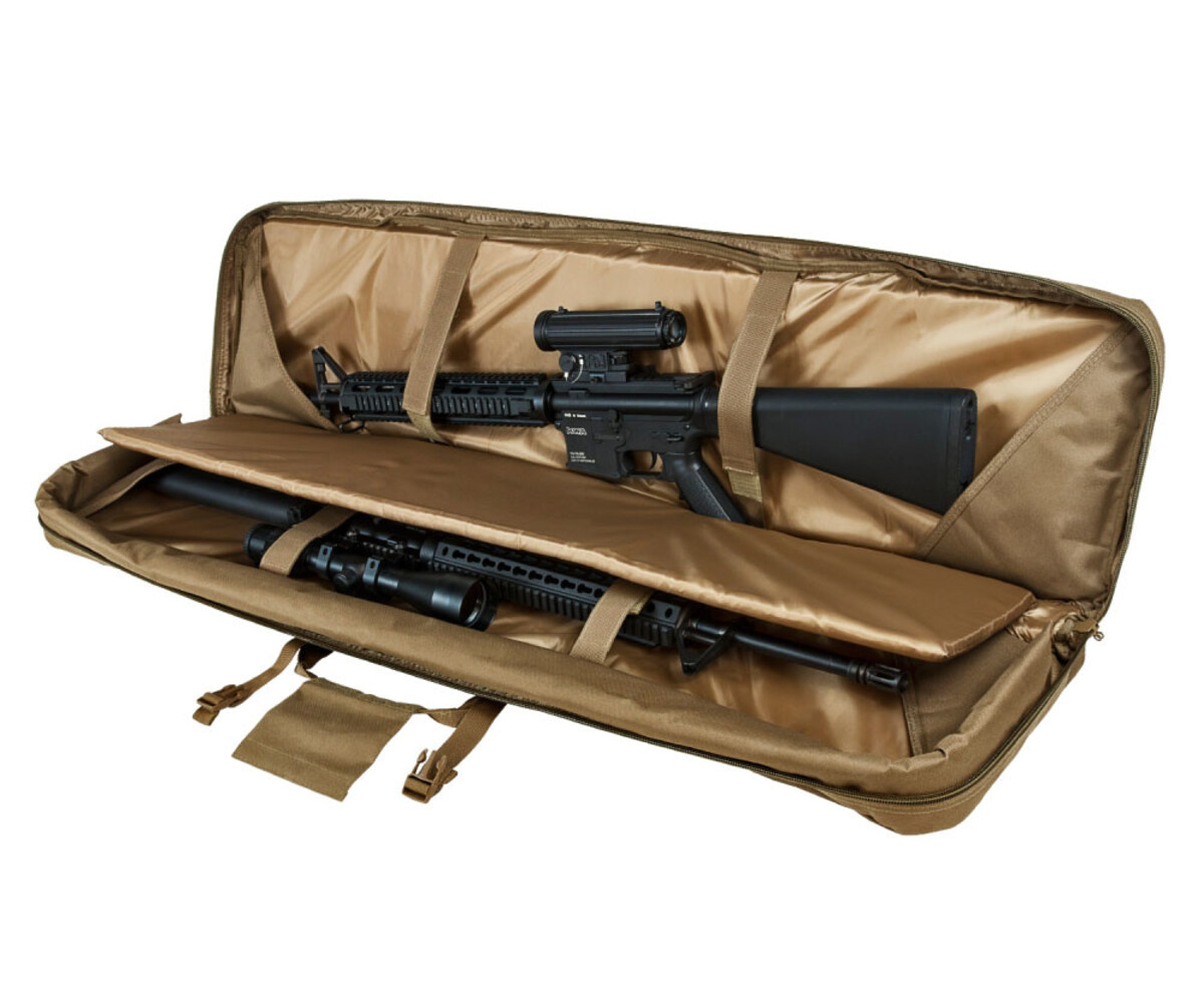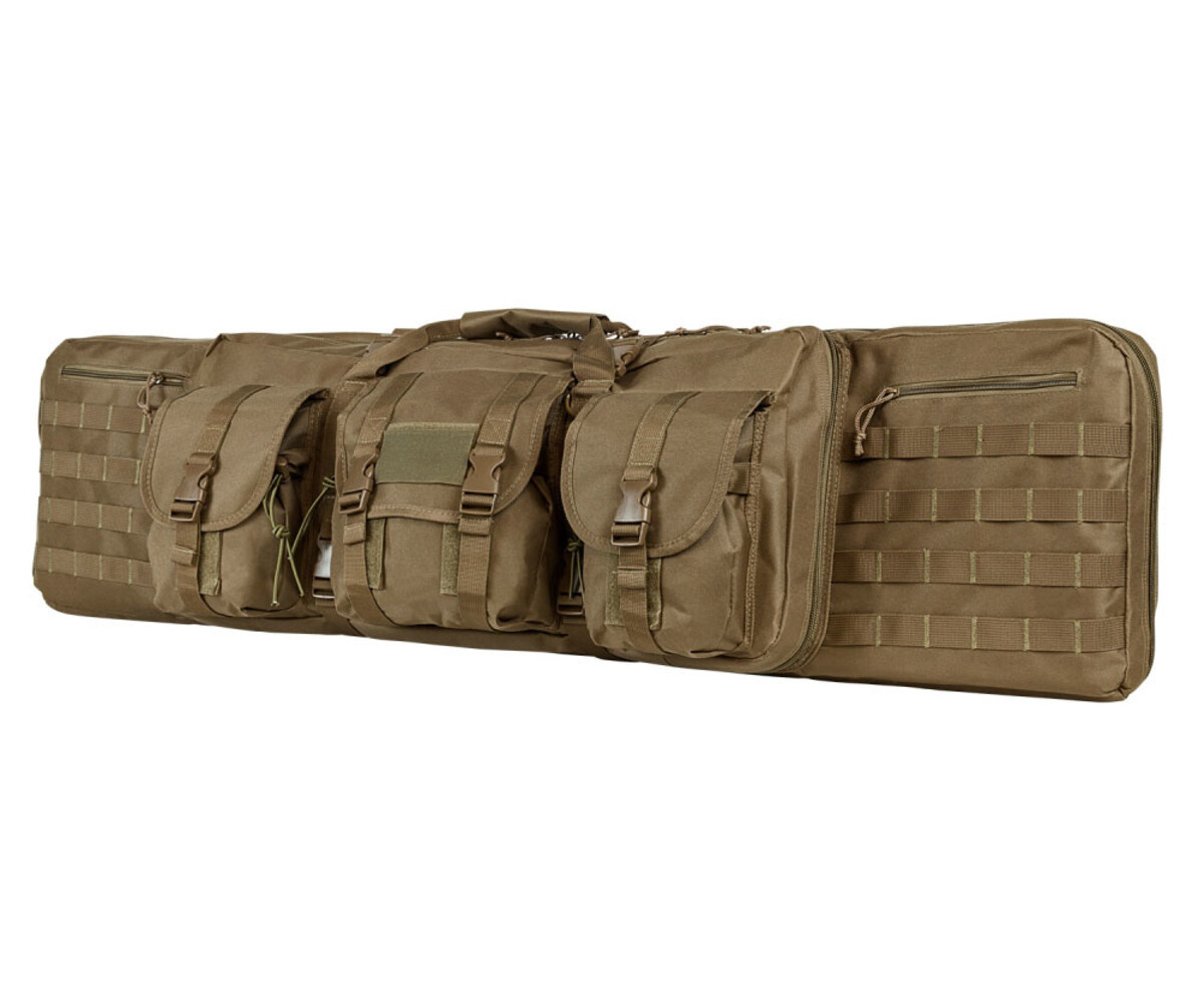 VISM’s 46” double rifle case is tan and is a perfect solution for someone trying to transport a few platforms and still comfortably carry them. The main area of the case is separated by a divider allowing for one rifle to be placed and strapped into place then separated by a padded divider where another platform may also be placed and strapped in. The outside of the bag also features some smaller compartments for other accessories one may need on their day out. The case itself is made of a sturdy PVC fiber ensuring a strong and durable product for your usage.
