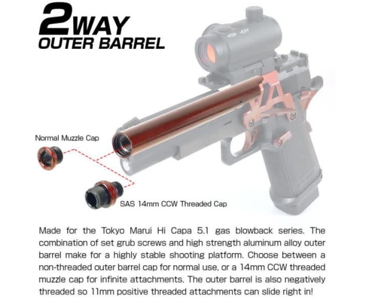 - Includes: Metal Outer Barrel ×1, Normal Muzzle Cap ×1, SAS 14mm CCW Threaded Cap ×1, Hex Grub Screws ×2
