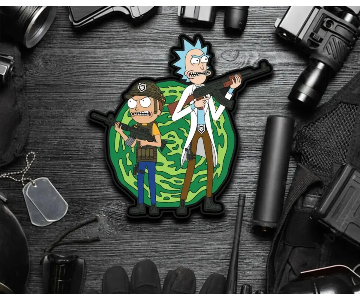 Key Feature or Design Note: This PatchOps design drops a familiar sci-fi duo straight into a tactical scenario. Set against a portal-style backdrop, the characters are geared up with rifles and kit, blending animated chaos with modern 2A culture.