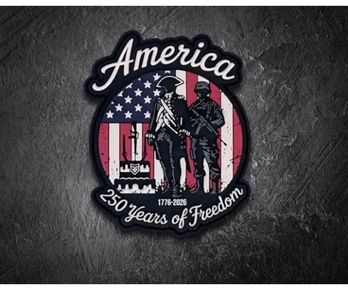 Design: The patch features a circular layout with a stylized American flag backdrop and two figures positioned in the foreground. Above, “America” is prominently displayed, while the lower portion reads “250 Years of Freedom” with “1776–2026” centered between. The composition is clean and balanced, with strong central focus.