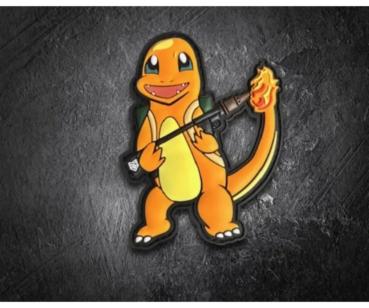 A PVC morale patch featuring a stylized orange creature with a flame-tipped tail holding a rifle. Sized for strong visibility on plate carriers, backpacks, and patch panels.