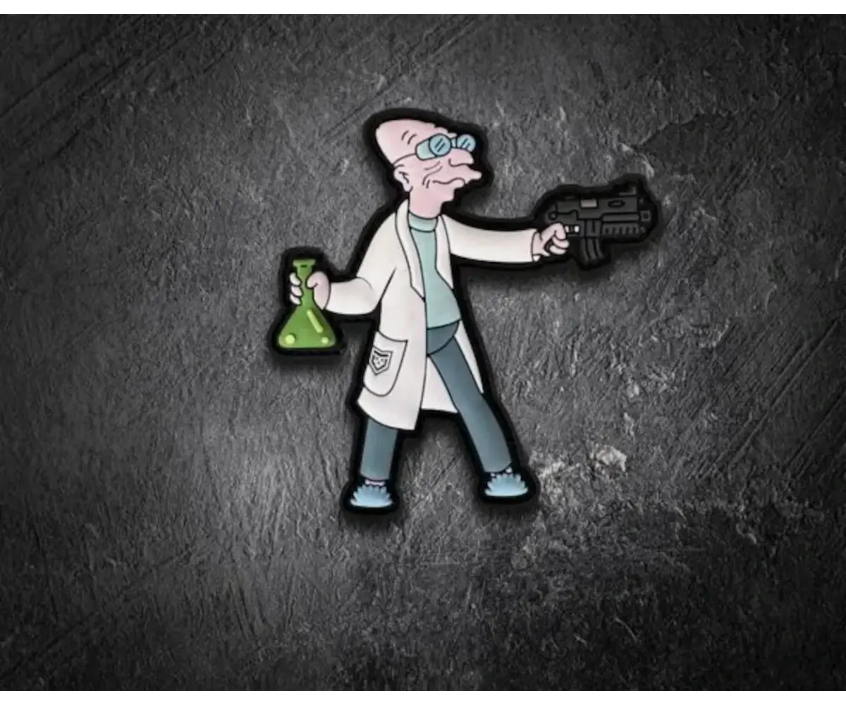 A PVC morale patch featuring a stylized elderly scientist character holding a device and flask. Compact and easy to spot, it fits cleanly on carriers, packs, and patch panels.