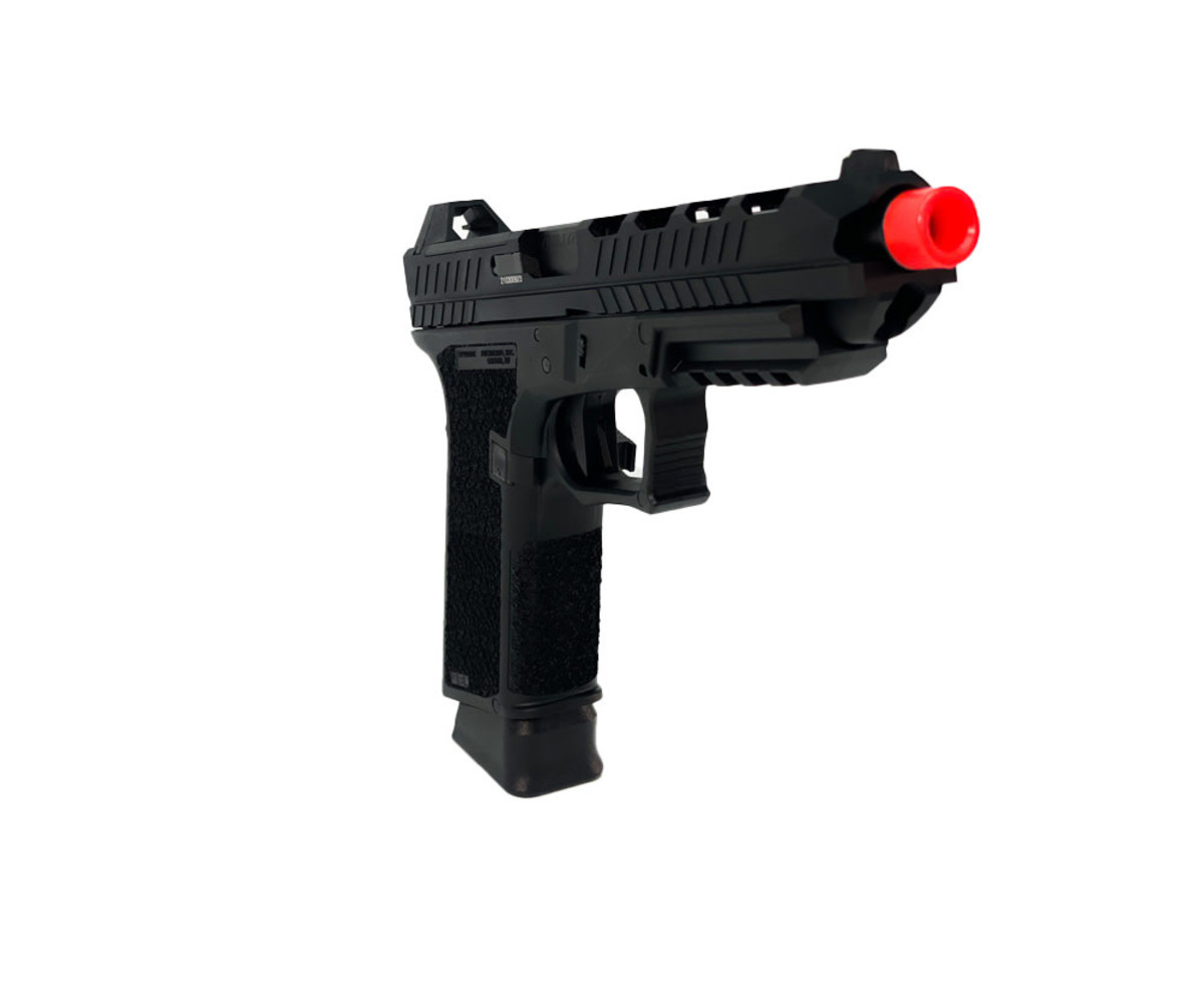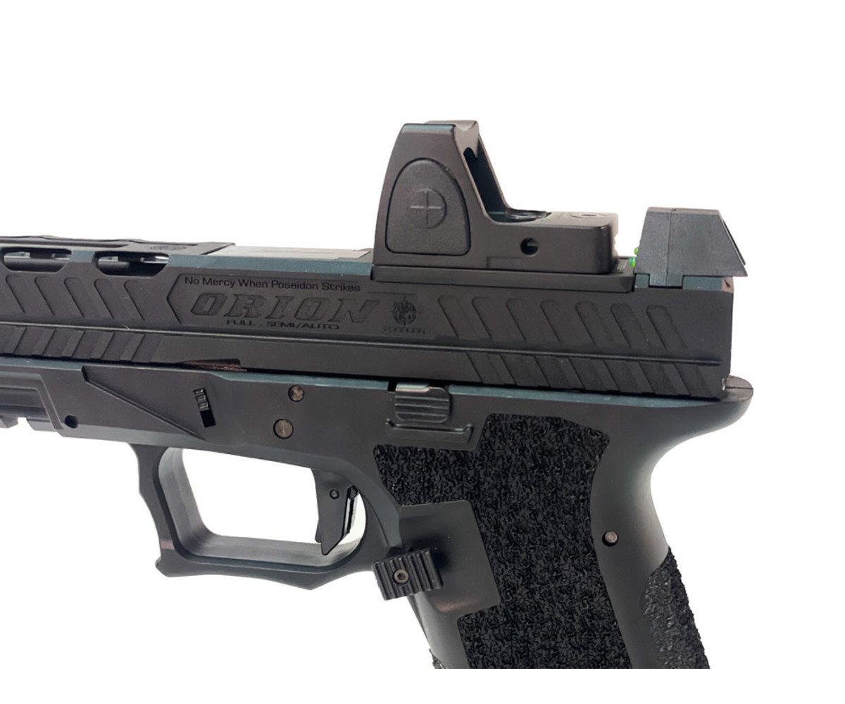 The Orion No. 3 Combat gas blowback pistols brings all the in-demand features of a gas blowback airsoft pistol into one attractive, affordable package. Poseidon started with a licensed Polymer P80 frame design that has been hugely popular in the real steel world. The polymer frame is strong, lightweight, and very comfortable to hold. It also has a four slot weaver rail under the dust cover, allowing you to mount any available lighting or aiming accessories. The CNC aluminum slide features many aesthetic and lightening cutouts for fast cycling, and is precut to accept a RMR mounting plate...a must have for all modern combat pistols. You can also select between full- and semi-auto with a switch behind the gas blowback housing. The pre-threaded barrel requires an adapter to fit 14mm counterclockwise silencers, but it is ready to accept most tracer units on the market (we highly recommend the Armin Nano or the Acetech Lighter R) that include an 11mm male clockwise adapter.
