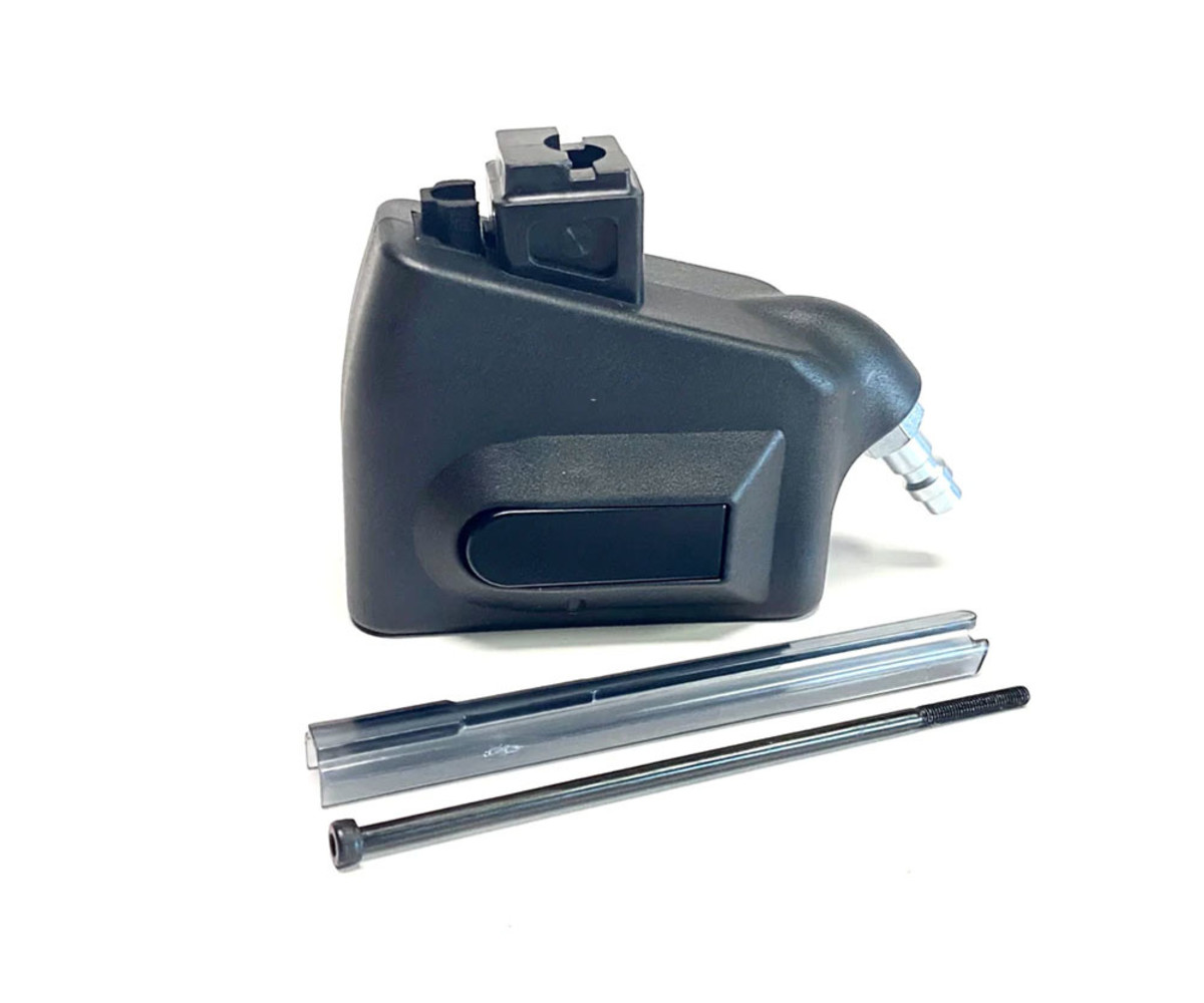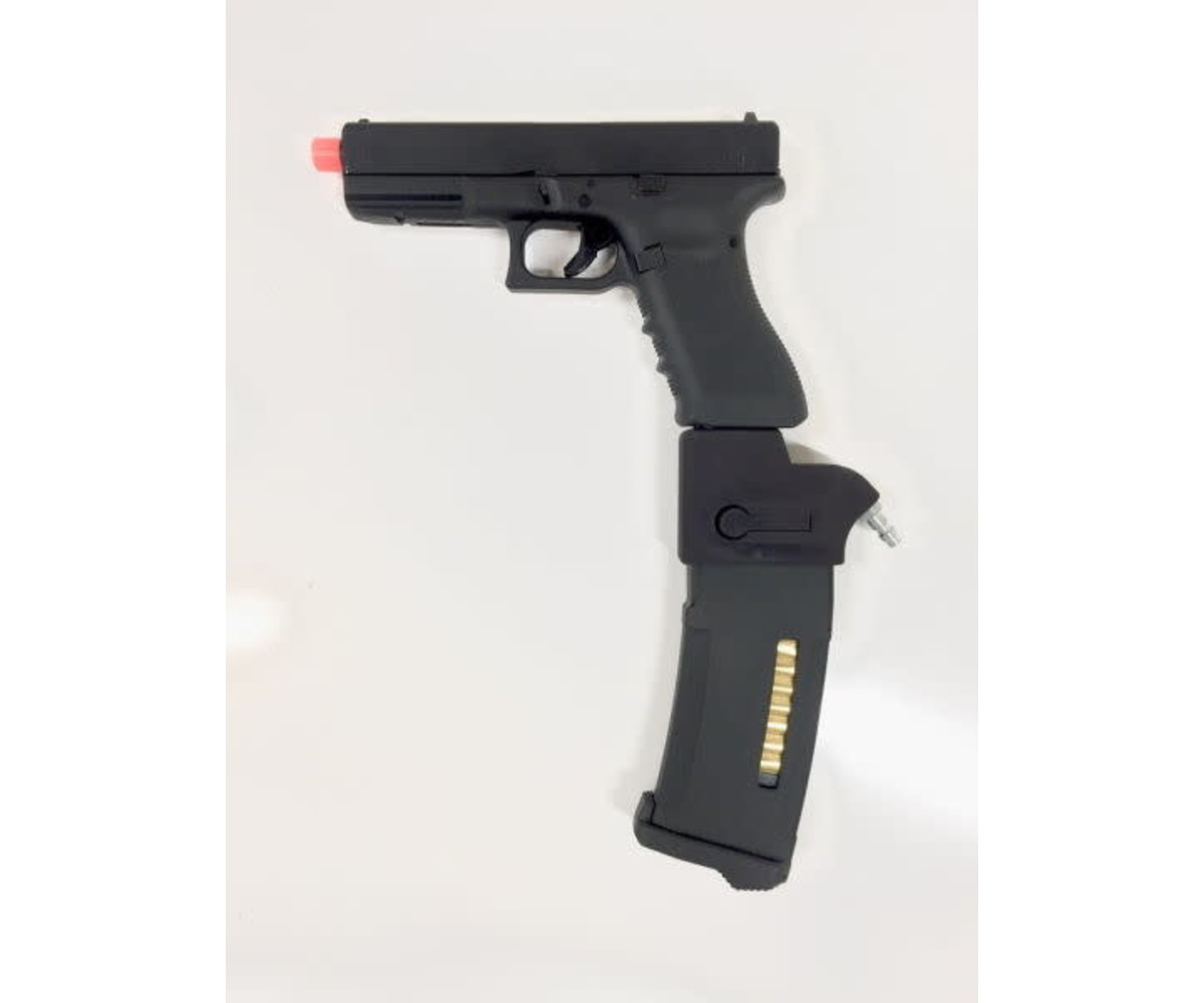 Want to convert your Glock to HPA? Tired of buying multiple gas magazines, CO2, and Green Gas? Want to go from an average of 25 rounds per magazine to an average of over 150? Then check out the Primary Airsoft GLOCK HPA / M4 Adapter. To use it you will also need an M4 AEG magazine, paintball tank with super low-pressure output (<300 psi), a tank regulator (0-140) psi, a hose with a Foster (Polarstar) quick disconnect, and of course bbs. The normal operating pressure for green gas is roughly 120 psi depending on the temperature. We recommend that you run your pistol near this pressure and do not exceed 140 psi. Keep in mind that higher pressures can cause excessive wear and damage to the internal components of your airsoft pistol.