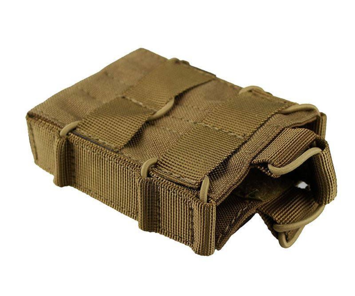 The UACO 5.56 Mag Pouch is MOLLE compatible and features an open-top design. The single stack system keeps it low profile, and holds mags in place by a bungee cord with a pull tab. No need to already every opponent in a 2-mile radius with the sounds of velcro ripping!