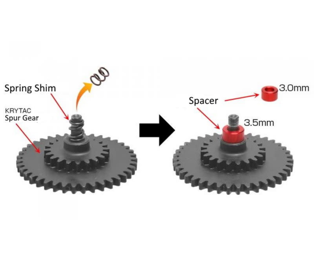 This part is meant to completely replace the spring self-shimming spacers in stock Krytacs and come in two sizes, both 3.0mm and 3.5mm for a variety of gear settings.