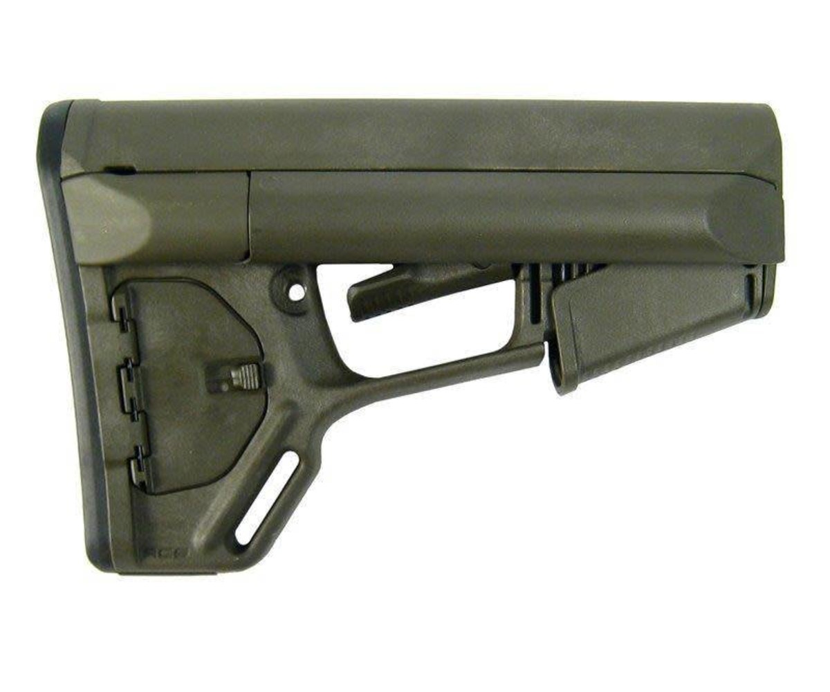 The patent-pending Magpul¬? ACS¬?? (Adaptable Carbine/Storage ¬? Military Model) is a drop-in replacement butt-stock for carbines using mil-spec receiver extension tubes. A streamlined, anti-snag profile shields the release latch to prevent accidental activation and the extra-power lock mechanism uses a premium chrome-silicon spring to avert auto-collapse failure by resisting spring relaxation. Similar to the CTR¬??, the ACS¬?? also features a supplemental friction lock system that eliminates wobble* for enhanced weapon stability and accuracy. Dual, rear accessible, water-resistant battery storage tubes and an integral storage compartment in the butt of the stock provides multiple storage options. The ACS¬?? comes standard with a rubber butt-pad which gives positive shoulder purchase to prevent slippage even with body armor or modular gear.