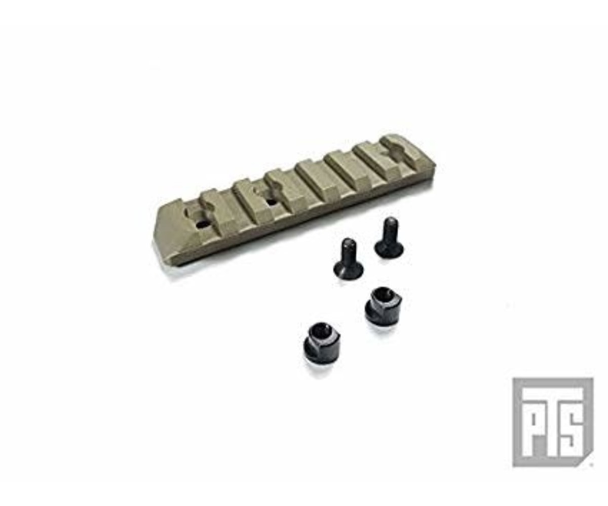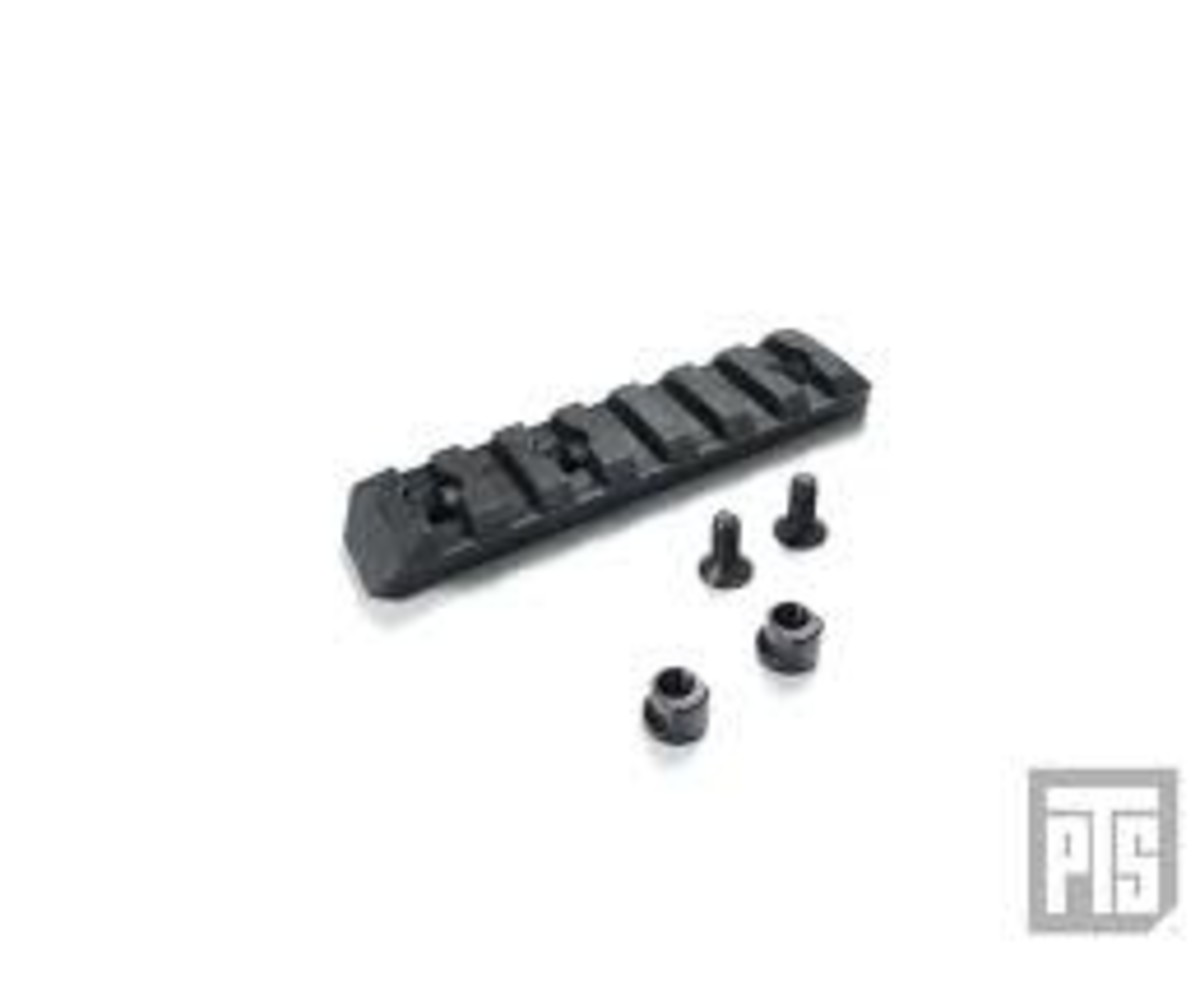The PTS enhanced keymod 7 slot rail is an adapter designed for keymod rail systems that need to be adapted to standard Picatinny/1913 rails. This adapter takes two slots of keymod and gives four slots of standard Picatinny, giving you the space you need for any multitude of attachments, foregrips, lights, or PEQs. This adapter is made of a sturdy reinforced polymer giving peace of mind, knowing that your attachments will make it through your day of play.