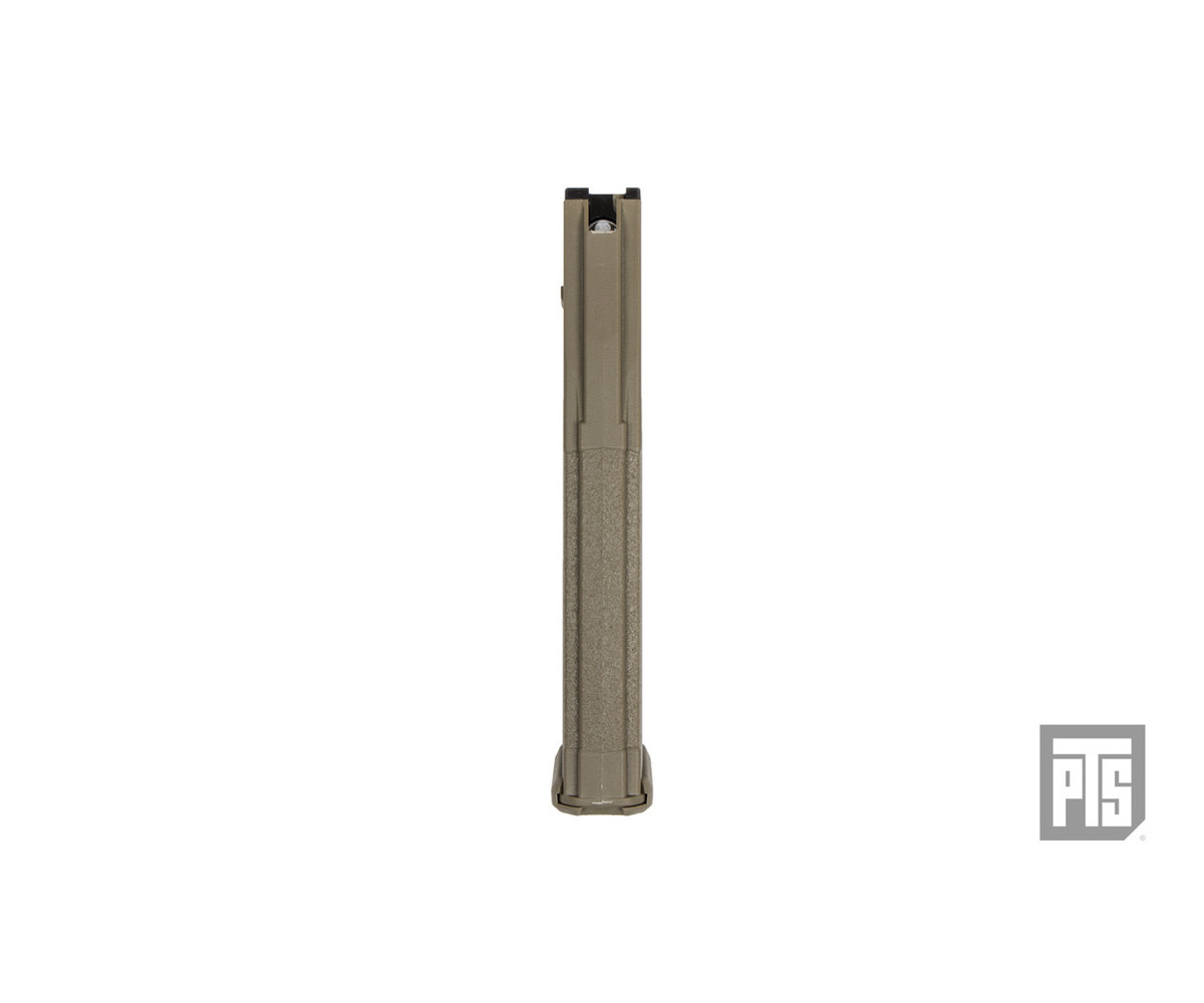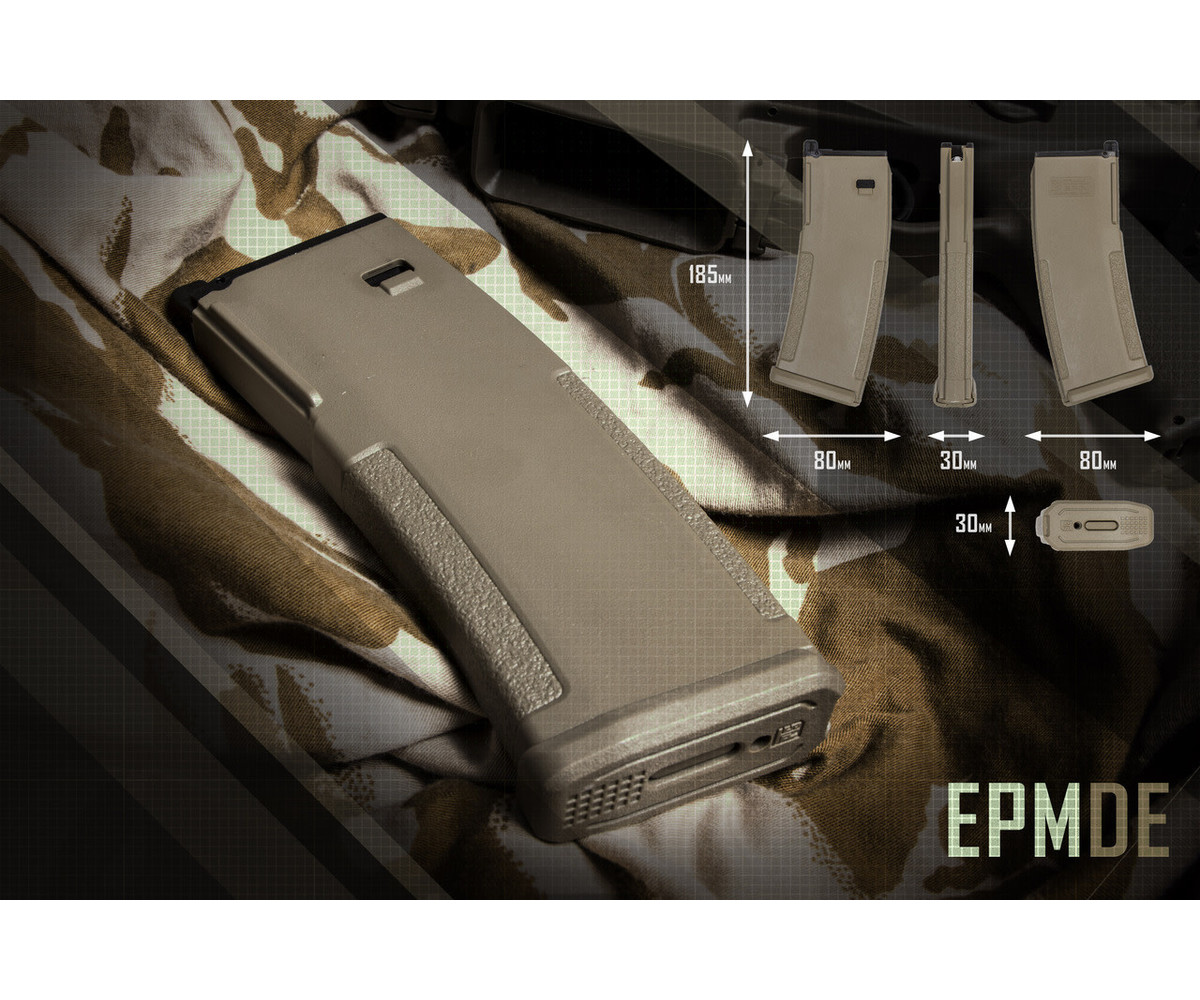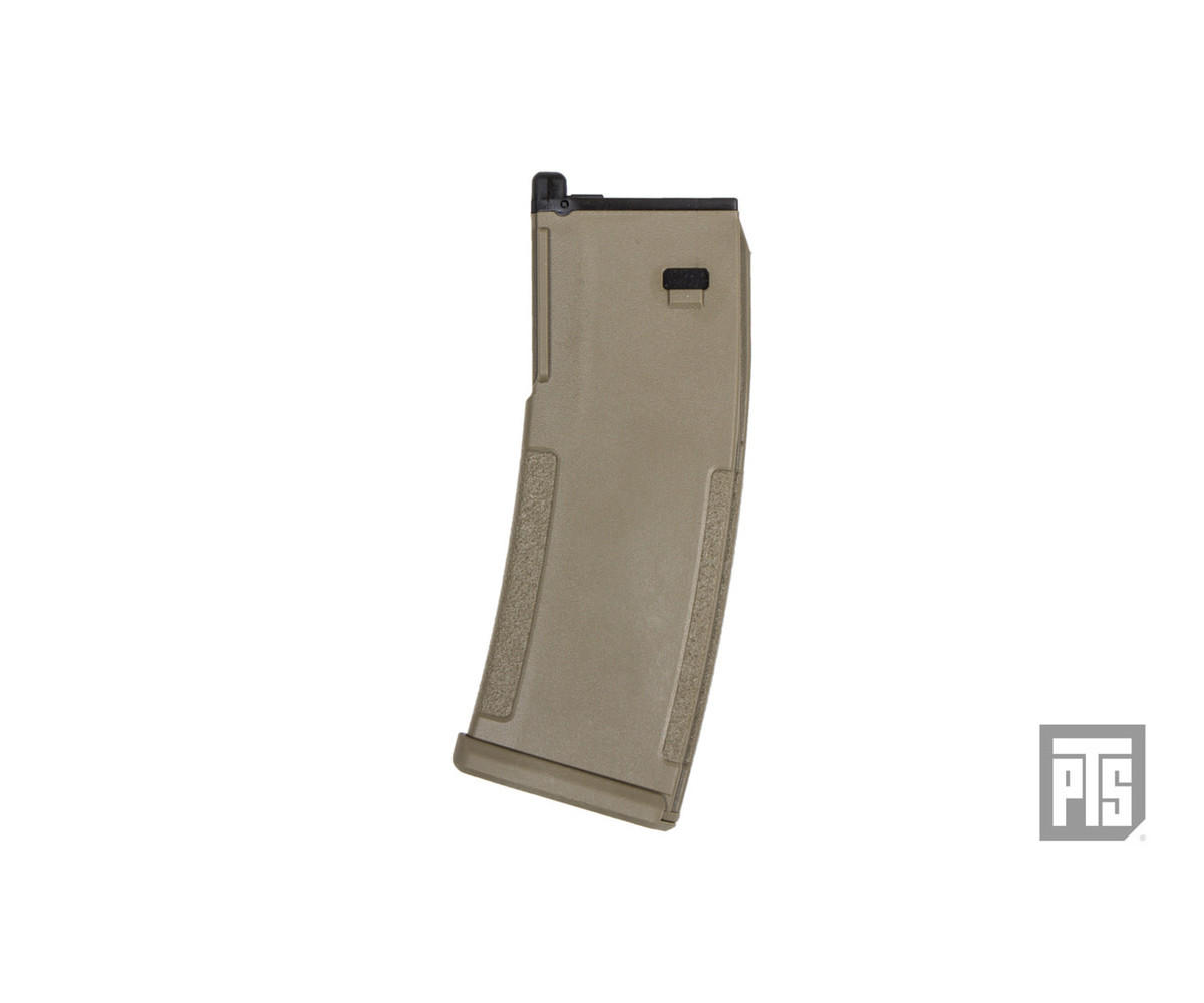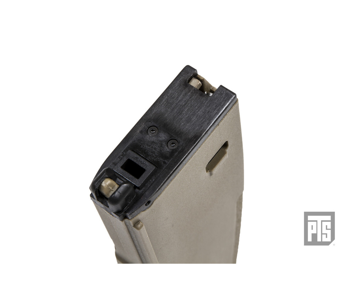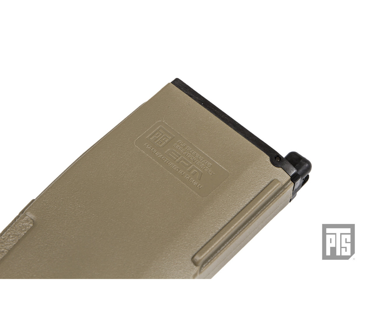The PTS Enhanced Polymer Magazine, or EPM for short, is a new type of Polymer Magazine for airsoft rifles. The EPM is a truly unique magazine, inside and out. Externally it features a polymer shell, with recessed panels for better grip, and unique magazine well guides that reduce snagging when the magazine is drawn from and reinserted into pouches. The front of the baseplate features a dot matrix which allows the user to mark the magazine with alphanumeric characters or pictograms for identification.