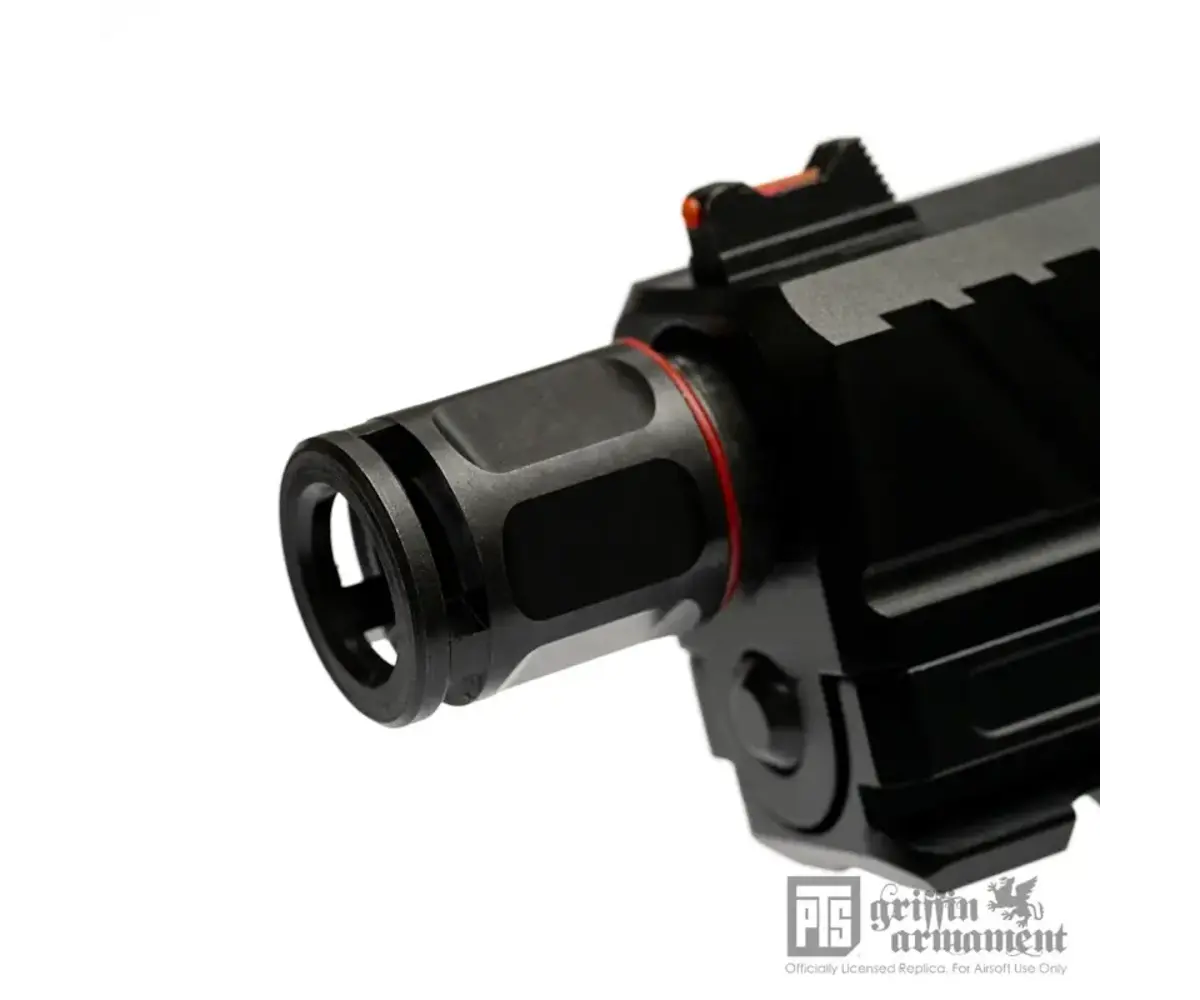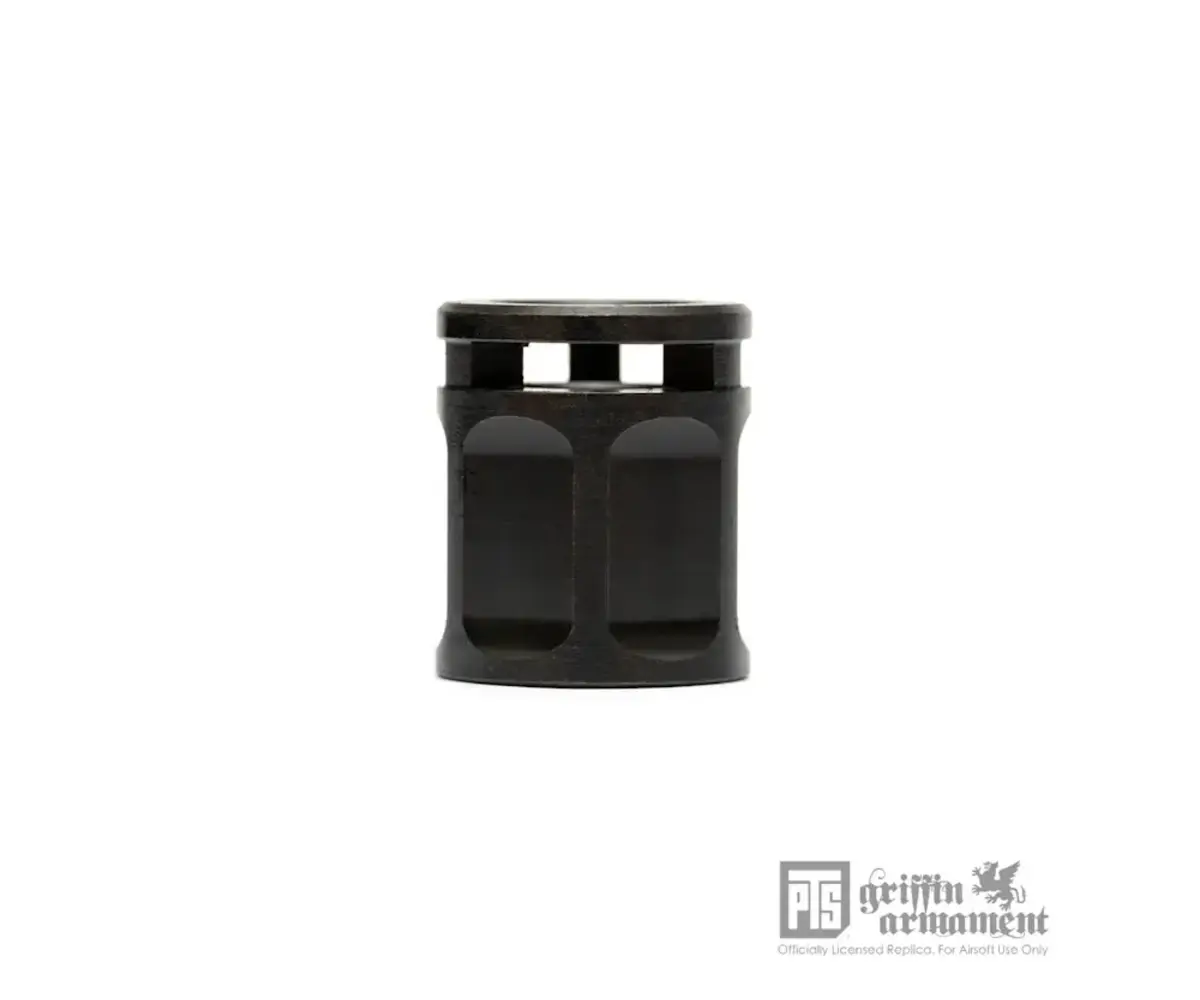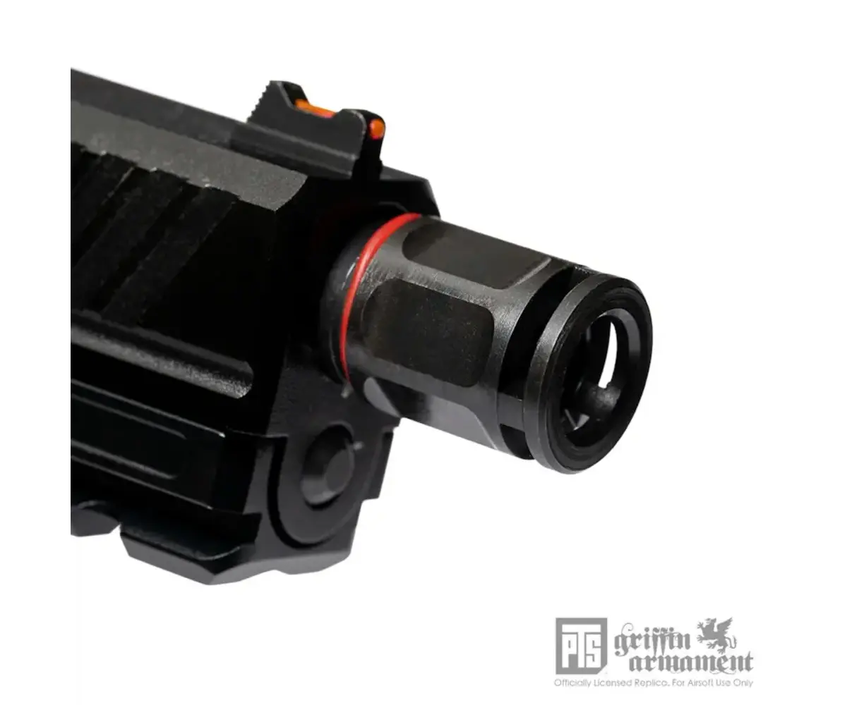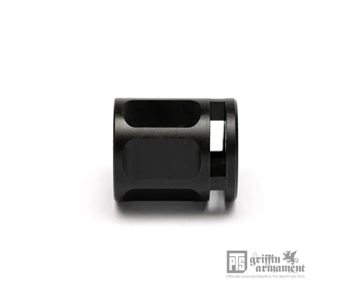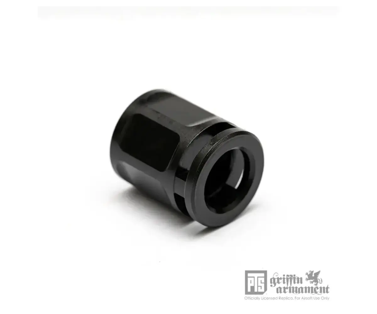 Overview: The PTS Griffin Armament Micro Carry Comp is a compact, low-profile pistol compensator that also functions as a 14mm CCW thread protector for airsoft threaded barrels. Designed to keep your build streamlined, its short overall length helps maintain compatibility with many standard holsters while still providing a finished look at the muzzle. Constructed from steel with a QPQ finish, it’s built for durability and improved corrosion resistance in high-use setups. This is a licensed Griffin Armament replica for airsoft use.