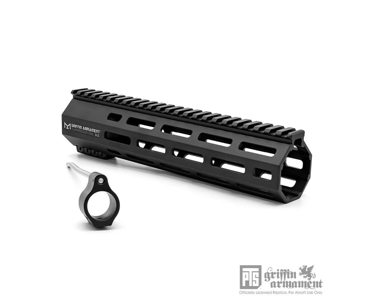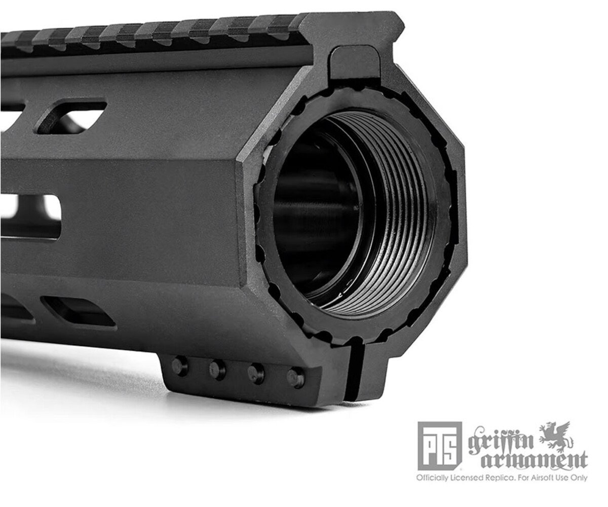 The PTS Griffin Armament® SR M-LOK Rail is engineered for airsoft players who demand both style and performance. Fully licensed by Griffin Armament, this rail system doesn’t just look the part — it’s built to accommodate up to a 1.5" diameter airsoft suppressor within its sleek, octagonal design. Whether you're building a custom loadout or upgrading your favorite rifle, this rail is designed to help you stand out and perform at your best. Crafted from tough 6000 series aluminum and finished in a clean black anodized coat, this rail is built to handle the abuse of both the speedsoft field and milsim environment. The custom extrusion reduces flex and provides superior rigidity for laser aimers, grips, and tactical accessories. No more worrying about POI shift when torque is applied. With its user-friendly clamp-style slip-fit installation, this is an upgrade that’s as easy to install as it is satisfying to shoot with. With seven M-LOK interface flats and a continuous Picatinny top rail, this handguard is a dream come true for players who want complete customization and reliability. Whether you're mounting lights, foregrips, or laser systems, the PTS Griffin SR M-LOK rail has you covered.