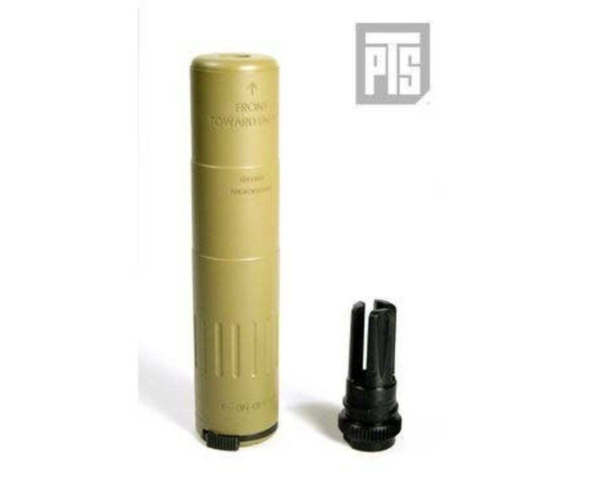The PTS MK18 Quick Detach mock suppressor is a faithful replica of a similar silencer that is issued to the US Navy SEALs and the other US and international Special Operations Units. Its compact size allows for uncompromised maneuverability without sacrificing its effectiveness. The PTS MK18 QD mock suppressor can be rapidly attached and detached from a rifle in a combat environment via a unique locking ratchet system when used with the proprietary PTS 51T flash hider (included).