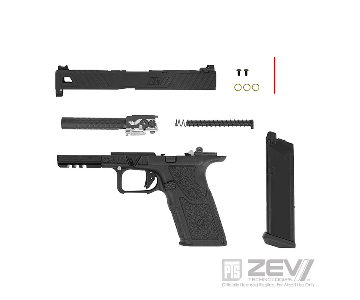 The PTS ZEV Technologies OZ9 Elite GBB pistol is the pinnacle of airsoft sidearms, faithfully replicating the appearance and innovative features of the real Zev Technologies OZ9 pistol. With only a limited quantity released worldwide, the Ultra Version of this pistol boasts exclusive features, making it a must-have for airsoft enthusiasts. Crafted with precision, it features a CNC'ed 6000 series aluminum slide with lightening cuts and front and rear serrations, ensuring both a distinctive look and enhanced functionality. The CNC'ed steel alloy dimpled outer barrel comes with an extremely durable carburizing finish, promising long-lasting performance. The modular chassis system accommodates the ZEV Flat Face Trigger, sear, and receiver rails, extending along the entire length of the gun for rigidity, smooth slide travel, and the attachment of various accessories. This polymer grip includes an integrated magwell, providing a more natural pointability with its steeper grip angle. The ergonomic trigger pad, reversible mag release button, and ZEV Combat Sights, including a high-visibility fiber optic front sight, enhance your shooting experience. The included magazine features the PTS Enhanced Pistol Shockplate G and is compatible with Tokyo Marui G17 (Gen 3 & 4) magazines.