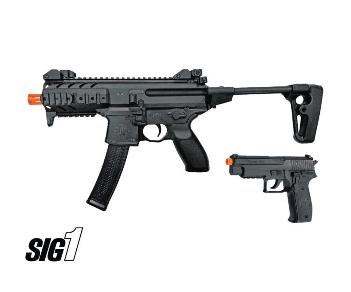 This combo pack equips the player with a compact SIG1 MPX shooting at 300 fps out of the box. Included is the SIG P226 pistol with its sturdy build shooting at 270 fps. The whole package is affordable giving you two guns made out of durable polymer construction with strong springs to sail the BBs up to 75ft.