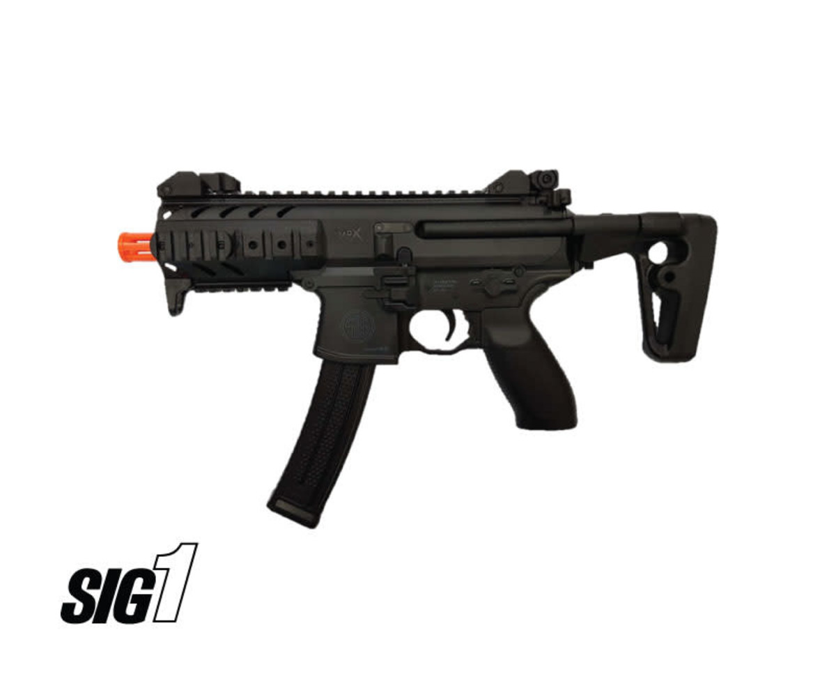 The SIG MPX is one of the newest and best-looking submachine guns on the market. Now available in a springer format. The gun is all-polymer construction and a single shot. Pull the charging handle to load and cock the gun. The stock is adjustable with 3 different positions, and removable so it can be used as an oversized pistol.