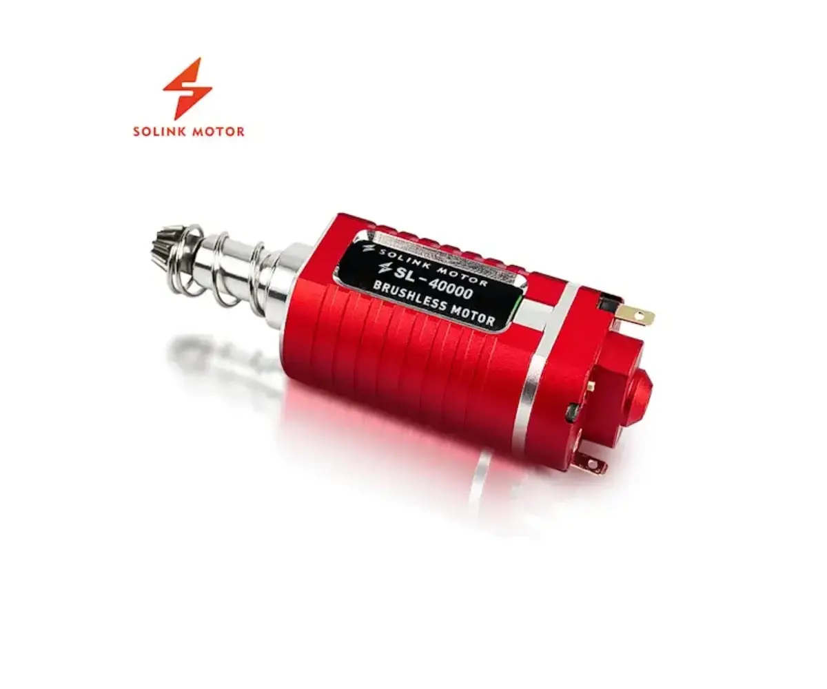 The Solink Pro Plus Brushless AEG Motor is an upgraded airsoft brushless motor designed for high-performance AEG builds requiring efficient power delivery and advanced drivetrain control. Available in 34K and 40K RPM versions with long or short shaft configurations, this motor builds upon the previous Solink Professional series with an updated red housing and a unidirectional bearing shaft system. Designed for serious builders and technicians, this high performance AEG motor offers brushless efficiency, selectable speed modes, and a drivetrain design that eliminates the need for a traditional anti-reversal latch.