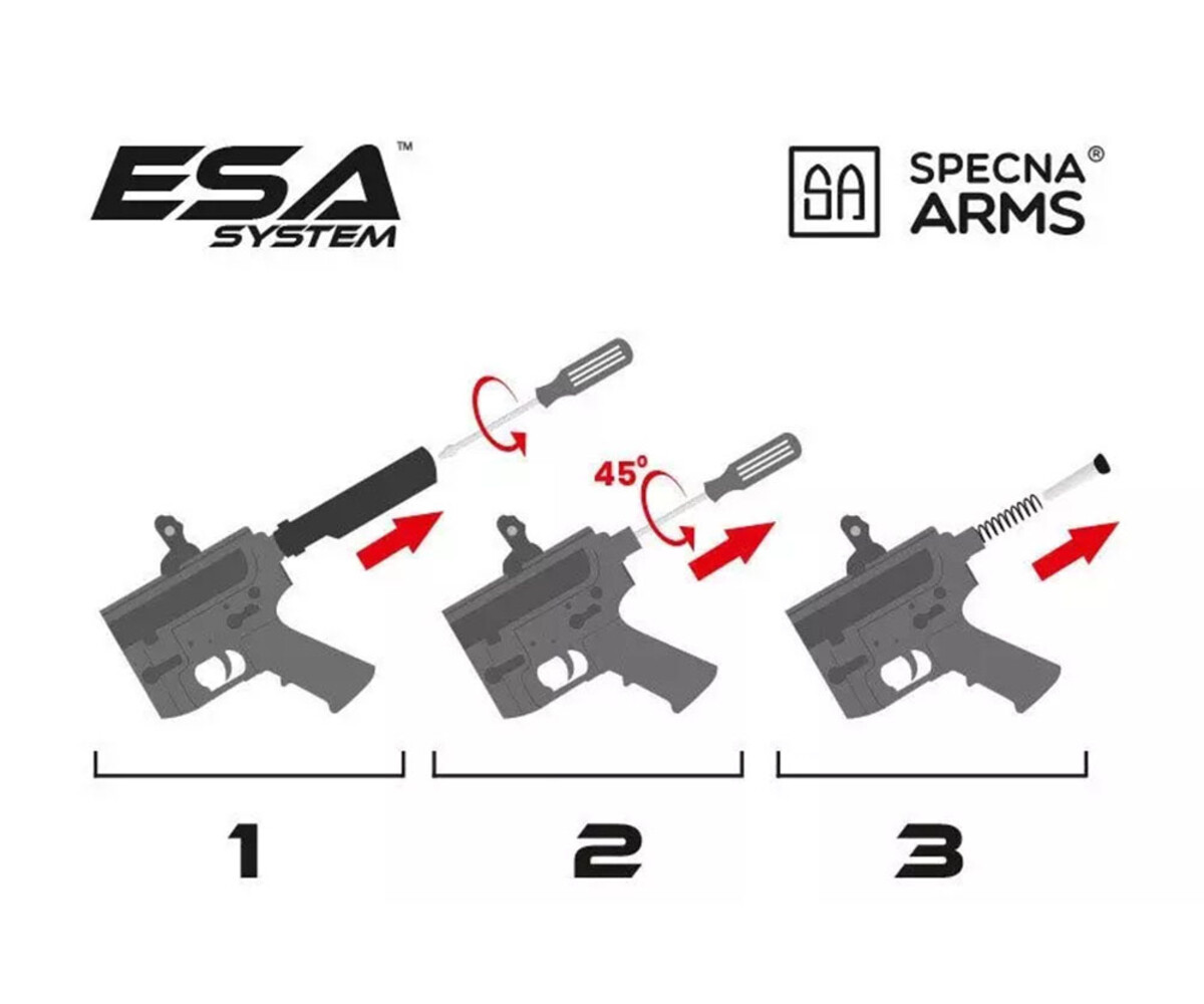 Inside the SA-E01, you'll find the factory-fitted MOSFET X-ASR module by Polish GATE, ensuring improved trigger reaction, extended electronics and battery life, and integrated status diodes for easy diagnostics. The internal precision barrel with 6.03 mm diameter ensures high accuracy and consistency in shots, working in tandem with the new Hop-Up rotary chamber for precise BB spin adjustment. What sets this replica apart is the ESA™ Quick Spring Exchange System, enabling rapid adaptation of power for different playing conditions, without the need for specialized tools.