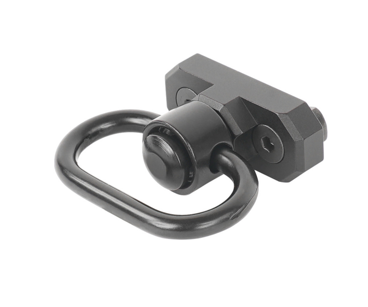 The QD M-LOK Sling Mount can be installed on any industry-standard QD swivel socket. This QD sling mount is rated to secure both two-point and one-point sling systems, and features steel construction for increased durability. To use this QD mount, firmly grasp the body of the mount and depress the top button with a thumb or forefinger while inserting it into the socket. To remove the QD mount, depress the button while simultaneously pulling outward on the swivel ring.