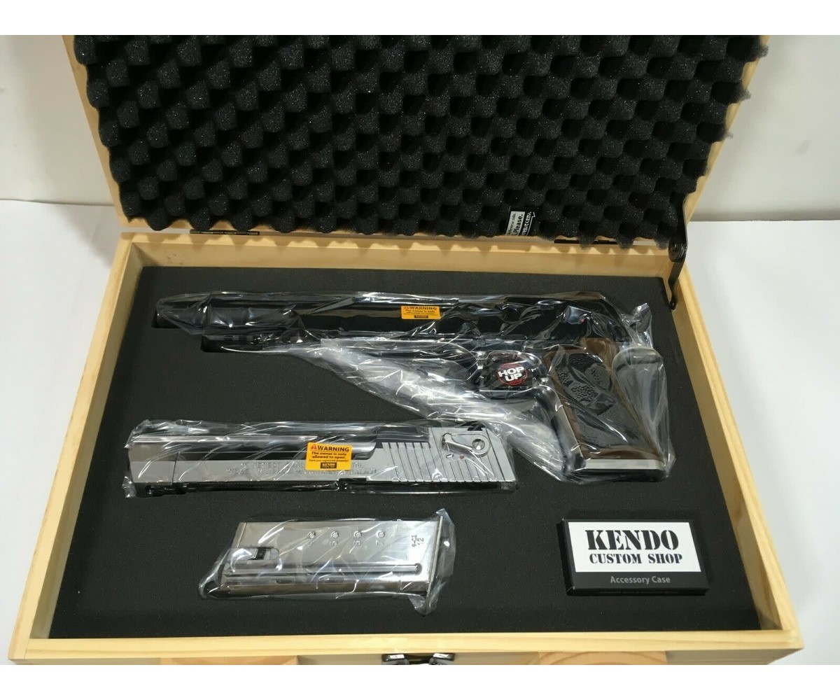 We have zero pieces of this Biohazard RE 2 (Resident Evil) licensed modelS from Tokyo Marui. It is based on their silver Desert Eagle platform and comes in a presentation case made to resemble a wood crate. Inside, there are TWO slides for the silver DE frame: