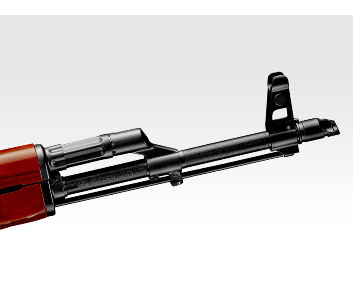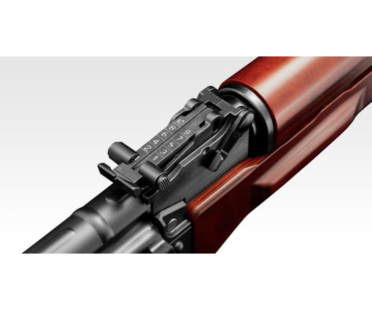 One of the unique features of this rifle is the realistic movable gimmick, which faithfully reproduces the same functions as the real AKM. You can load the first bullet by operating the bolt handle and stop the bolt forward when the bullet runs out, just like with the real thing. The front sight can be adjusted up, down, left, and right with a dedicated adjust tool, and the rear sight can be adjusted up and down by simply changing the position of the slide bar to lift the plate-shaped sight body. In addition, the rifle is compatible with various muzzle options, allowing you to customize your setup as desired.