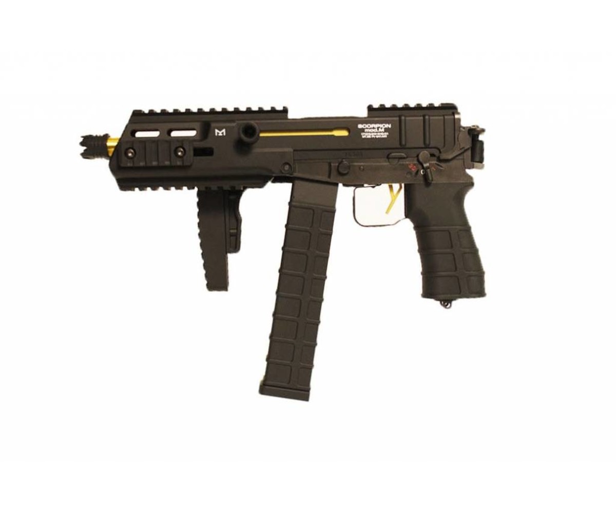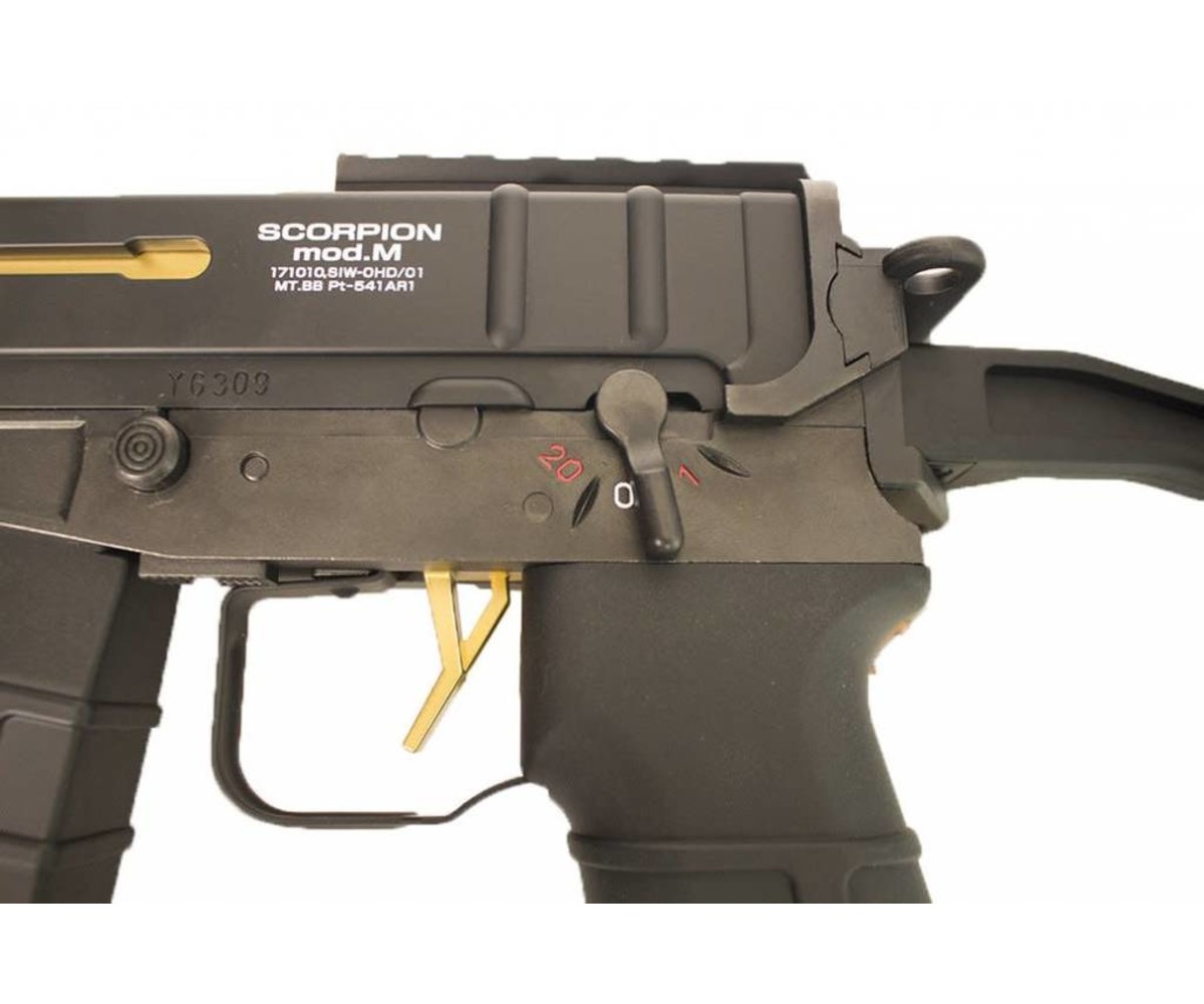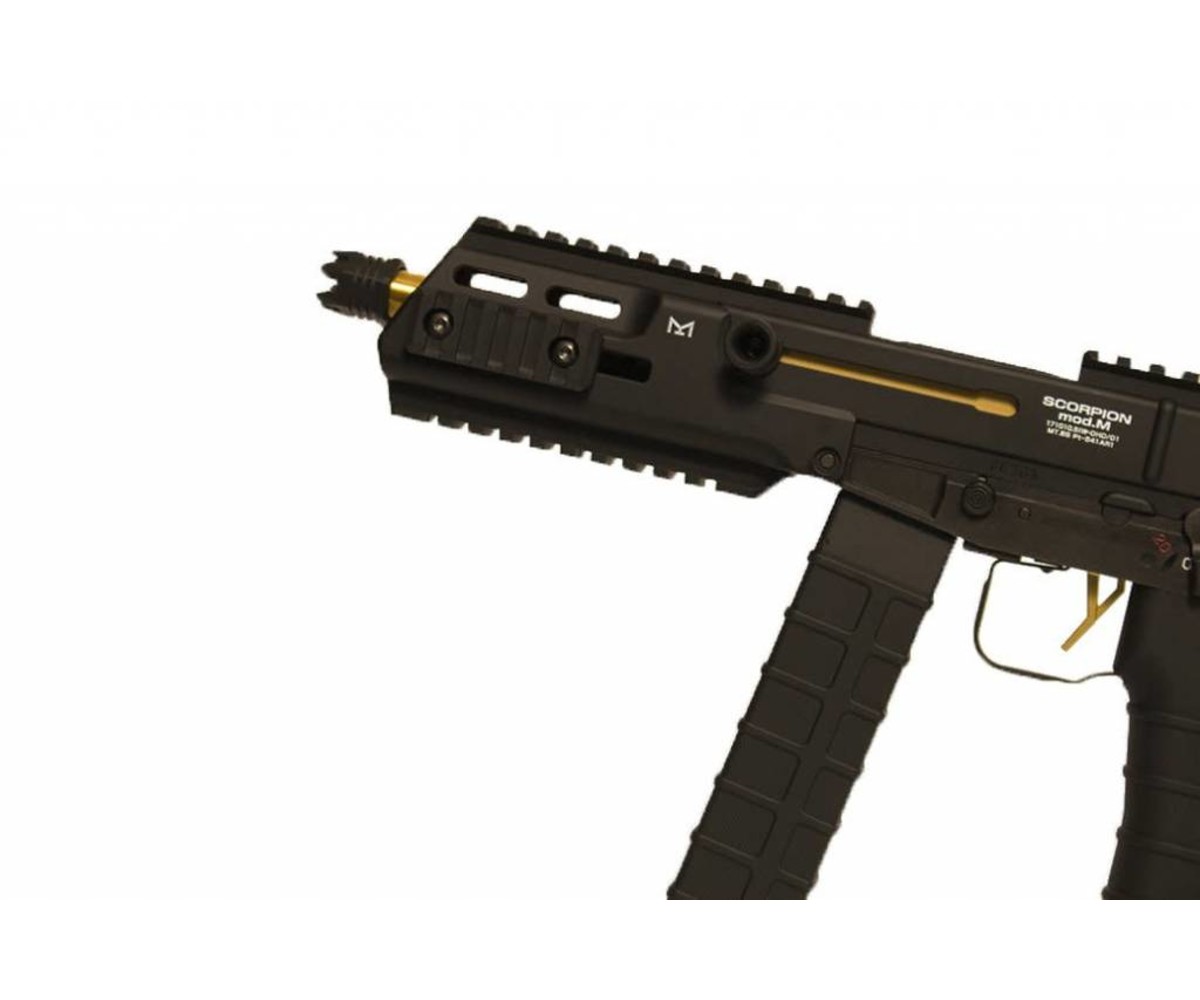 The Tokyo Marui Scorpion MOD-M takes the design of their older KZ Scorpion and revamps the externals by switching the handguard area to M-Lok and putting Picatinny rails on top of the gun with a side folding stock to finish up the changes. The Scorpion Mod-M is also able to use other Tokyo Marui Scorpion spec magazines so the player has more options to choose from. The gun is also decorated with gold accents to spice up the overall look of the gun. They also included a crown-shaped flash hider to replace your orange tip. Designed as a small compact SMG the Tokyo Marui Scorpion MOD-M brings a twist of fun for all those who wield it.