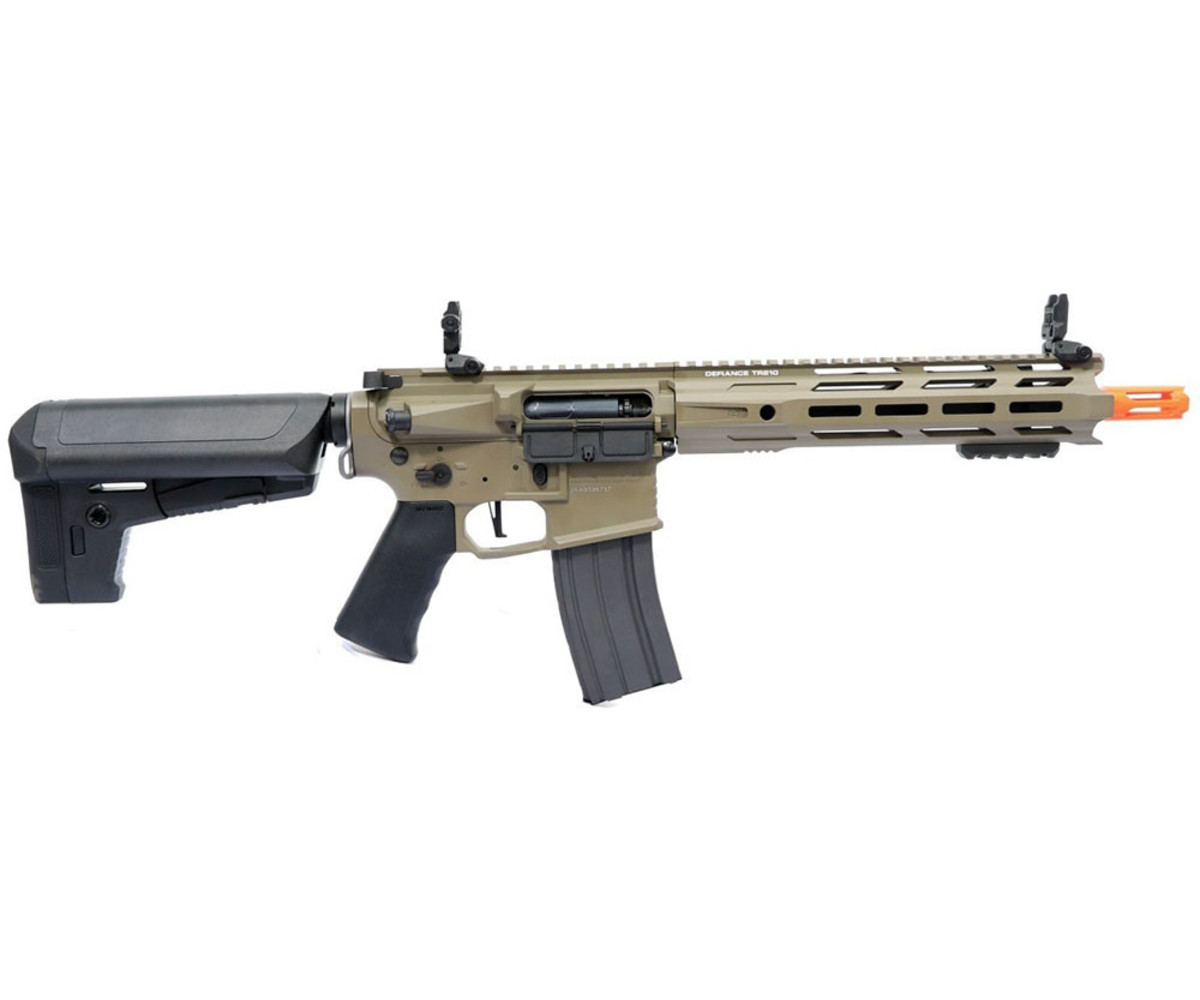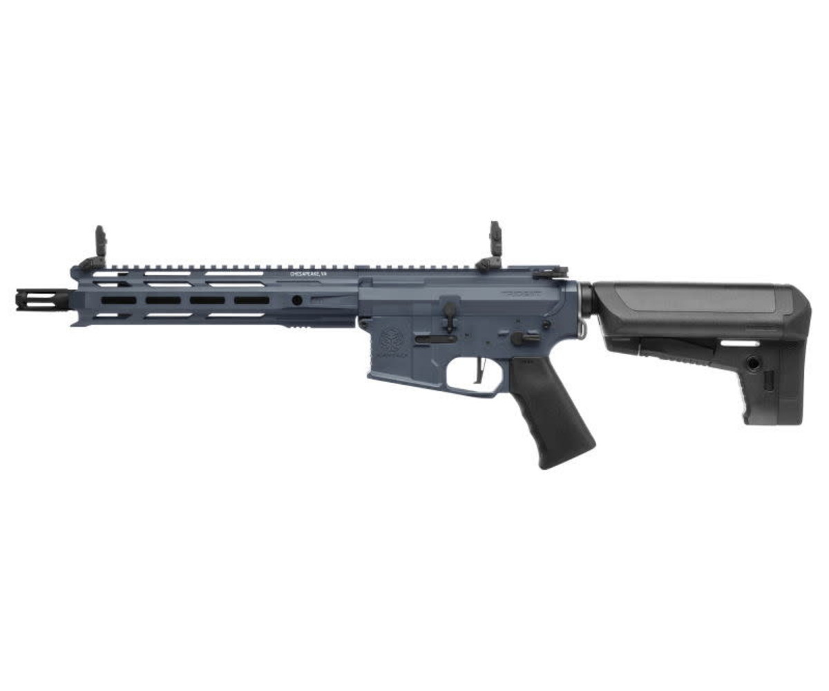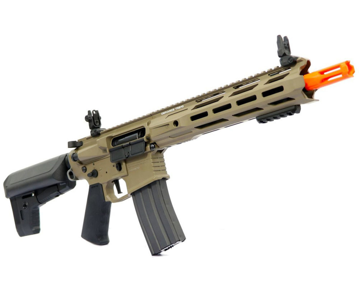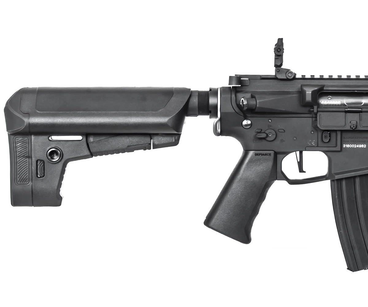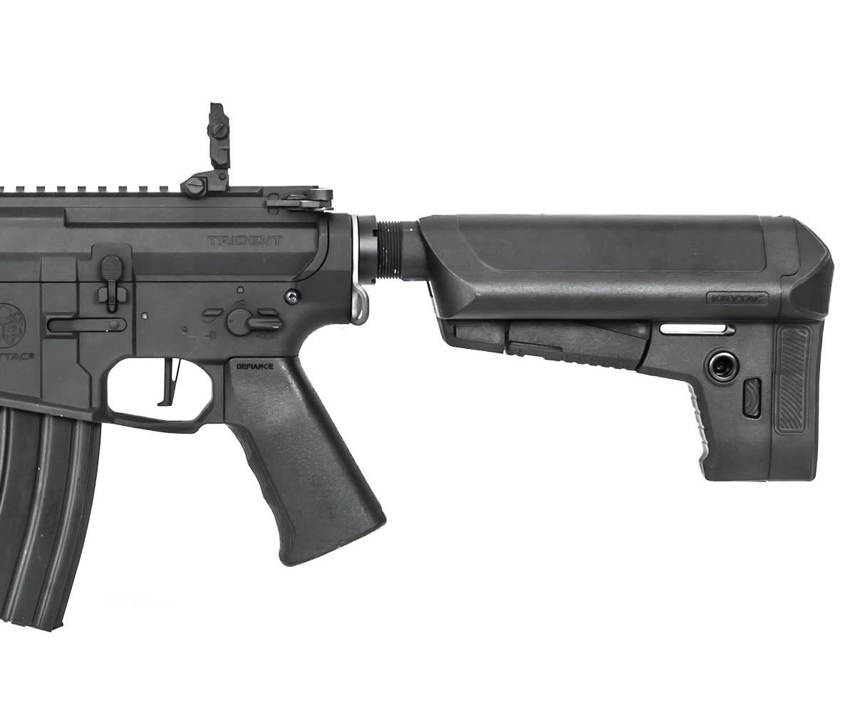 The most notable change the Trident MK2-M CRB Sports is Krytact's new Billet style receiver and Defiance licensed TR210 M-Lok rail system. The receiver provides a sleek modern look while sporting an enlarged trigger guard for gloved hands and a flared mag-well for smooth and fast reloads, while the TR210 M-Lok rail system gives plenty of room for any attachment without adding any extra weight. the continuous rail on top provides space for all types of optics. Rounding out the AEG is the Defiance licensed pistol grip, comfortably contoured for those long days, a 6 position stock capable sporting ample room for several types of batteries, and low profile set of flip-up backup iron sights