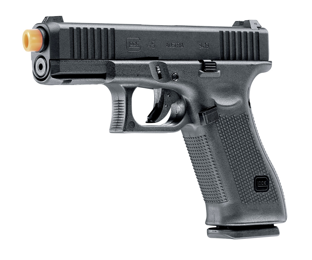 G19X meets Gen5 – the GLOCK 45 is the black version of a crossover pistol that combines the full-sized frame of the G17 with the compact slide of the G19. The front serrations on the slide and enhanced grip make this a typical Gen5 pistol. The G45, a gas-powered airsoft version with a maximum energy of 1 joule, features a Shoot-Up that is adjustable from the outside, a powerful blowback and a heavy metal slide. With its Weaver rail for tactical accessories and ambidextrous slide stop lever this is an ideal backup gun.