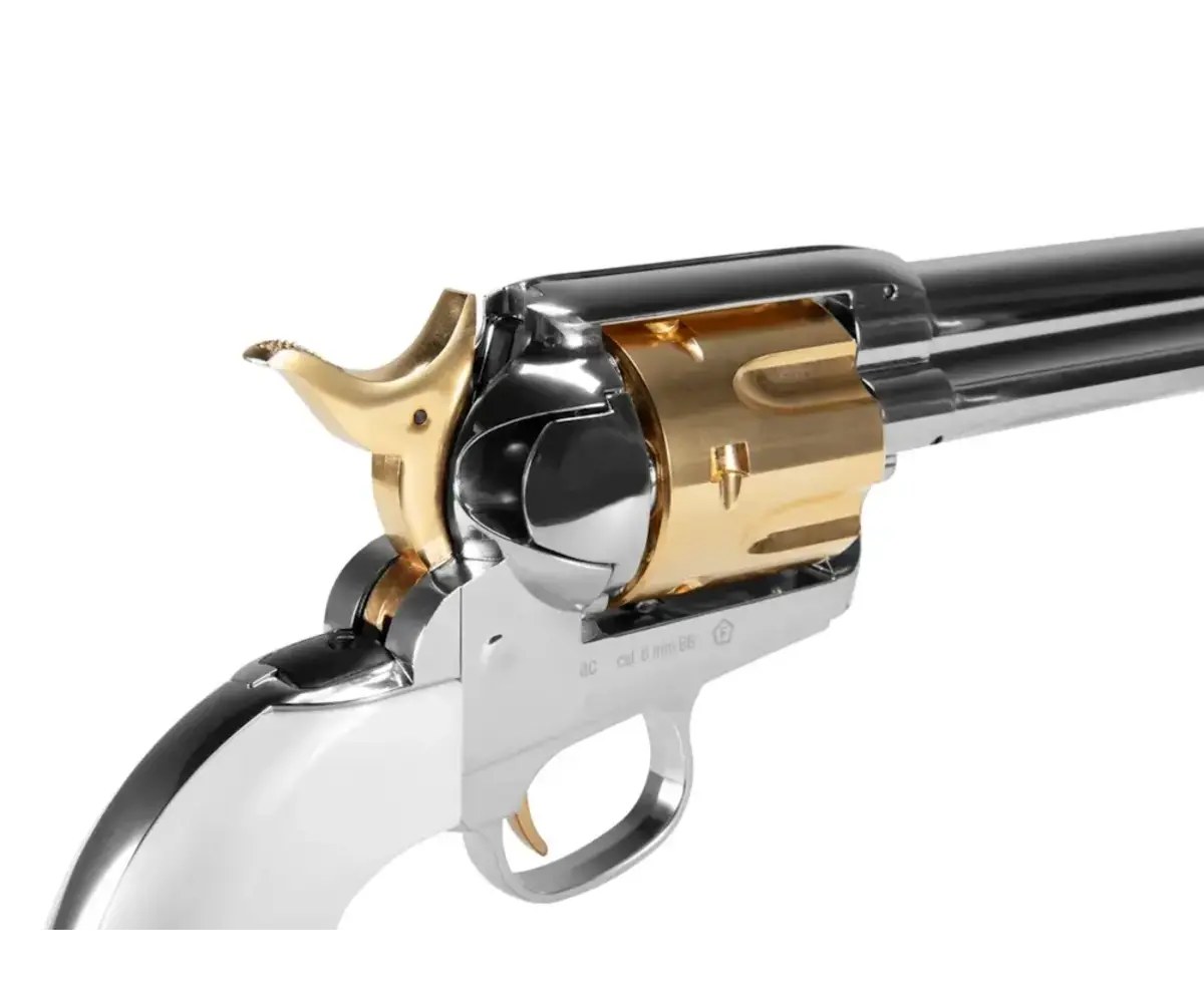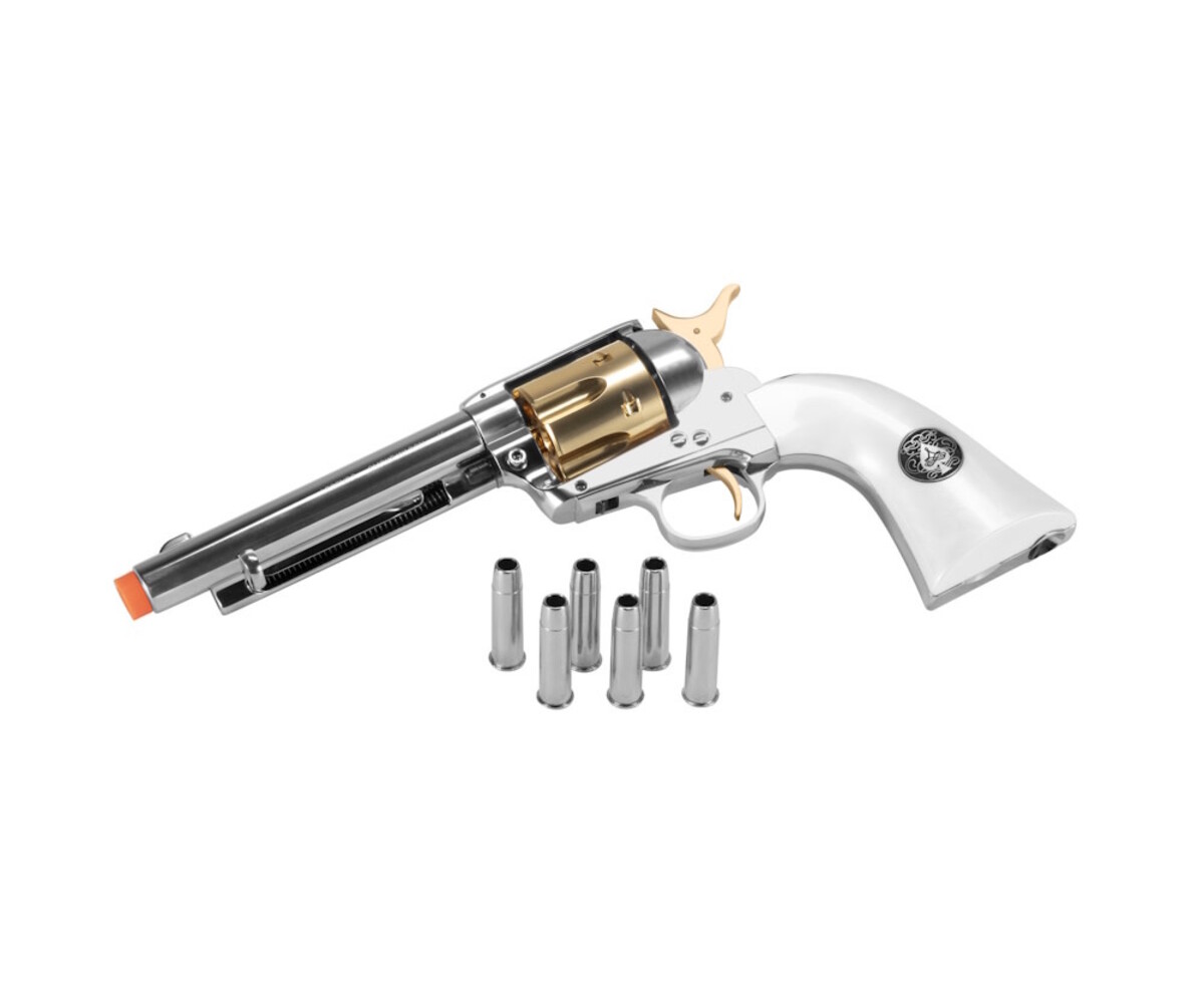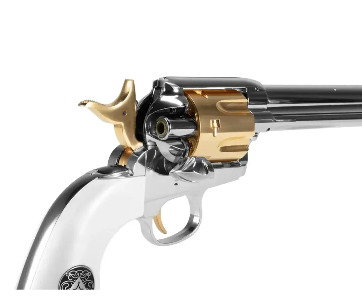 Get ready to step into the shoes of an old West gunslinger with the Umarex Elite Force Legends Smokewagon 6-Shot CO2 Revolver. This Limited Edition boasts a strikingly unique design featuring a gold-colored cylinder, hammer, and trigger, paired with an elegant ivory white pistol grip. Feel like a cowboy on the field with this true-to-life, 1:1 replica of the classic old western revolver, well-known from countless movies, books, and games.