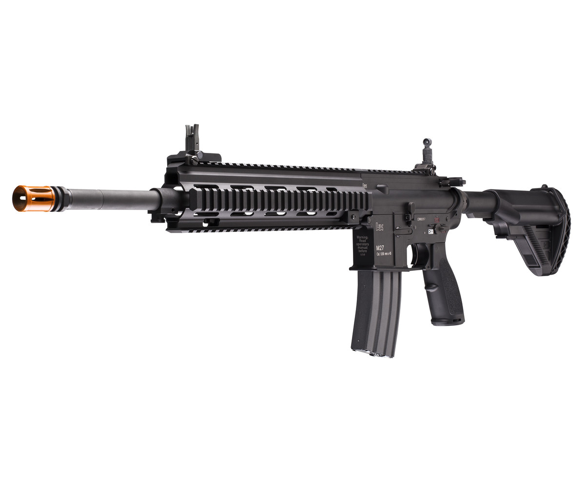 - Fully licensed H&K trademarks and realistic M27 lever on the charging handle